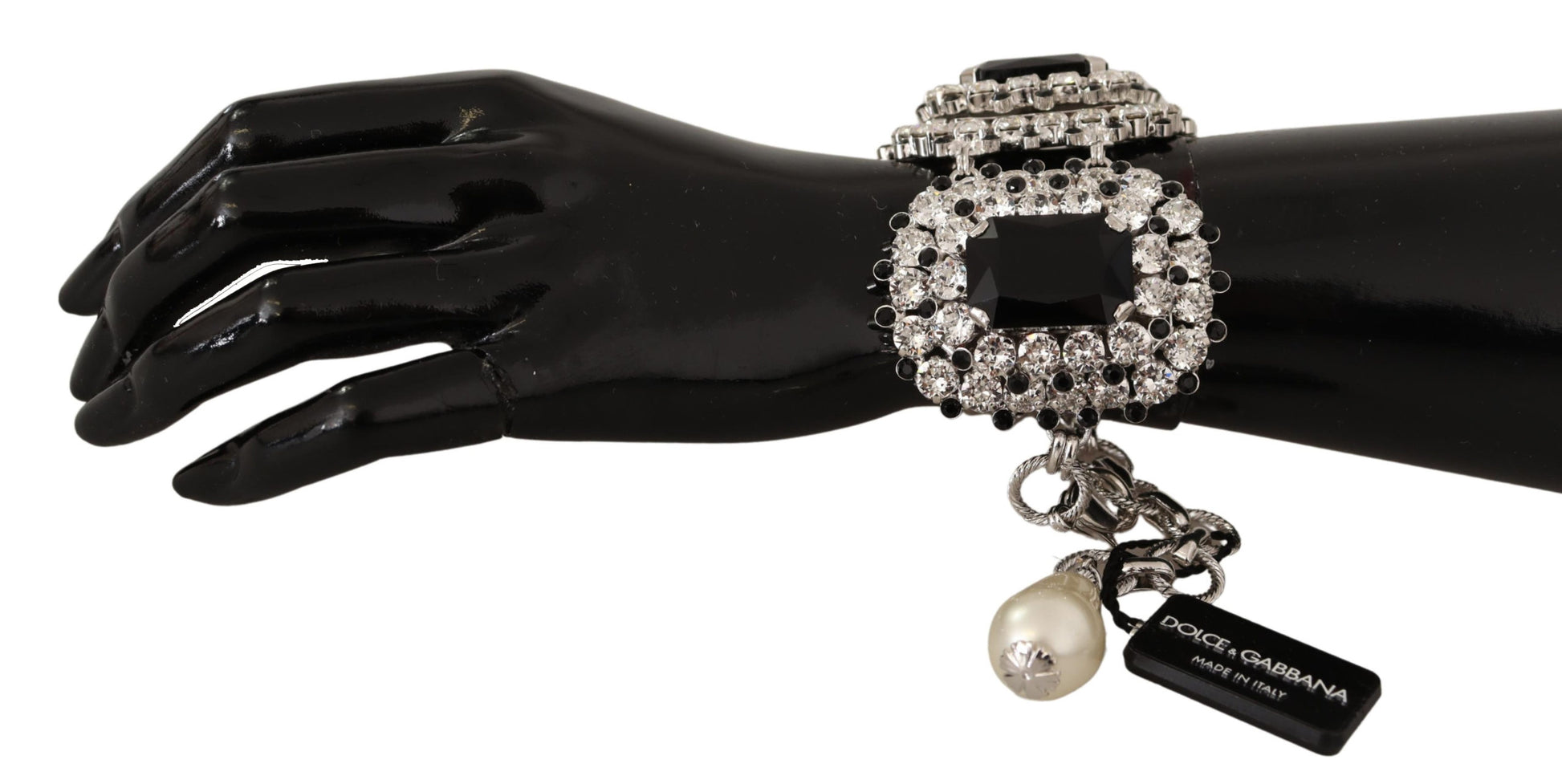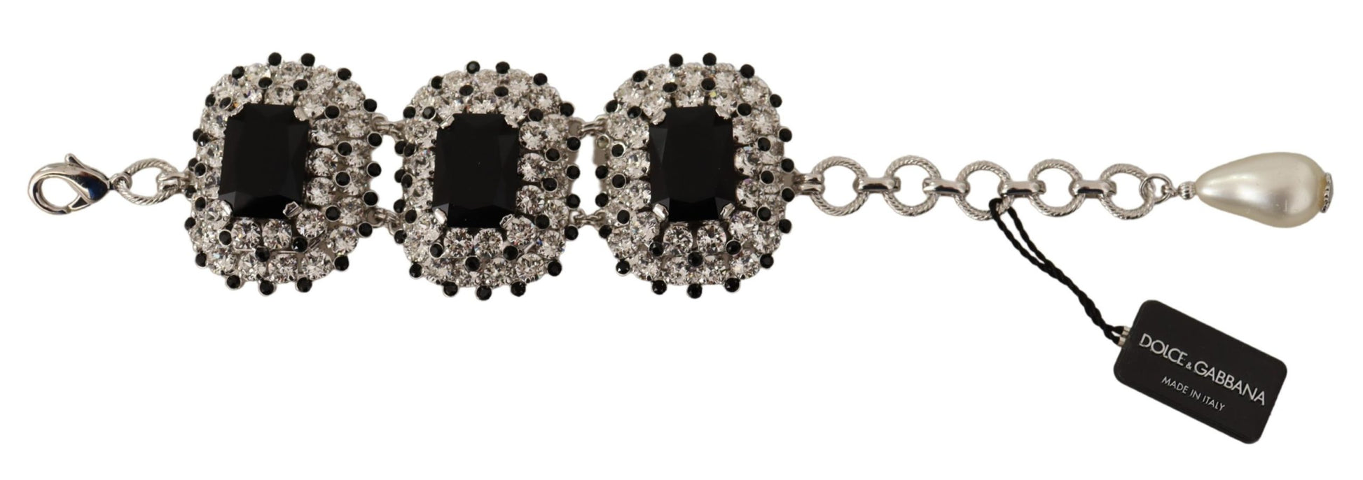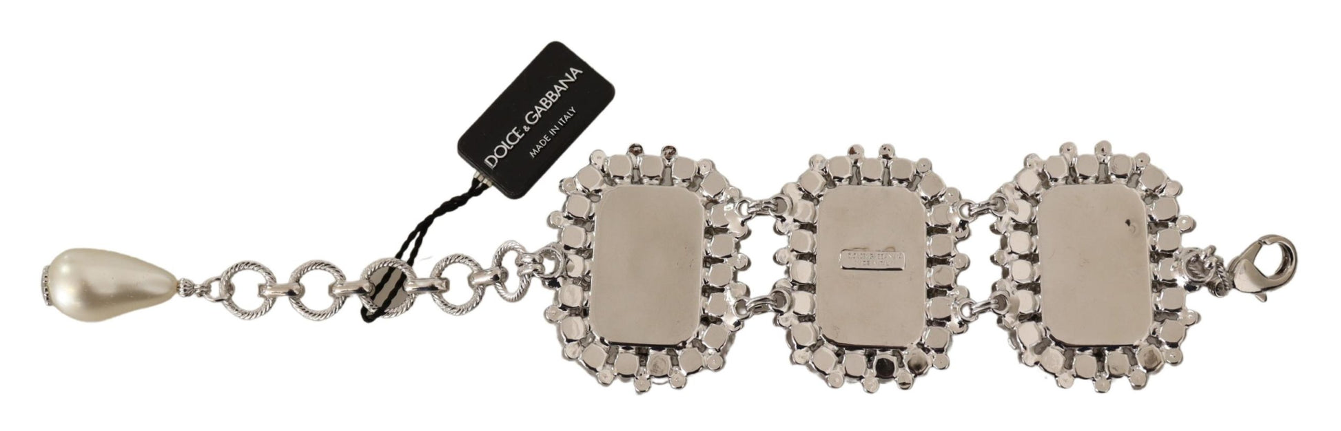 Indulge in the opulence of Dolce & Gabbana ‘s exquisite bracelet, beautifully adorned with sparkling crystal decorations. This statement piece exemplifies luxury, crafted from lustrous silver-tone brass that promises enduring shine. Its adjustable chain bracelet design ensures a perfect fit as it dangles gracefully on the wrist, making it an ideal accessory for any woman seeking an elegant touch to her ensemble.