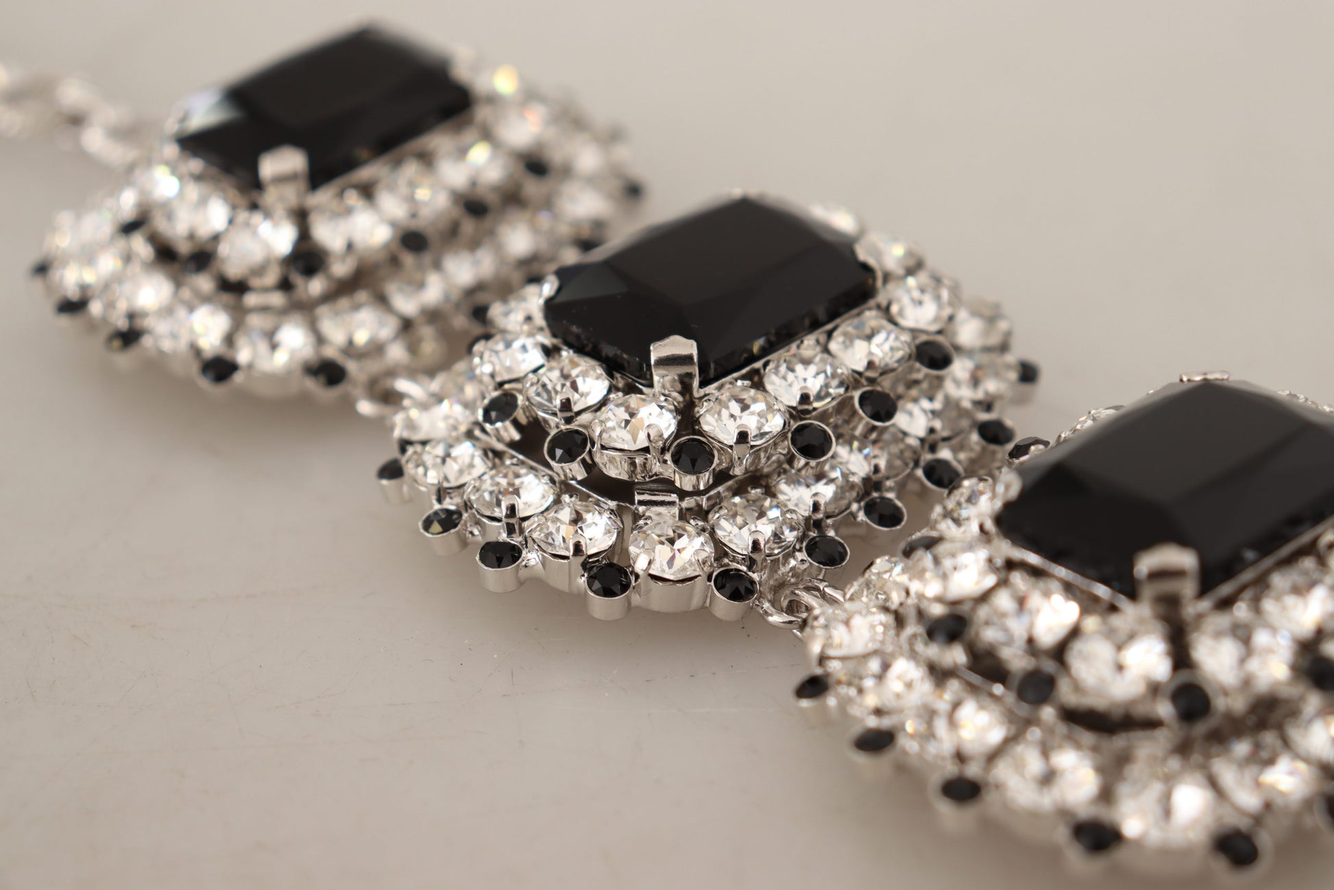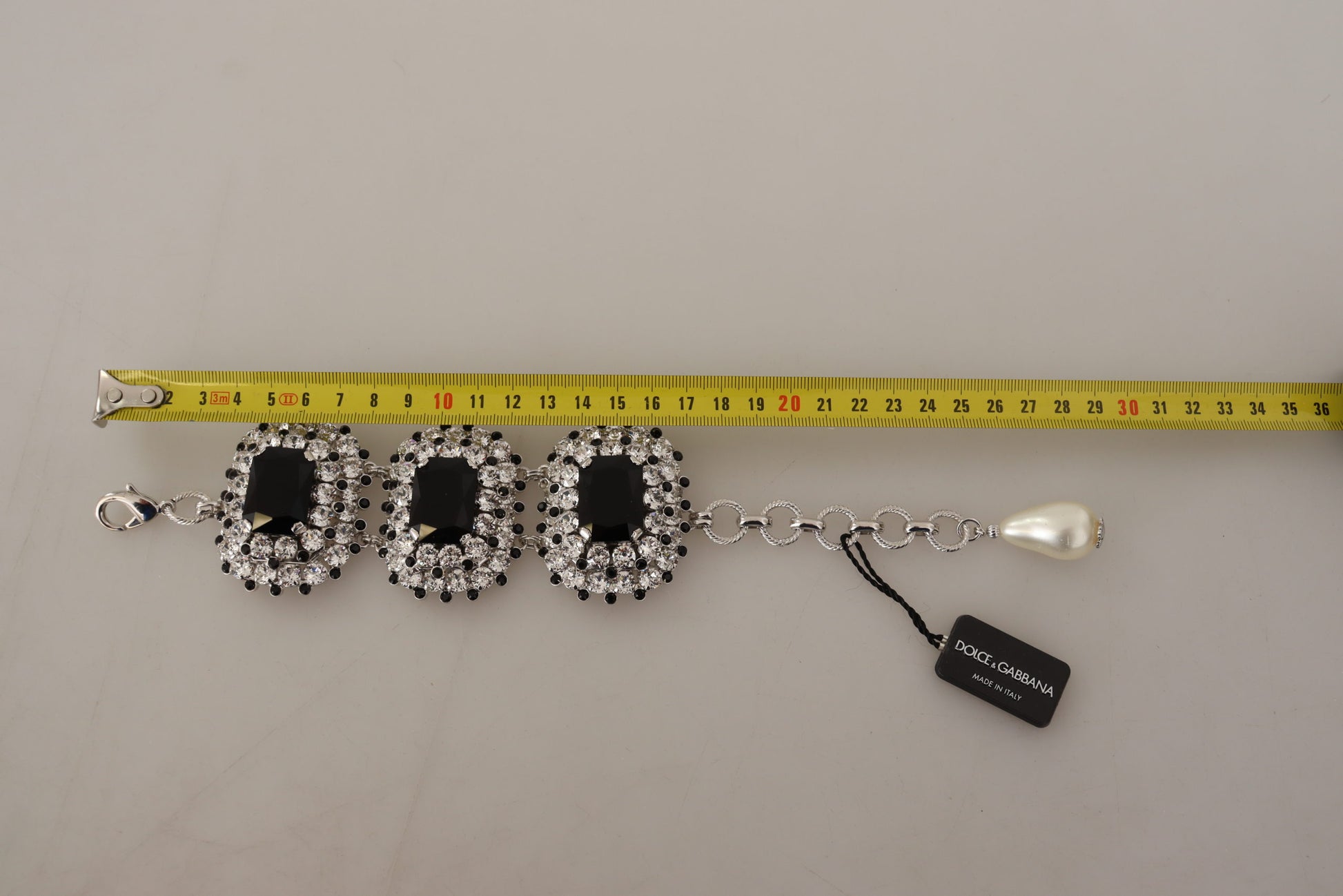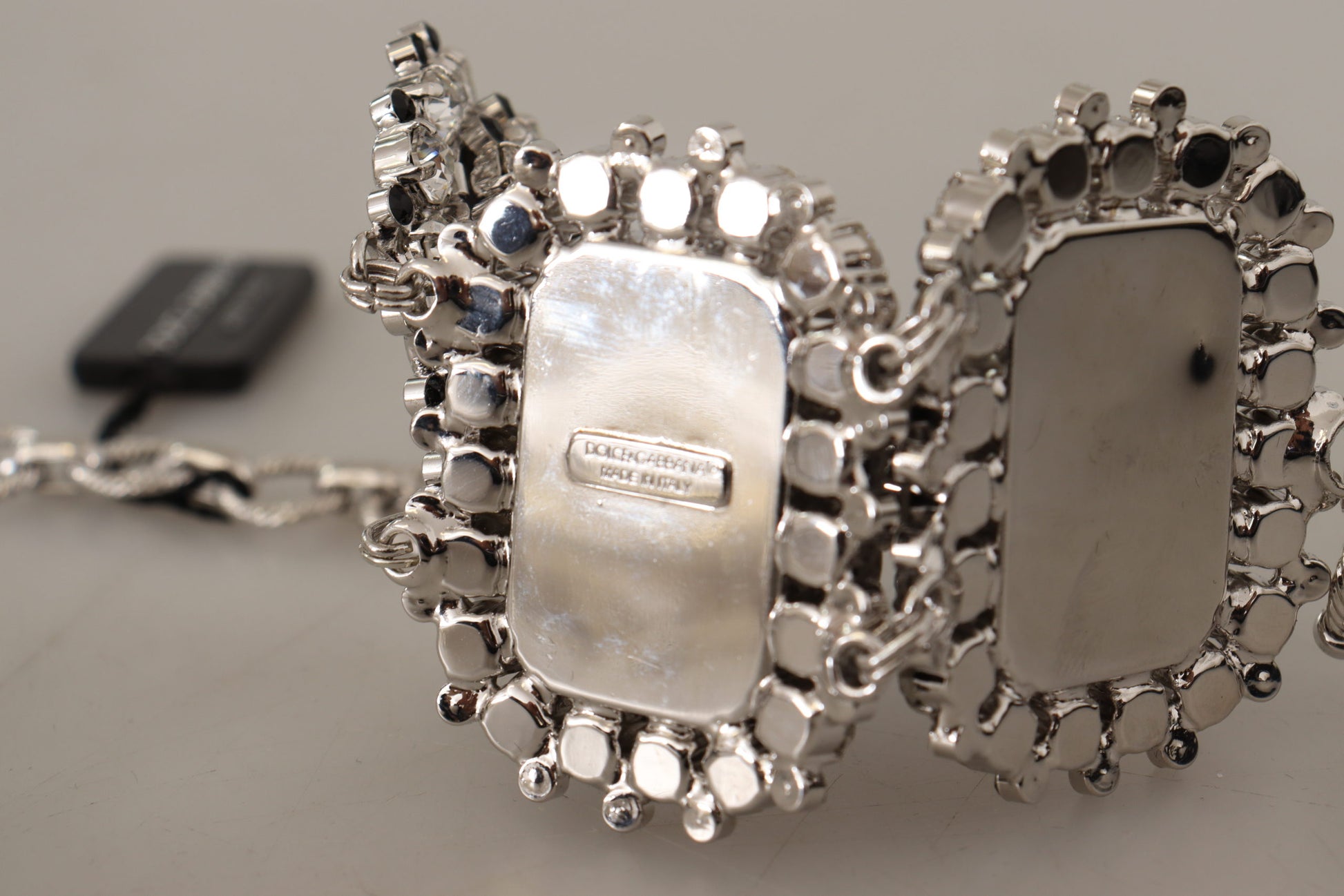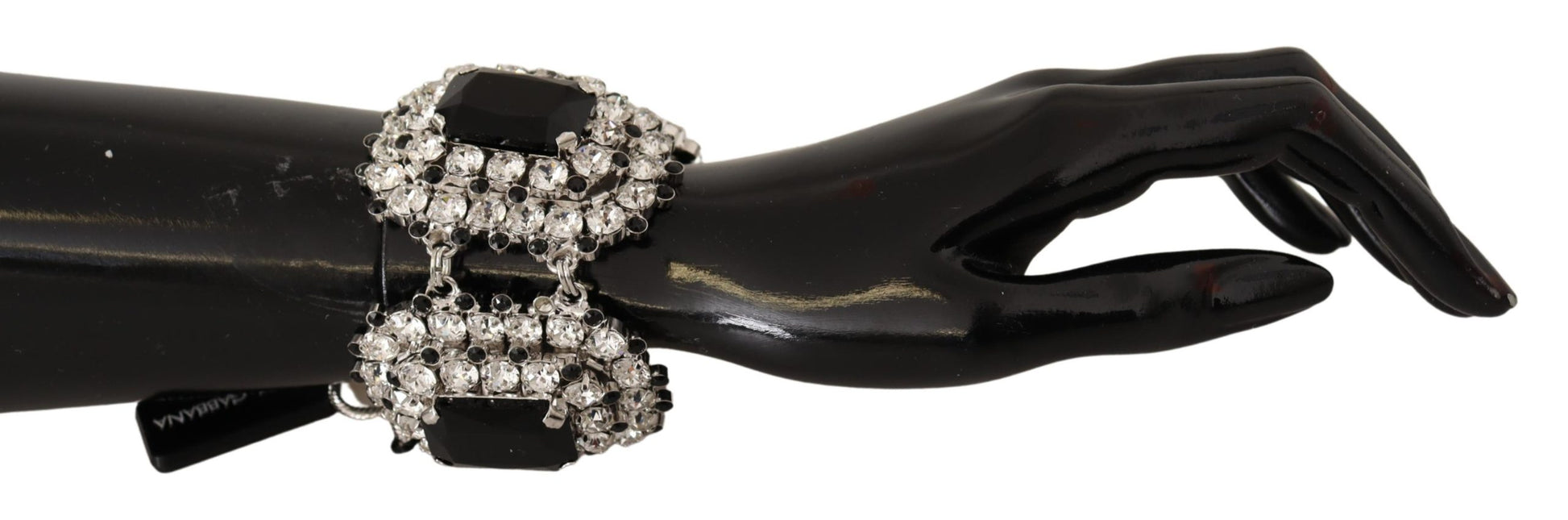 Indulge in the opulence of Dolce & Gabbana ‘s exquisite bracelet, beautifully adorned with sparkling crystal decorations. This statement piece exemplifies luxury, crafted from lustrous silver-tone brass that promises enduring shine. Its adjustable chain bracelet design ensures a perfect fit as it dangles gracefully on the wrist, making it an ideal accessory for any woman seeking an elegant touch to her ensemble.