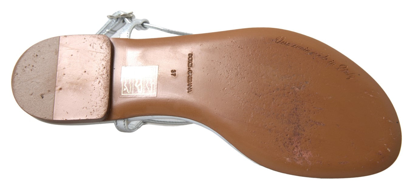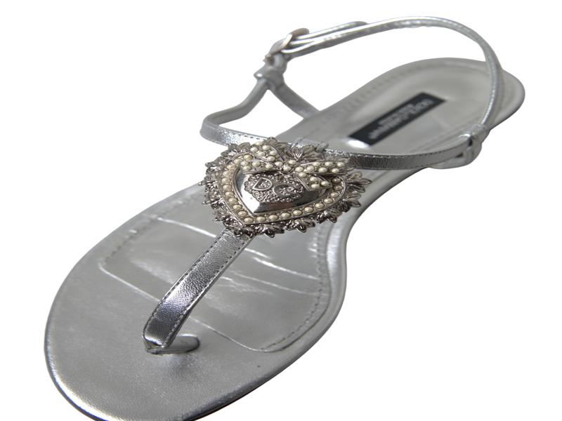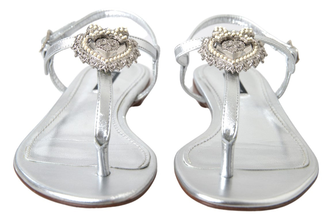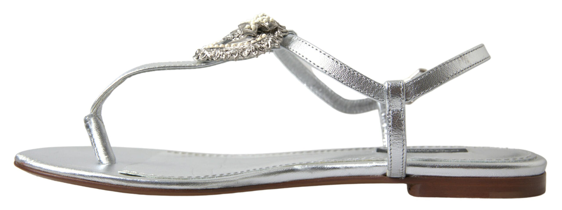Step out in style with these stunning, brand new sandals from Dolce & Gabbana . Designed to add a touch of sophistication to any outfit, these silver-tone flats showcase charming heart details that capture the essence of luxury footwear. Crafted from premium leather, they boast a comfortable strap design ensuring both elegance and practicality for your walk. Perfect for any fashion-forward wardrobe, these sandals are a true testament to Italian craftsmanship.