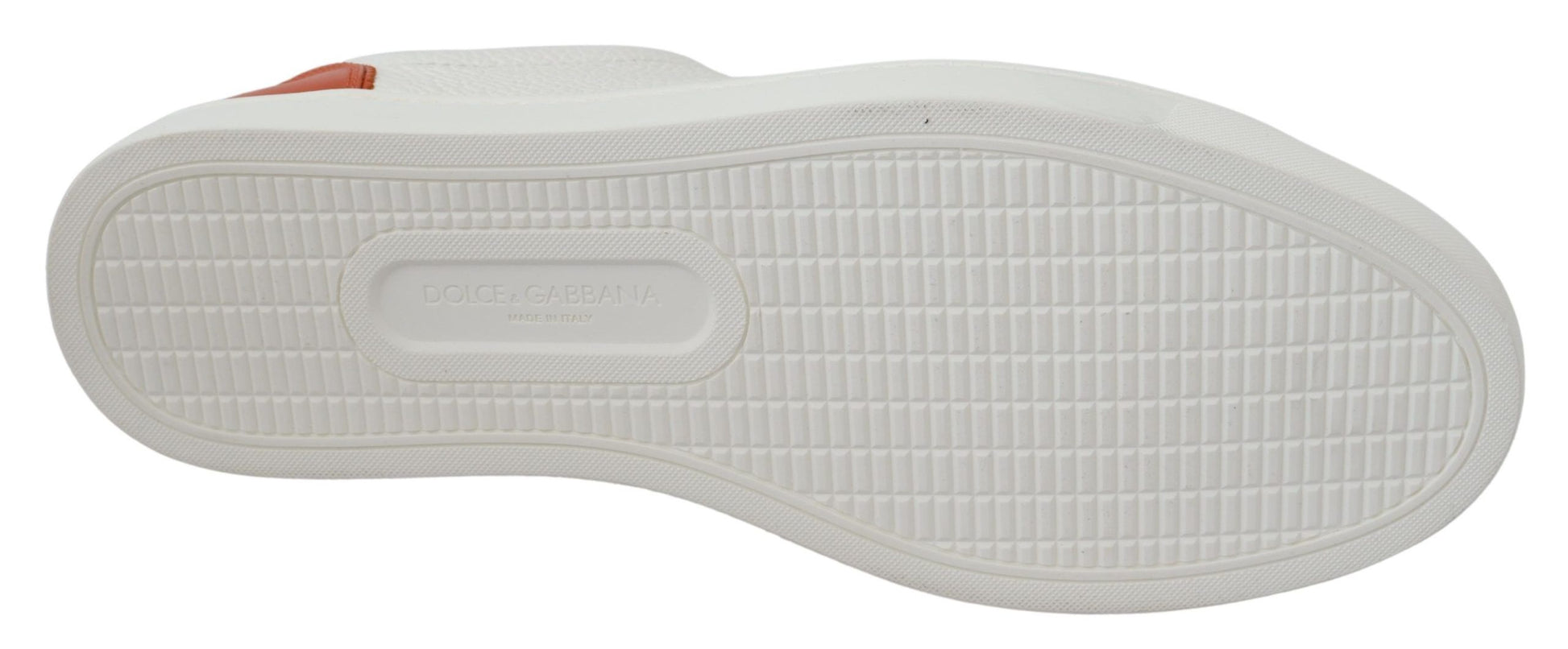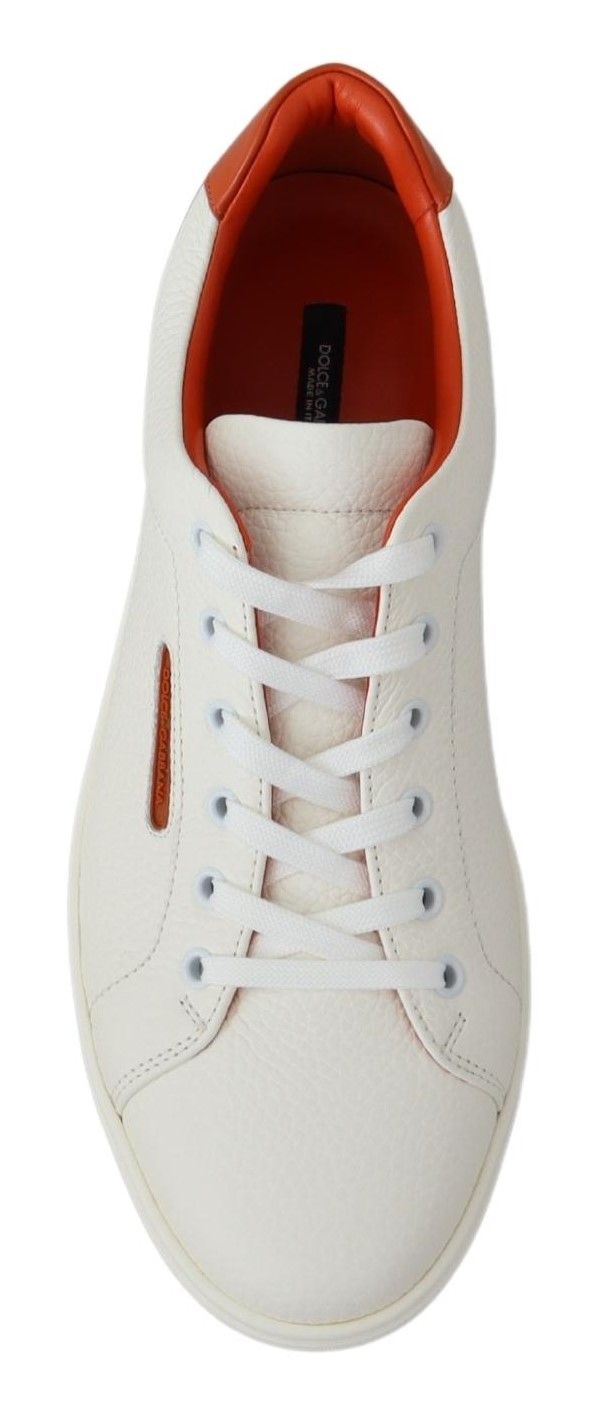Step out in style with these eye-catching Dolce & Gabbana Low-top Sneakers. Immaculately crafted with premium leather, these sneakers boast a crisp white body complemented by vibrant orange accents, making a bold fashion statement. The classic lace-up design, cushioned white sole, and subtle logo embellishments epitomize luxury and comfort. Perfect for the discerning gentleman eager to add an Italian flair to his ensemble.
