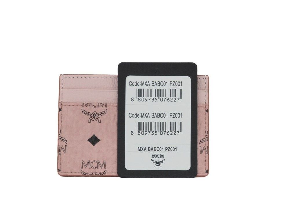 Style: MCM Original Visetos Slim Card Case (Soft Pink) Material: Coated Canvas and Nappa Leather Features: Monogrammed, 4 Card Slots, Center Slot Measures: 10.16 cm L x 6.35 cm H