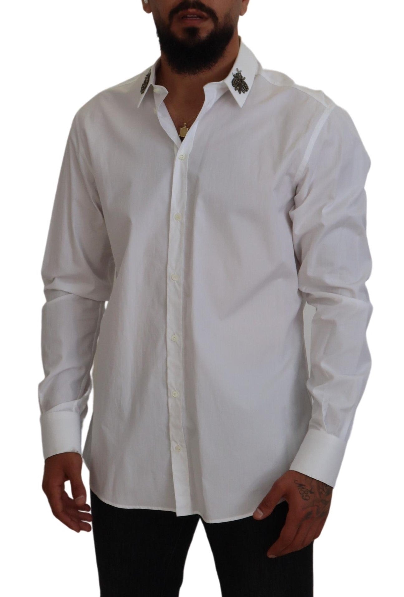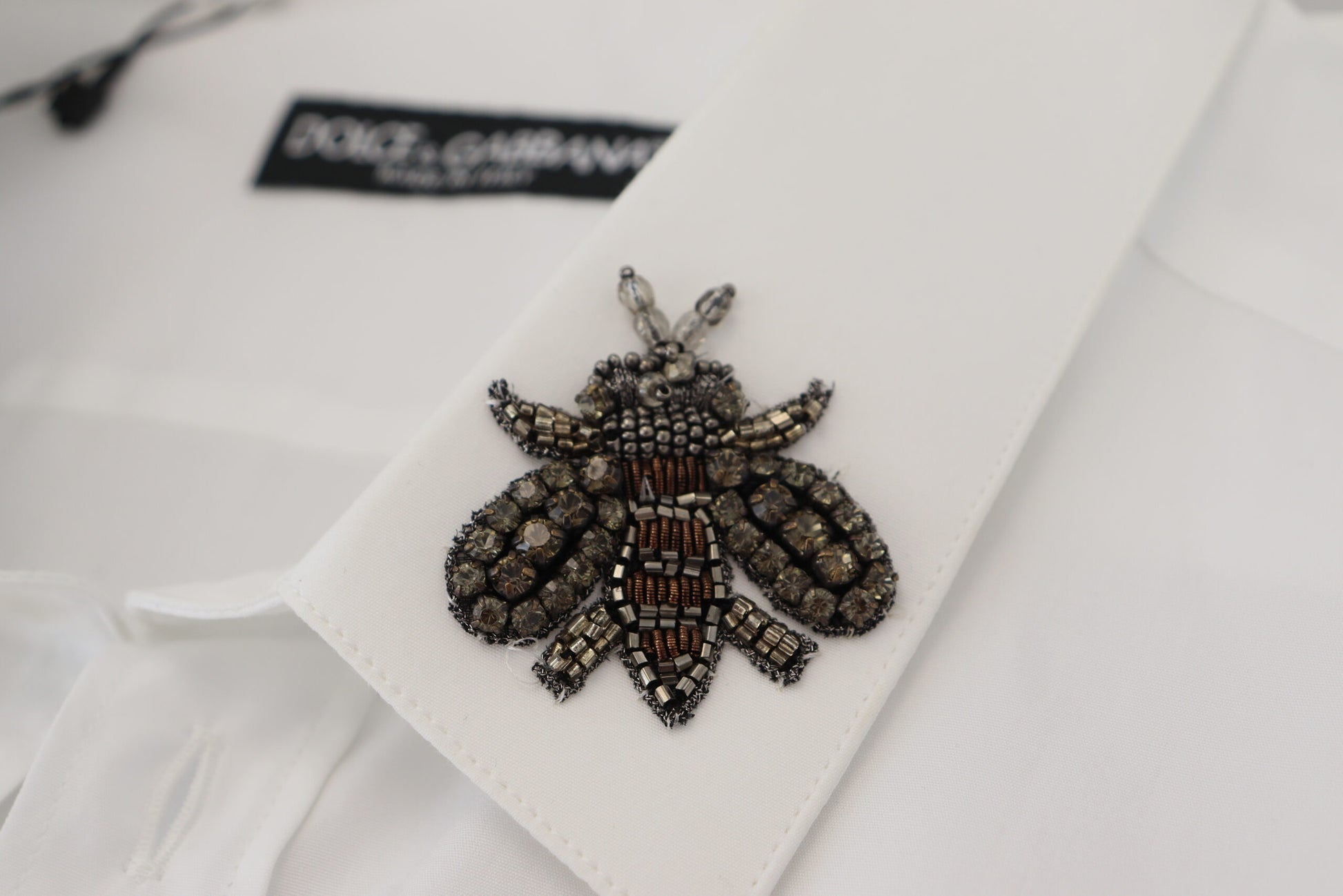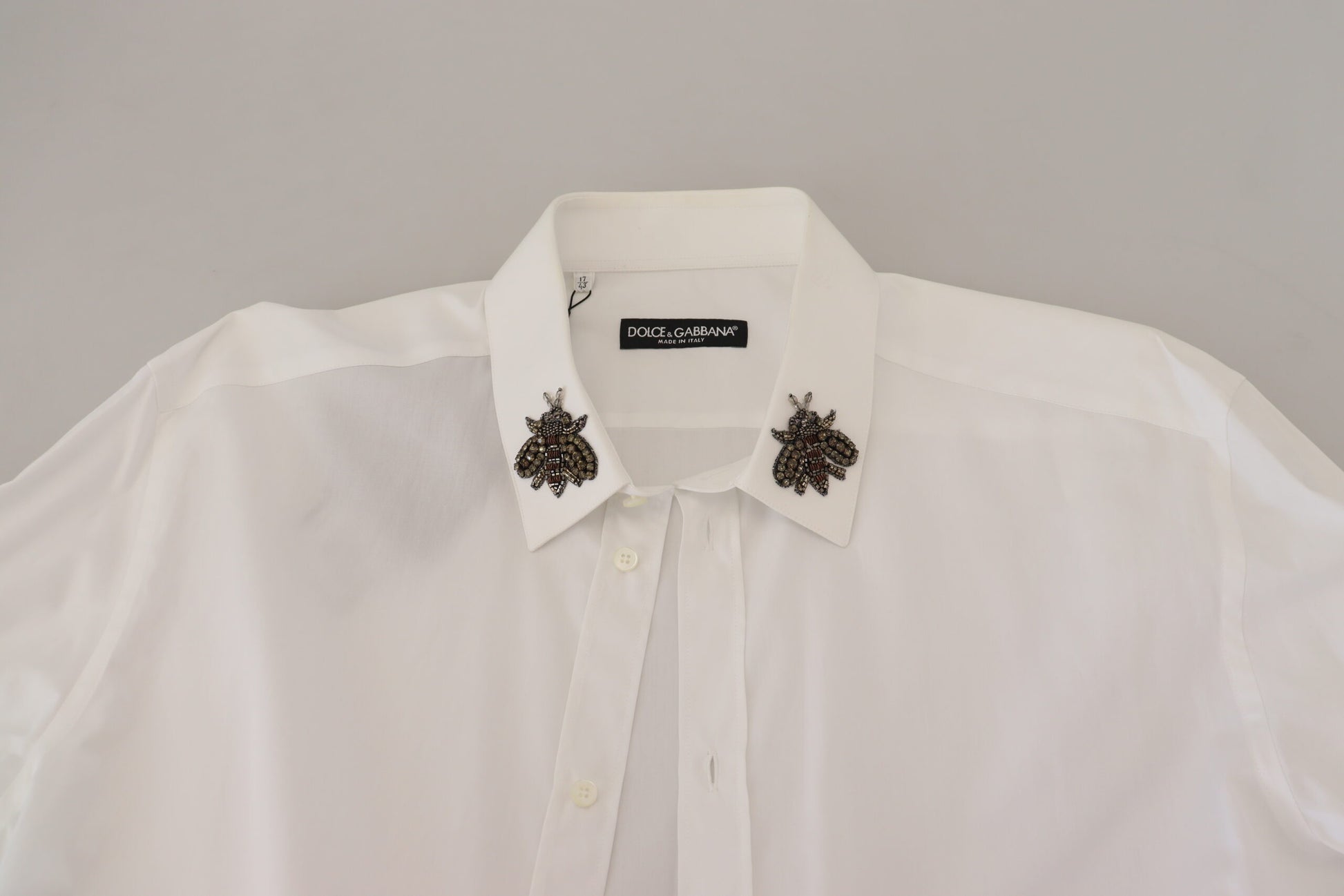 Discover the epitome of Italian craftsmanship with this stunning white shirt from Dolce & Gabbana. This 100% authentic, brand new piece is accentuated with distinctive bee embellishments, offering a perfect blend of luxury and style. With a classic spread collar and front button closure, it’s tailored for a regular fit and crafted from the finest cotton, ensuring both comfort and elegance. Adorned with subtle logo details, this shirt is a testament to the brand’s attention to detail and made in Italy excellence.