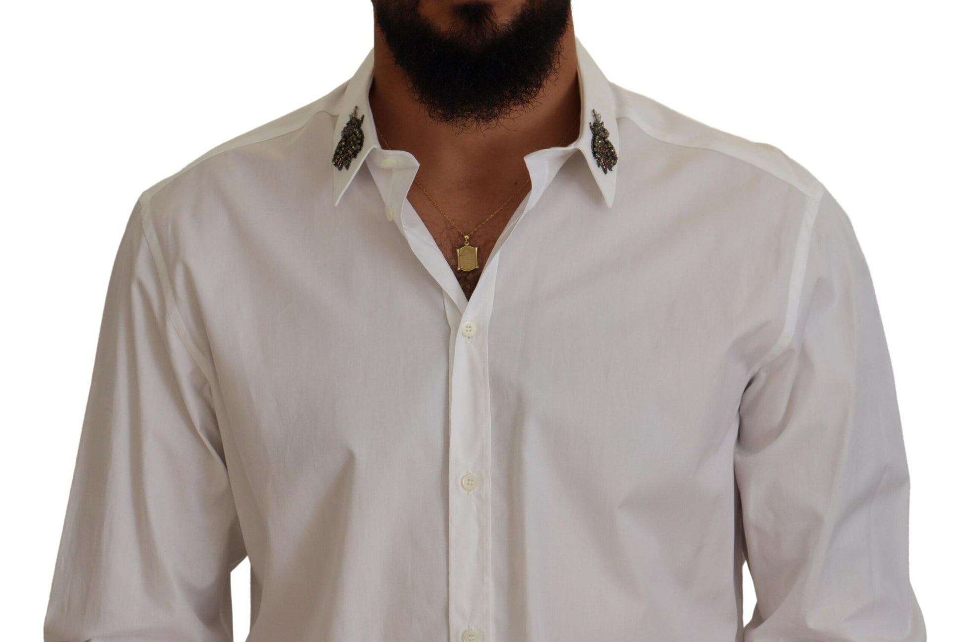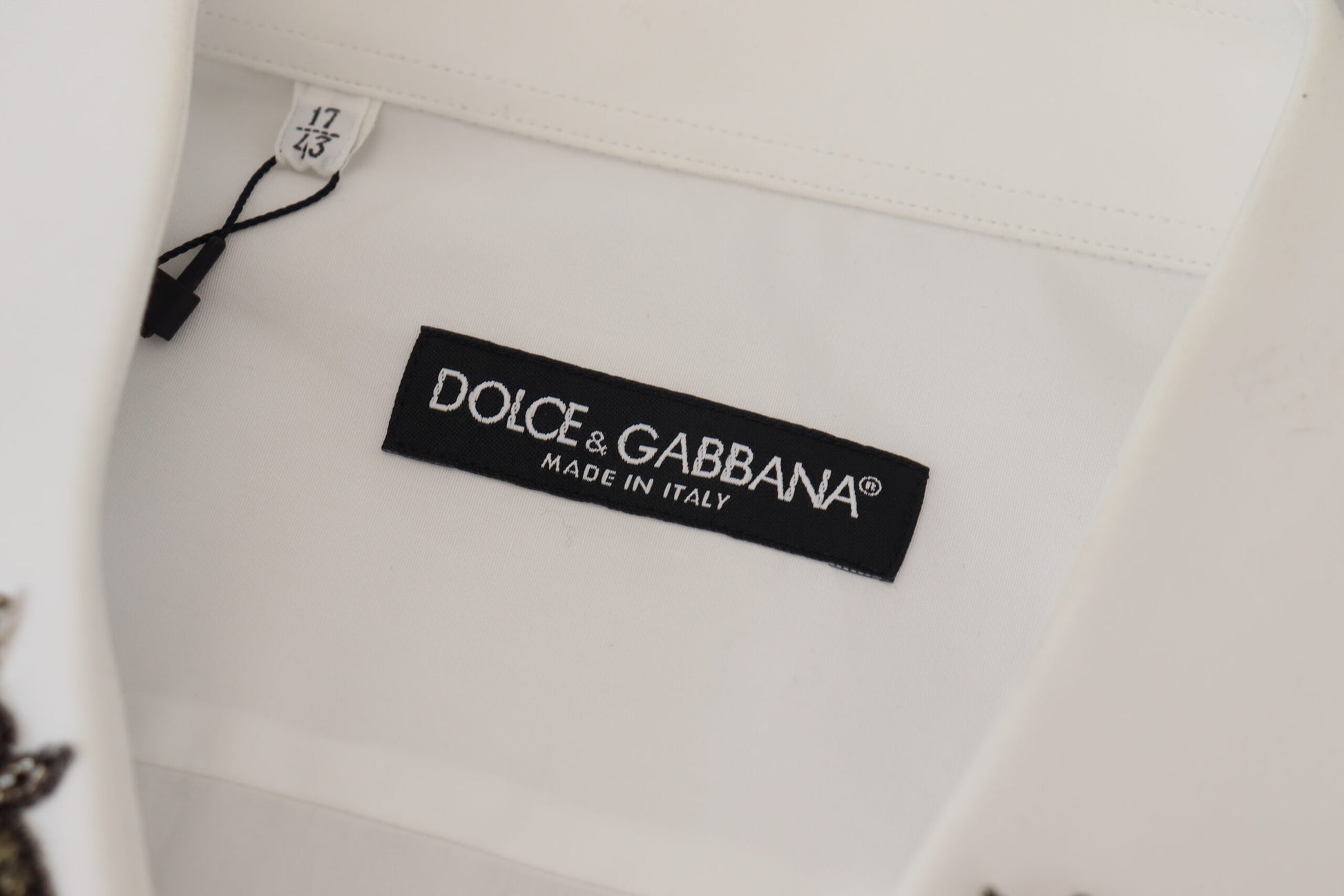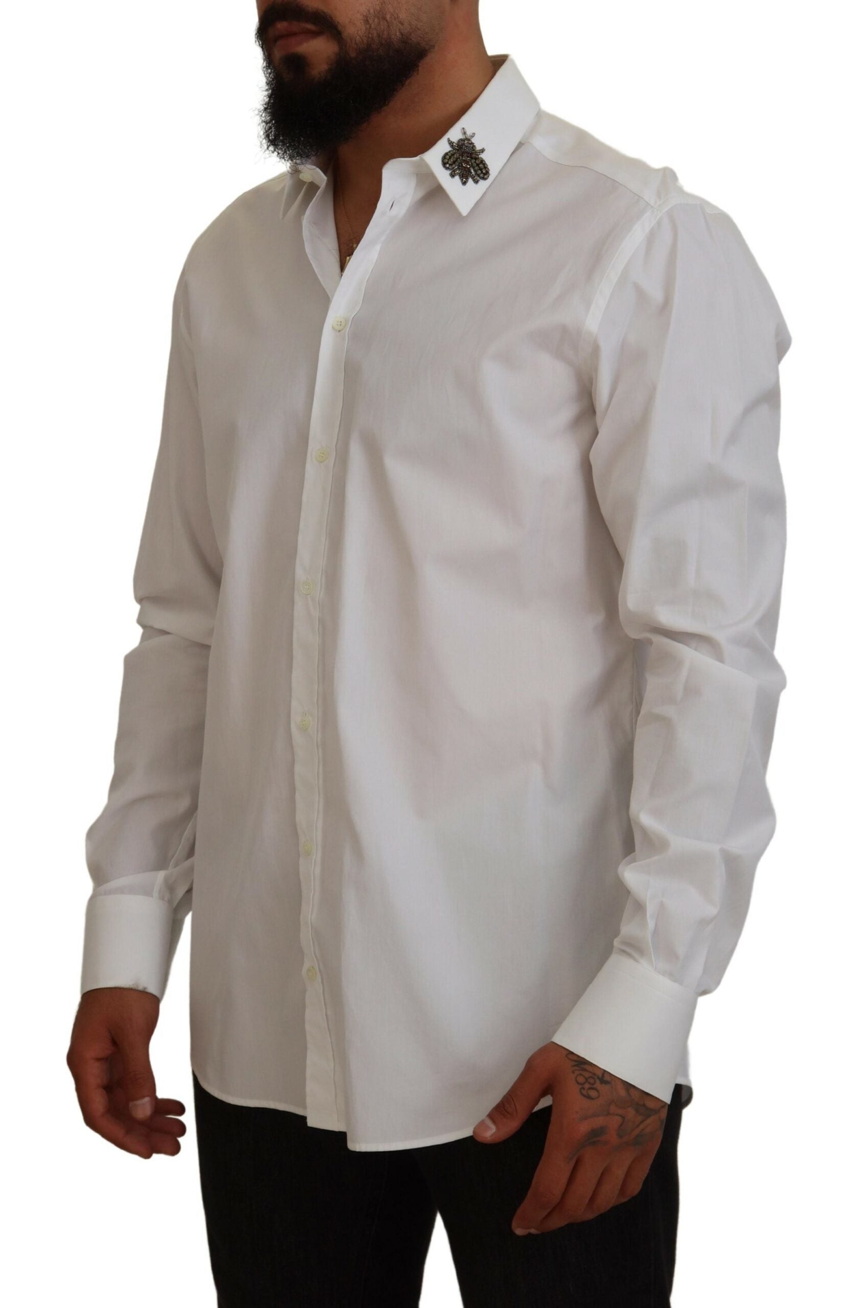 Discover the epitome of Italian craftsmanship with this stunning white shirt from Dolce & Gabbana. This 100% authentic, brand new piece is accentuated with distinctive bee embellishments, offering a perfect blend of luxury and style. With a classic spread collar and front button closure, it’s tailored for a regular fit and crafted from the finest cotton, ensuring both comfort and elegance. Adorned with subtle logo details, this shirt is a testament to the brand’s attention to detail and made in Italy excellence.