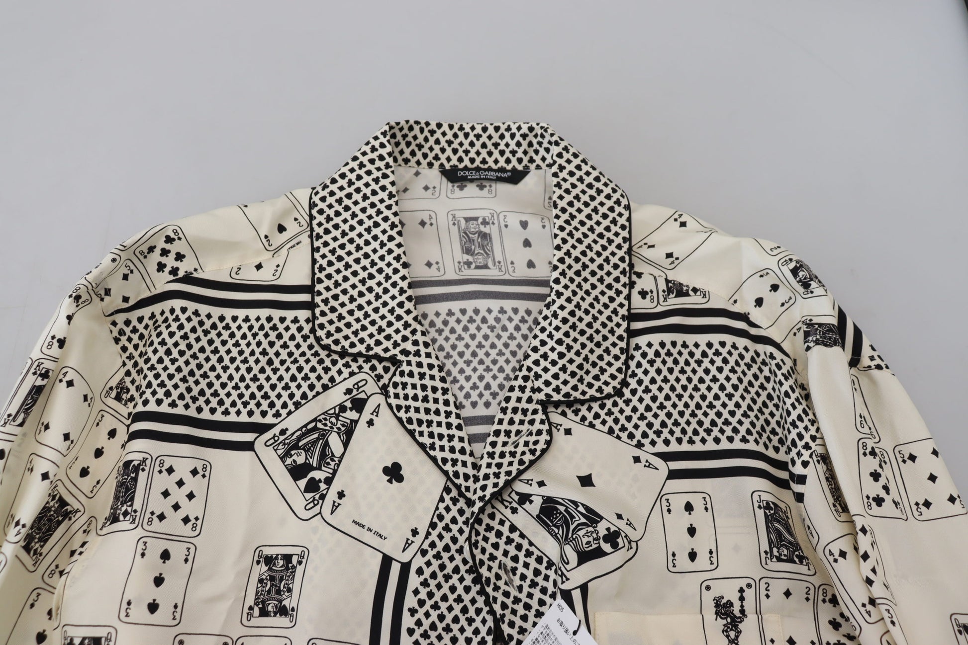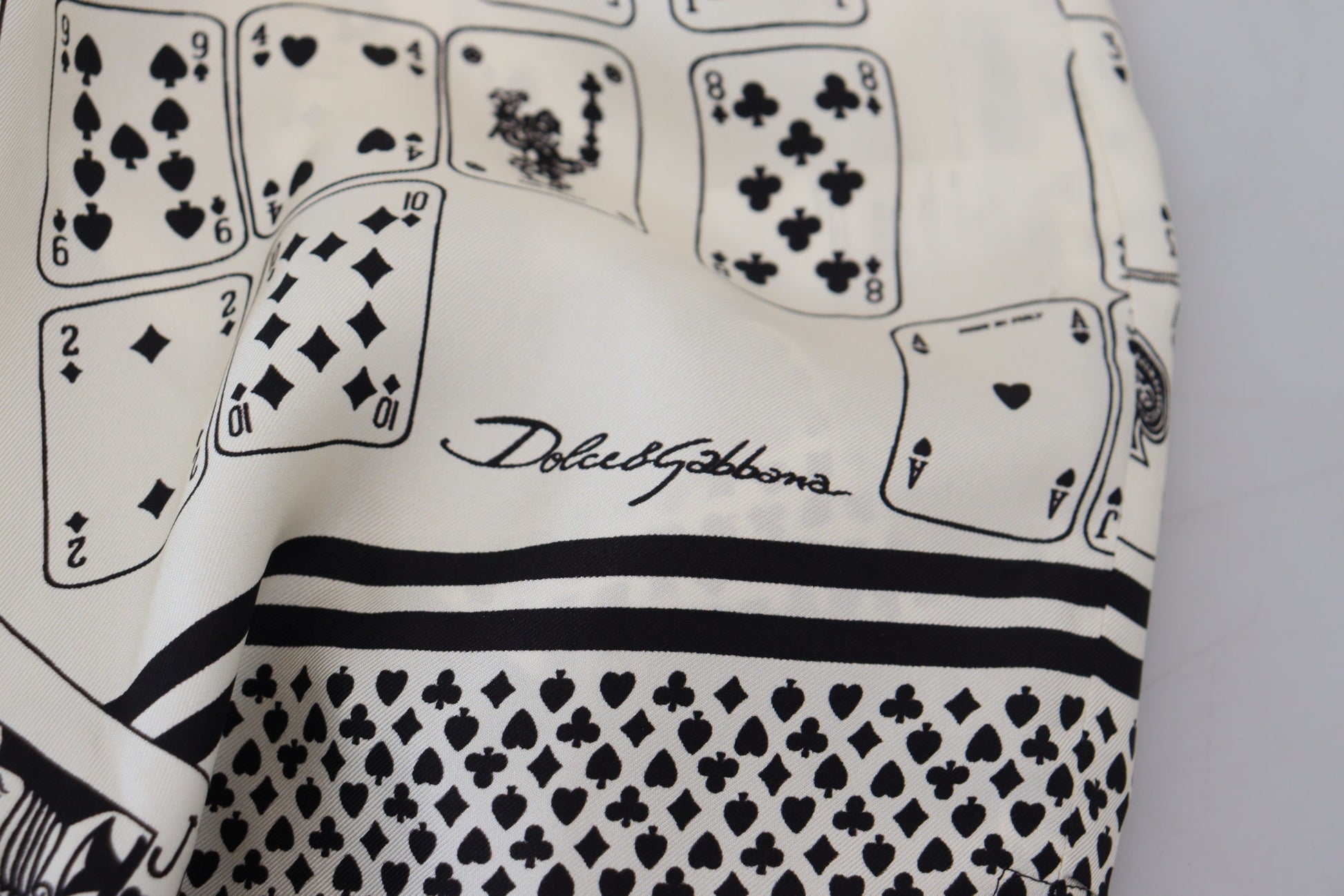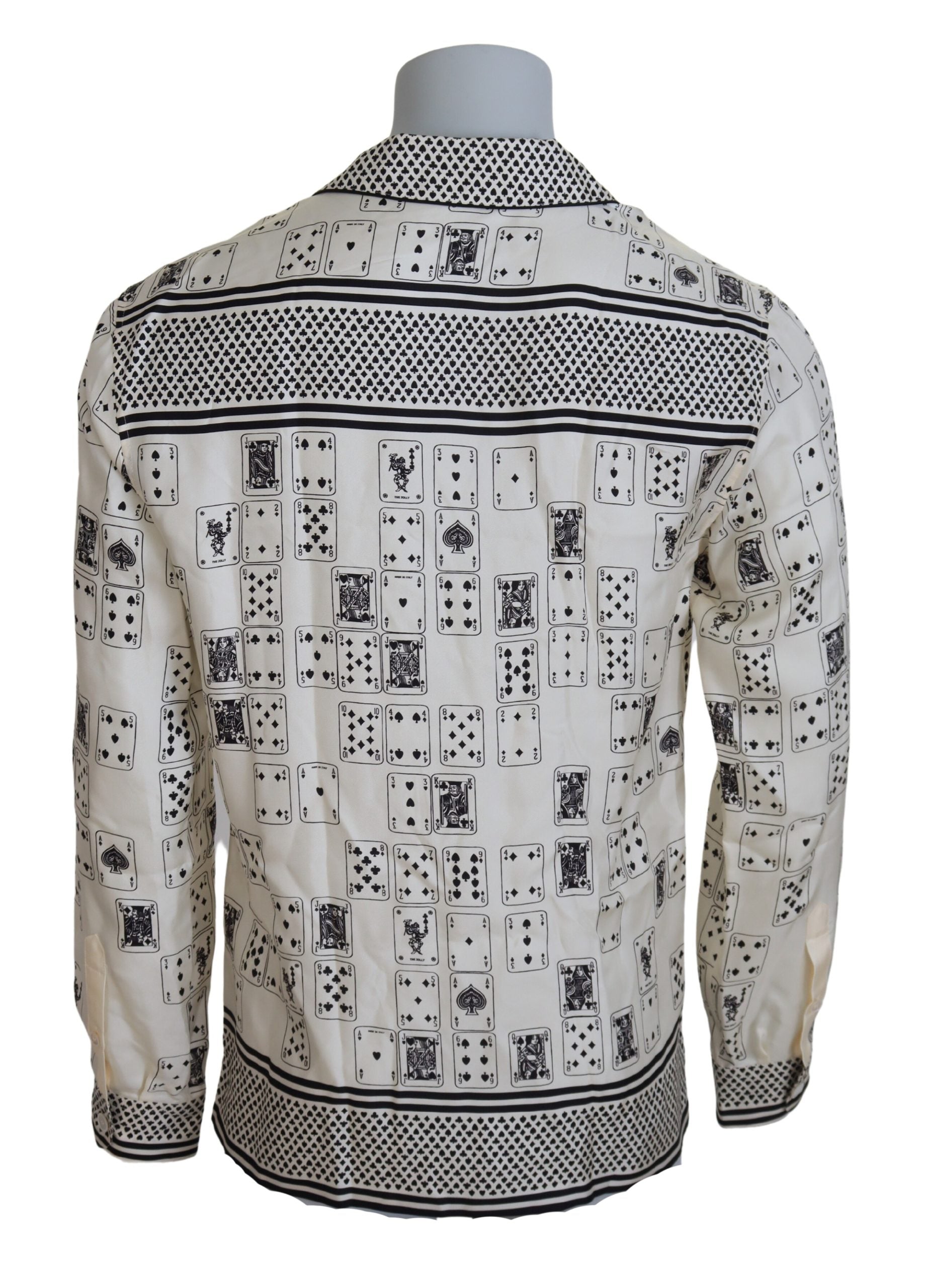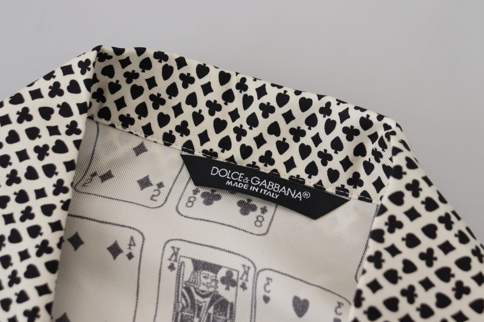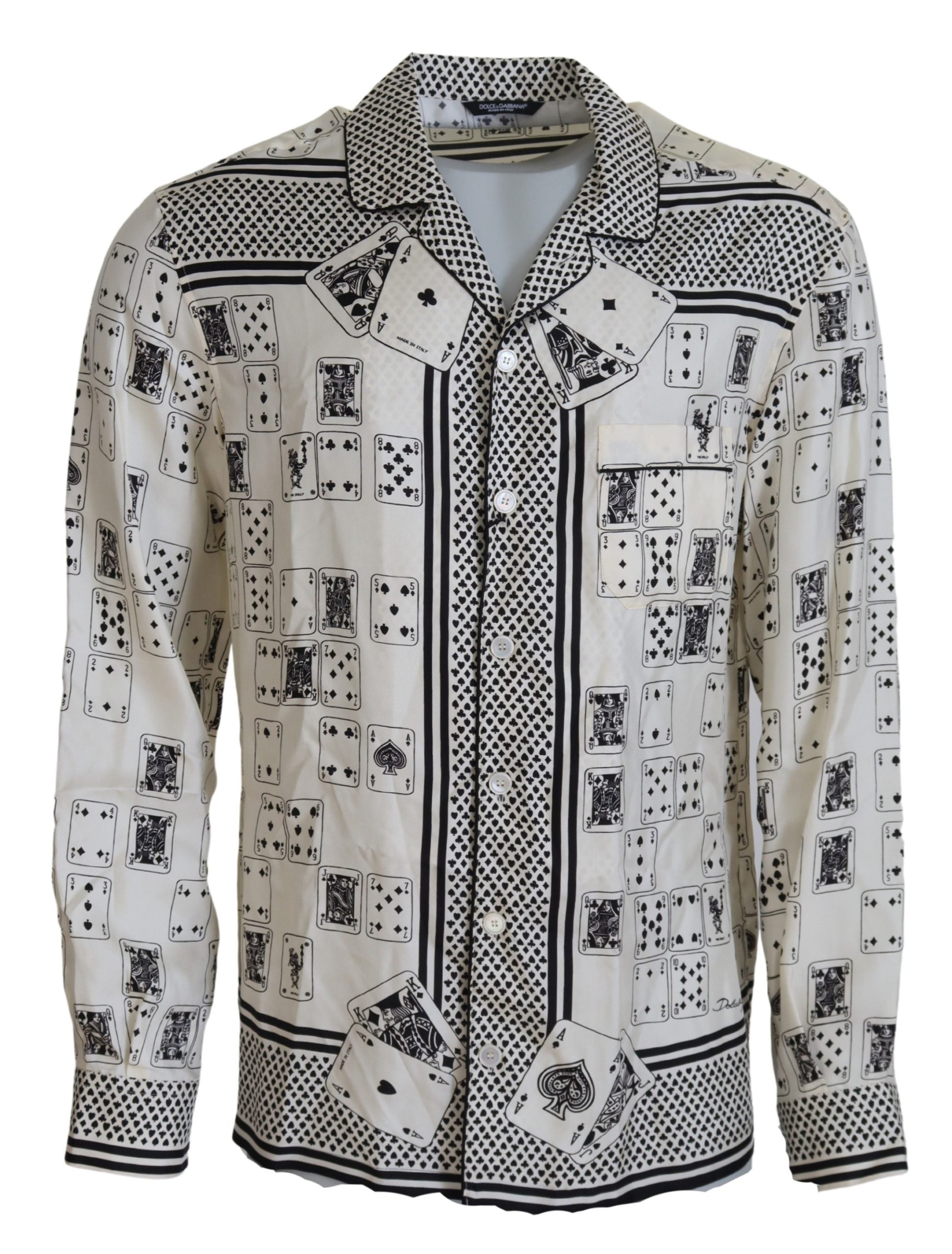 Discover the epitome of luxury with our elegant satin casual shirt from the renowned Dolce & Gabbana collection. This impeccable white shirt, adorned with a unique card deck print, is a masterpiece of Italian craftsmanship, offering both comfort and style in a regular fit design. The soft, sumptuous 100% silk material drapes elegantly, ensuring a sophisticated silhouette, while the front button closure and logo details add a touch of the brand’s signature charm. Perfect for any fashion-forward gentleman seeking to elevate their wardrobe. Made in Italy, it’s an authentic piece that blends tradition with modern flair.
