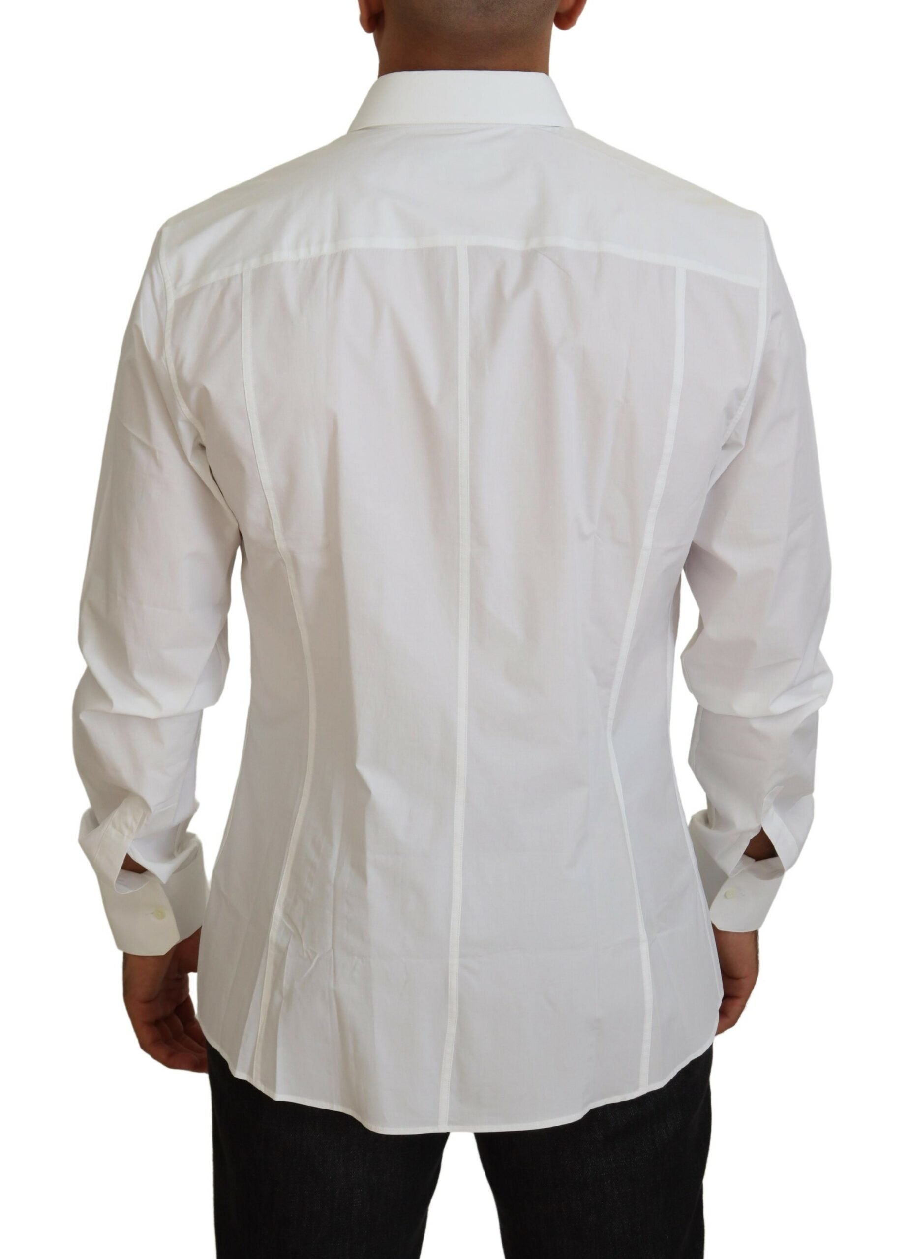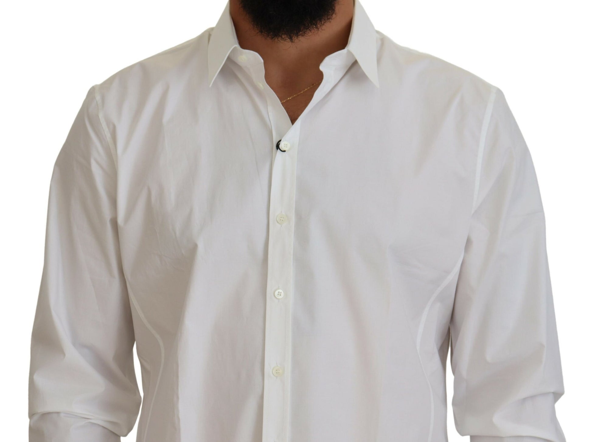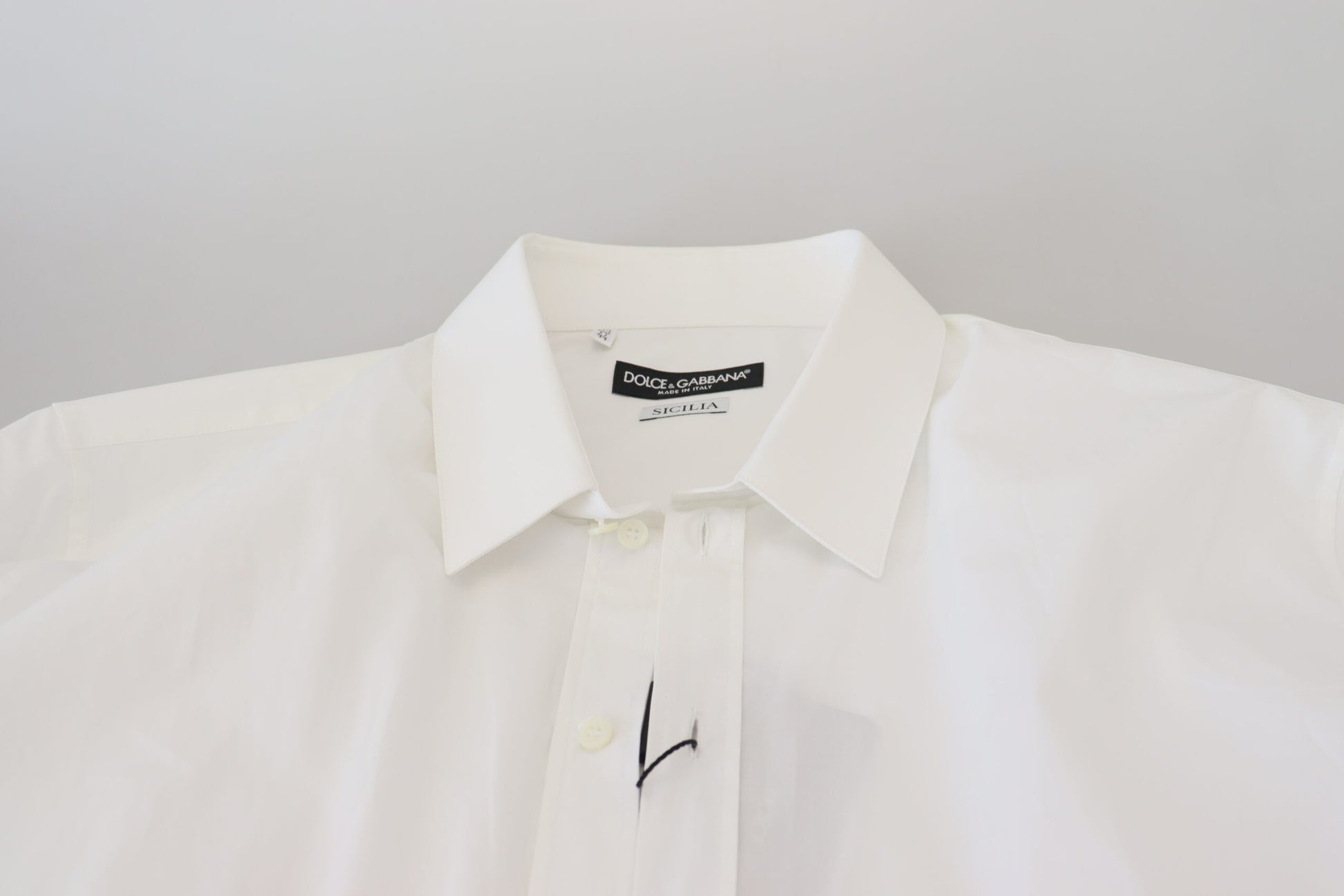 Experience timeless elegance with this Dolce & Gabbana Sicilia formal shirt. Its impeccable construction featuring a classic neck and long sleeves, pairs with a sharp regular fit to elevate your sartorial game. Fashioned from a premium blend of cotton and elastane, it offers both comfort and a sleek silhouette. Perfect for formal events or sophisticated business attire, this white shirt showcases front button closure and subtle logo details, all crafted with Italian finesse.