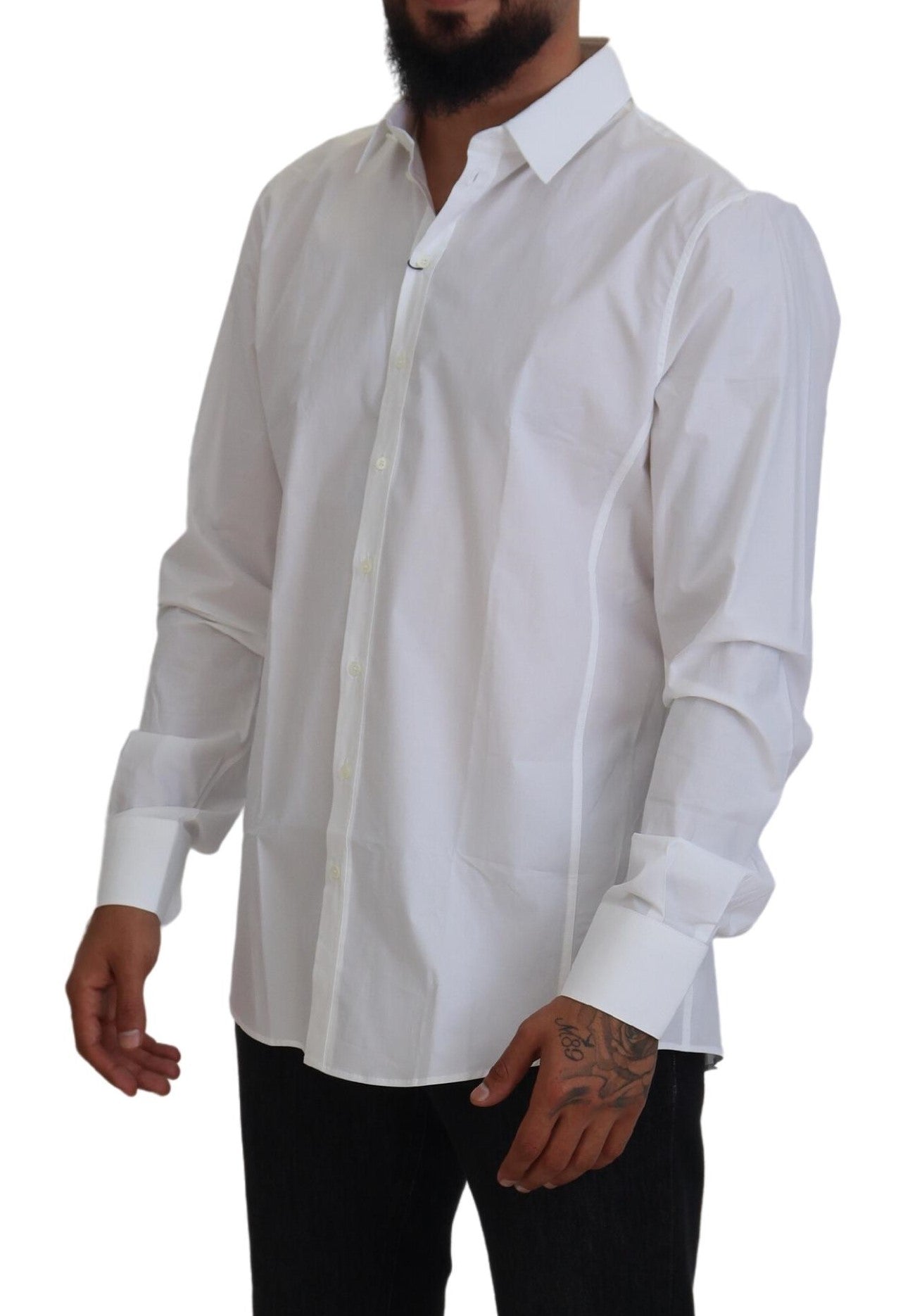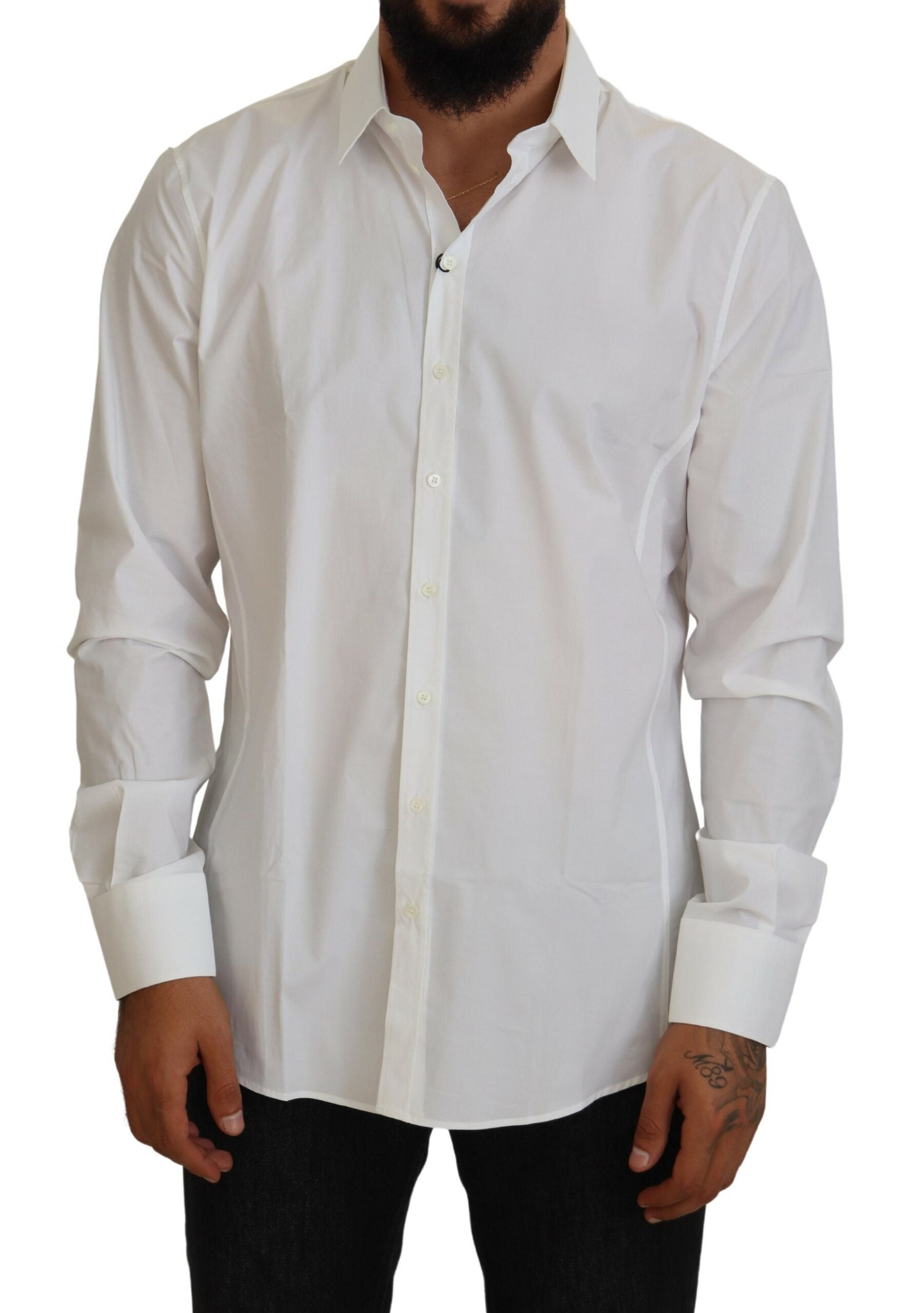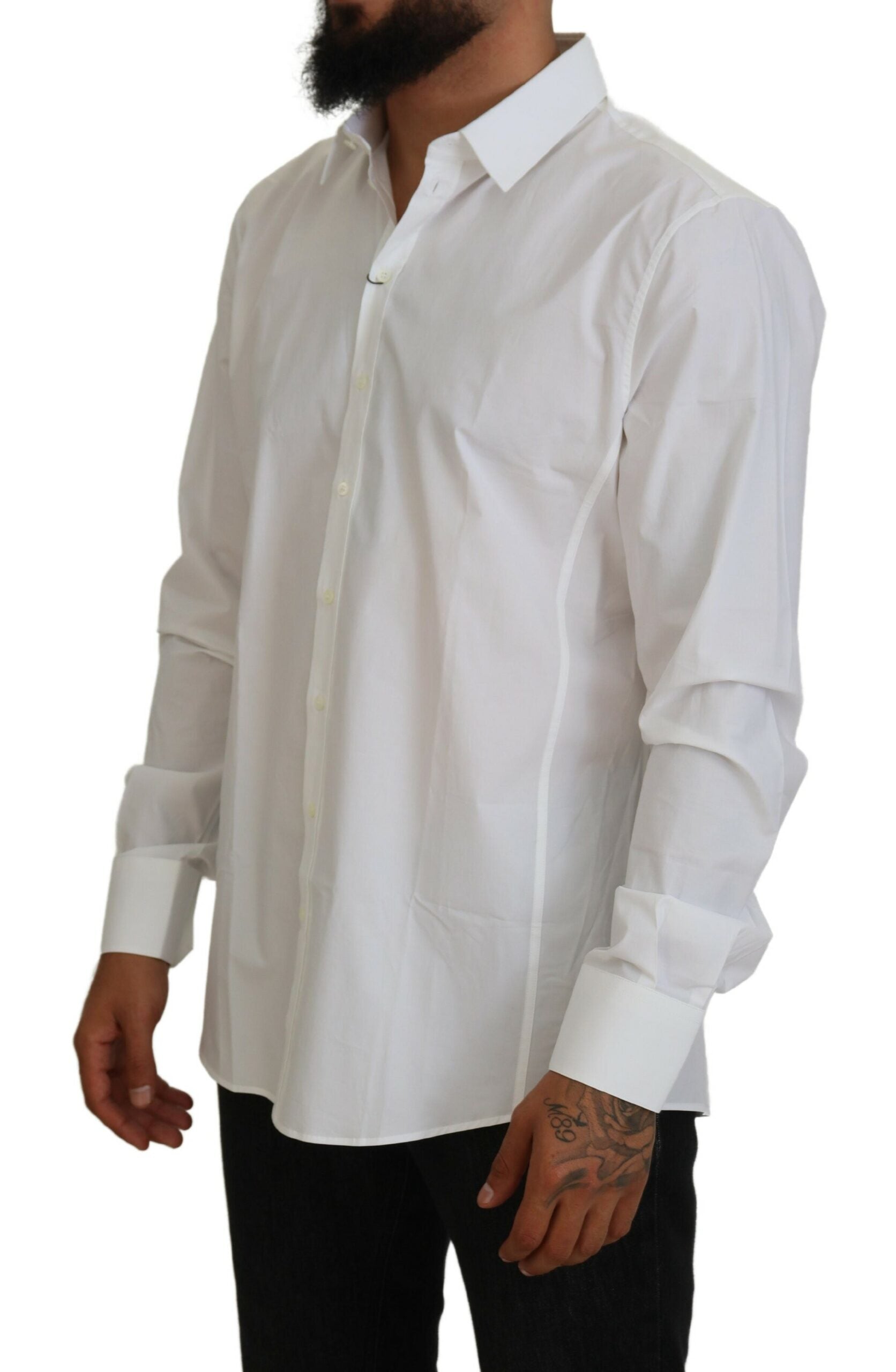 Experience timeless elegance with this Dolce & Gabbana Sicilia formal shirt. Its impeccable construction featuring a classic neck and long sleeves, pairs with a sharp regular fit to elevate your sartorial game. Fashioned from a premium blend of cotton and elastane, it offers both comfort and a sleek silhouette. Perfect for formal events or sophisticated business attire, this white shirt showcases front button closure and subtle logo details, all crafted with Italian finesse.