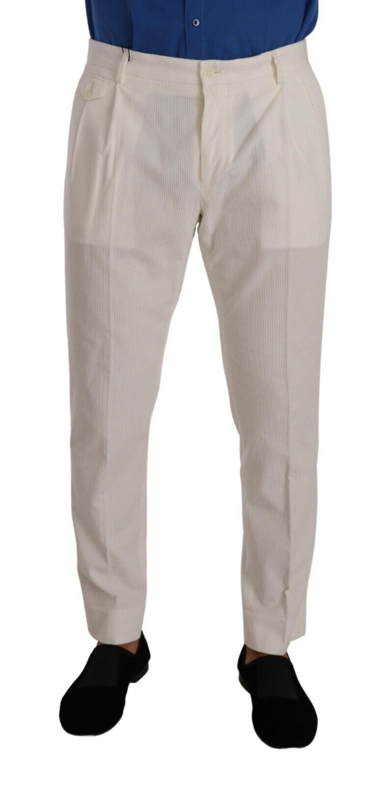 Indulge in the epitome of Italian craftsmanship with these luxurious tapered corduroy pants from Dolce & Gabbana. Designed for the modern man, they feature a sleek zipper and button closure, ensuring a secure and flattering fit. The off white color adds a touch of sophistication to any outfit, making these pants a versatile addition to your wardrobe. Perfect for those who appreciate the finer things in life, these pants are crafted from pure cotton for exceptional comfort and durability. With the distinctive logo detailing, they reflect true style and elegance, exclusively made in Italy.
