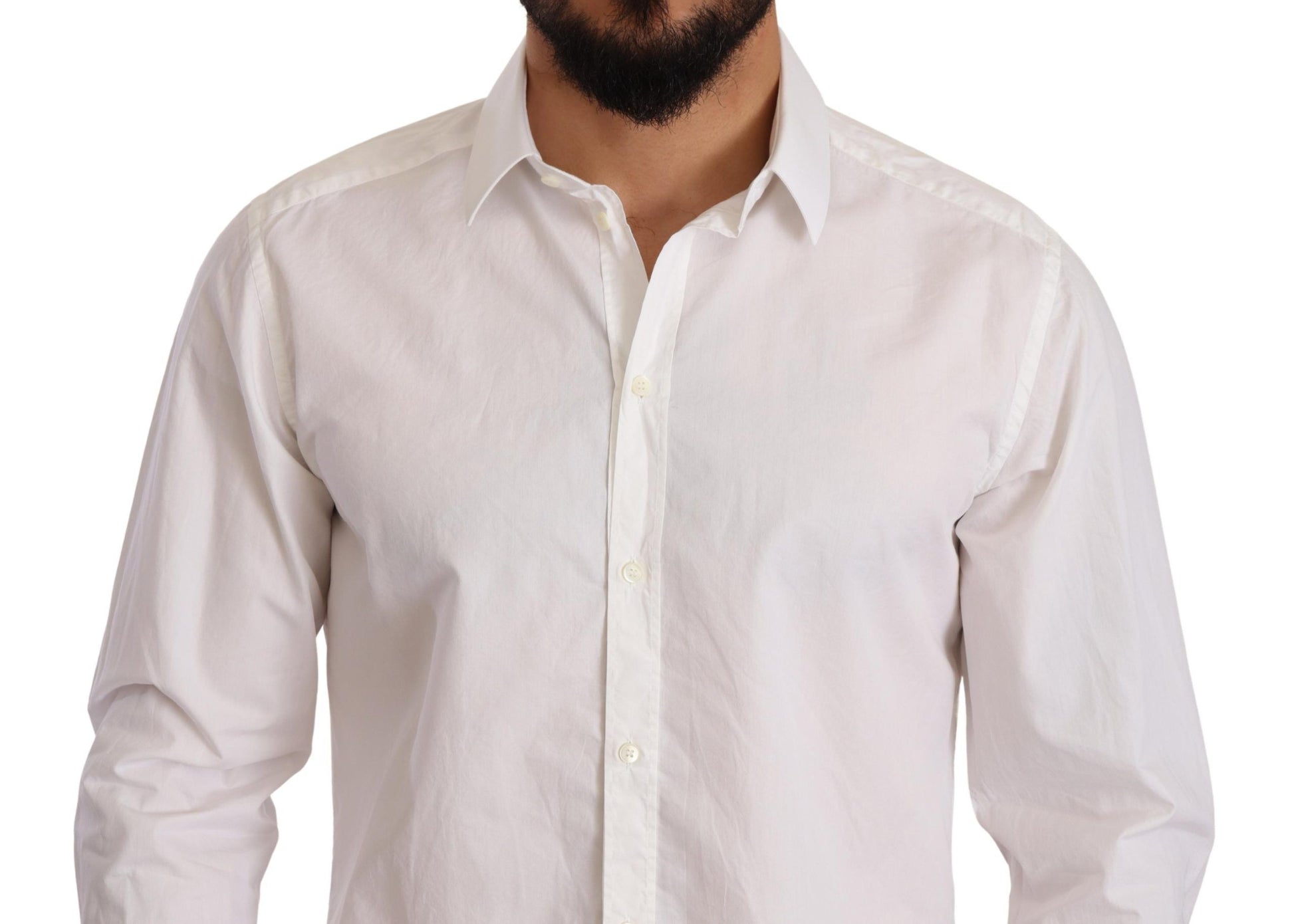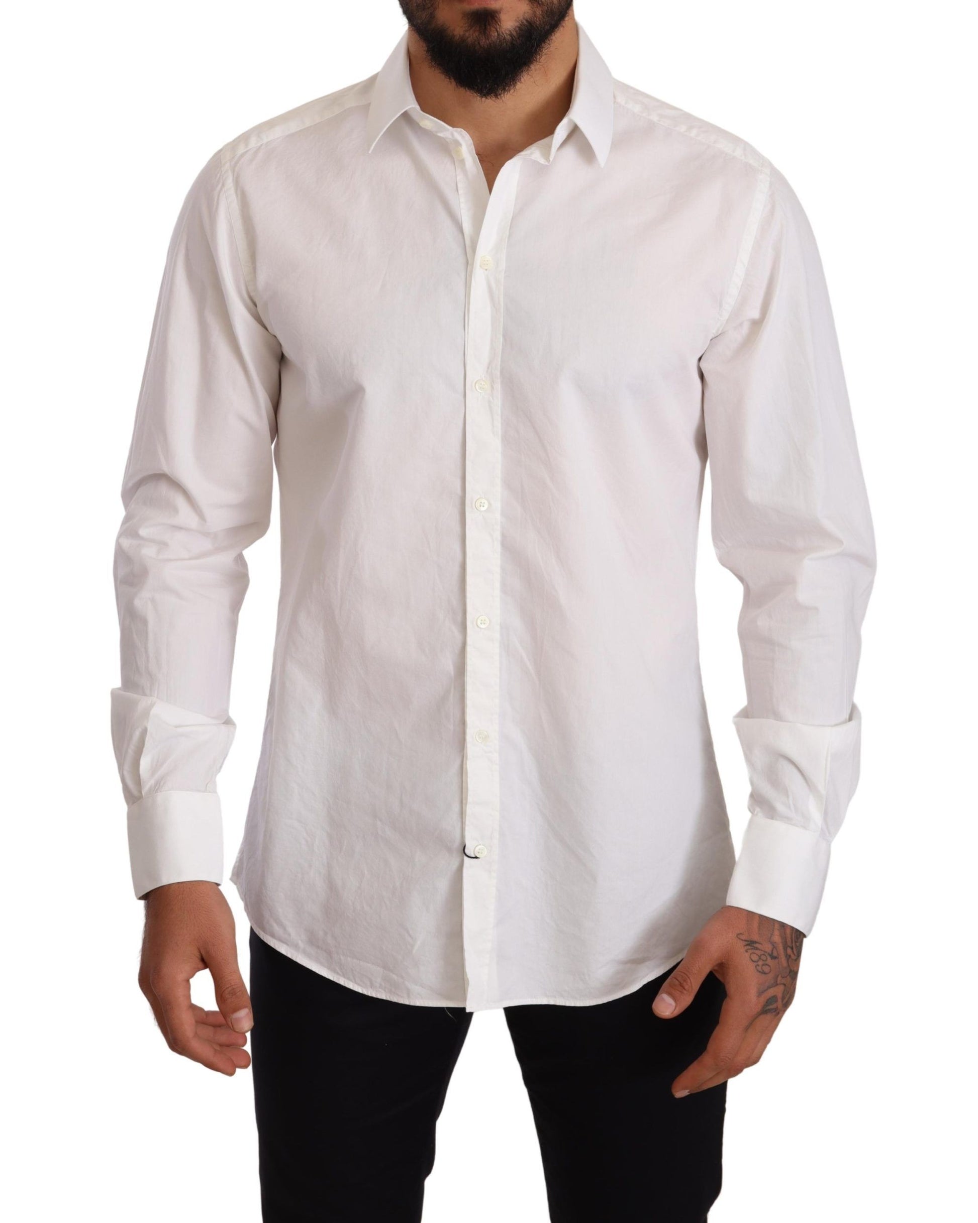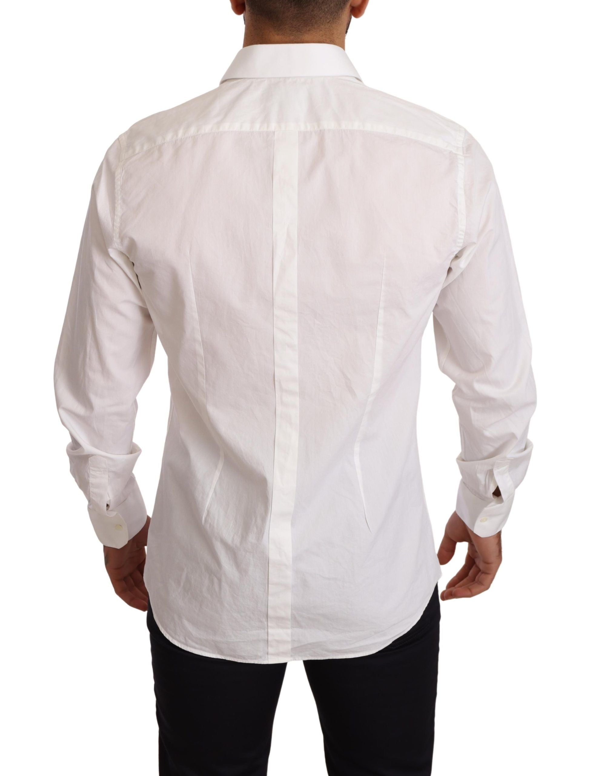 Step into the world of high-end fashion with this breathtaking Dolce & Gabbana dress shirt. Crafted from a luxurious mix of cotton and silk, this shirt is sure to turn heads with its pristine white color and slim-fit silhouette. The exquisite GOLD model features a sleek spread collar and classy front button closure. Each shirt boasts the iconic logo, symbolizing unparalleled quality and style. Expertly made in Italy, this shirt is the epitome of sophisticated dressing.