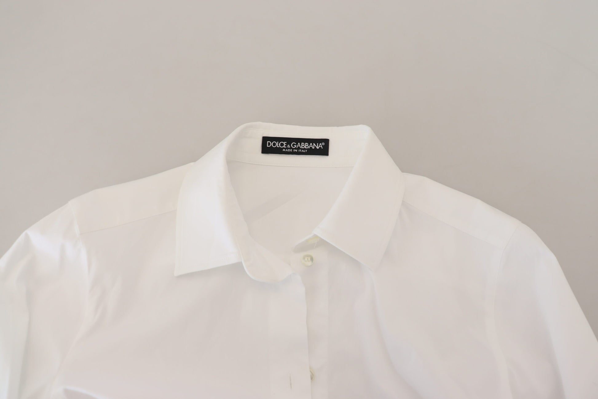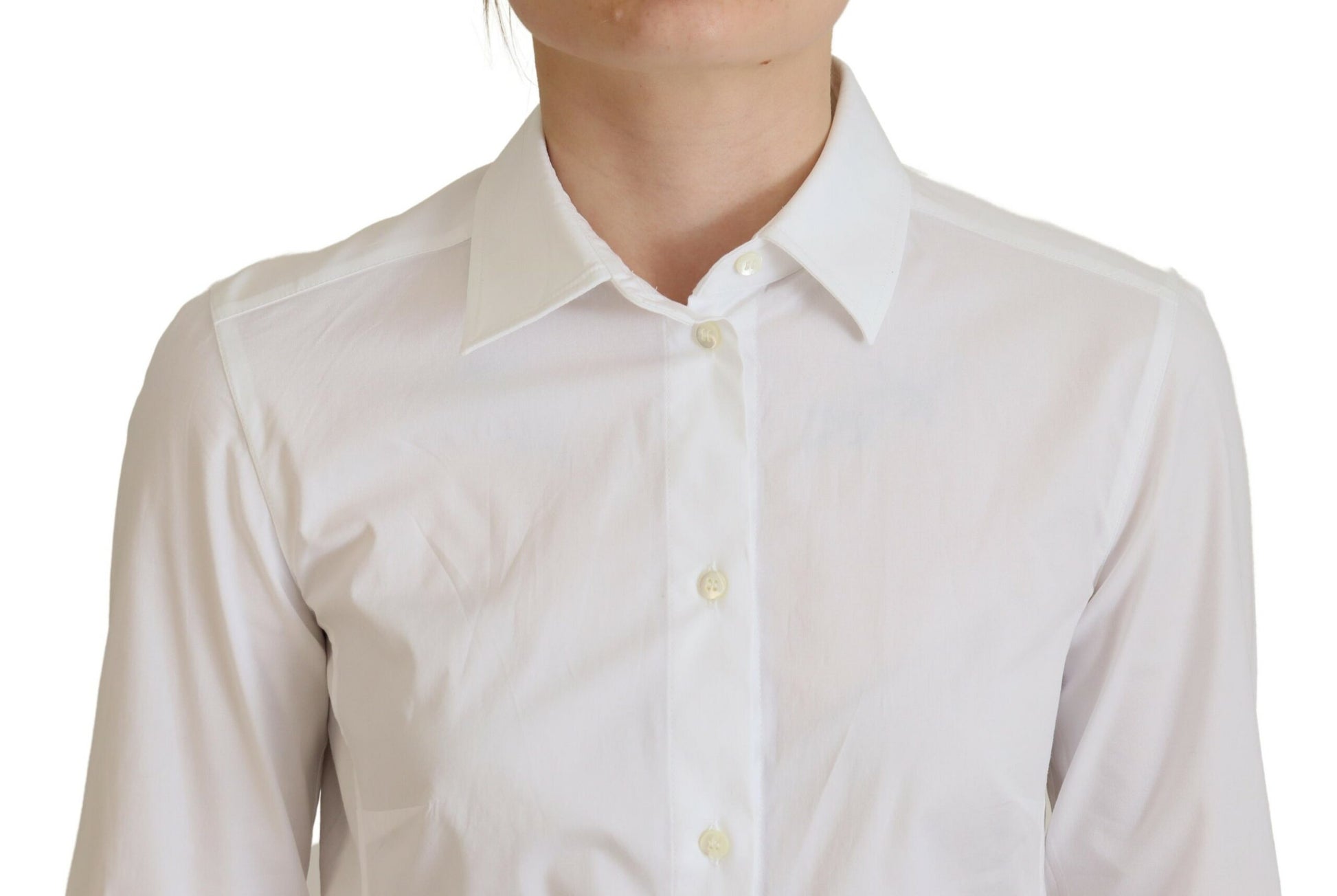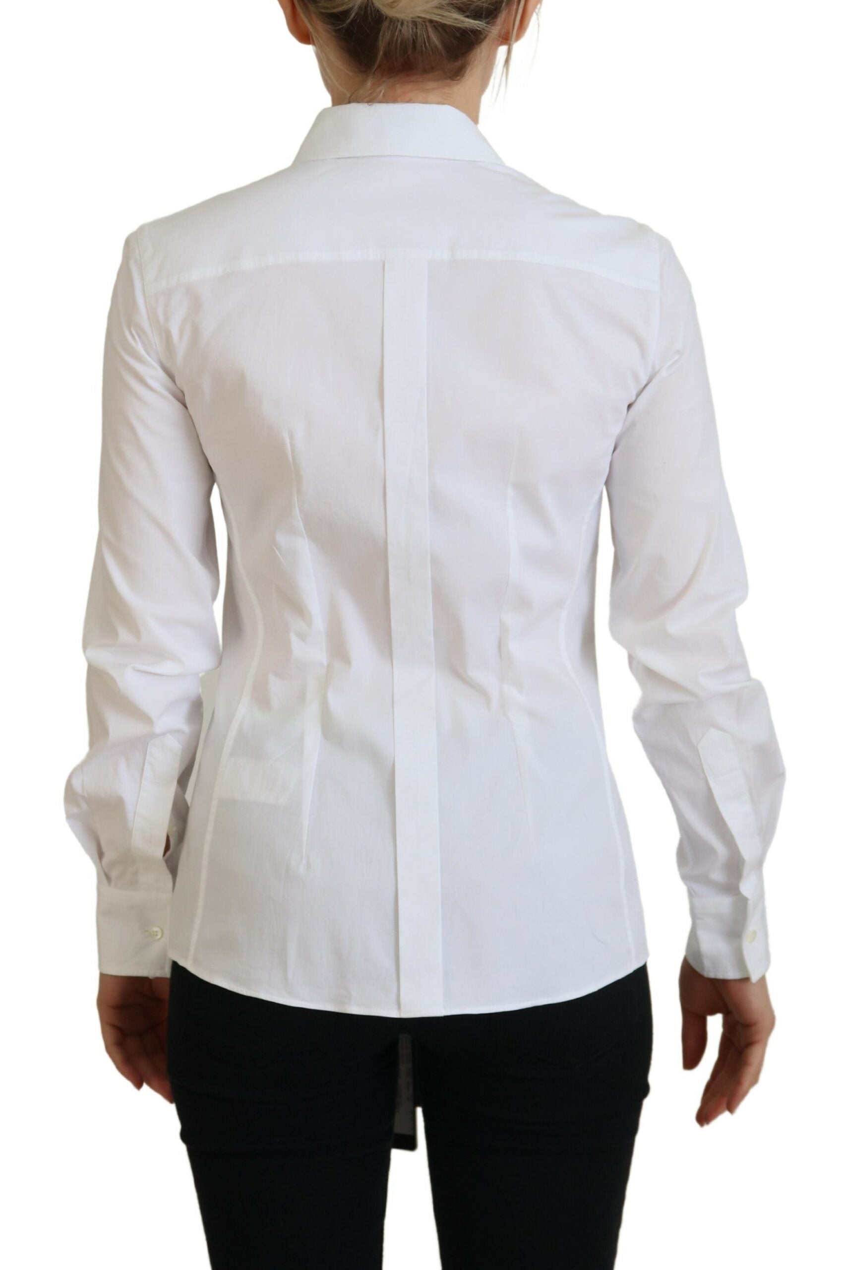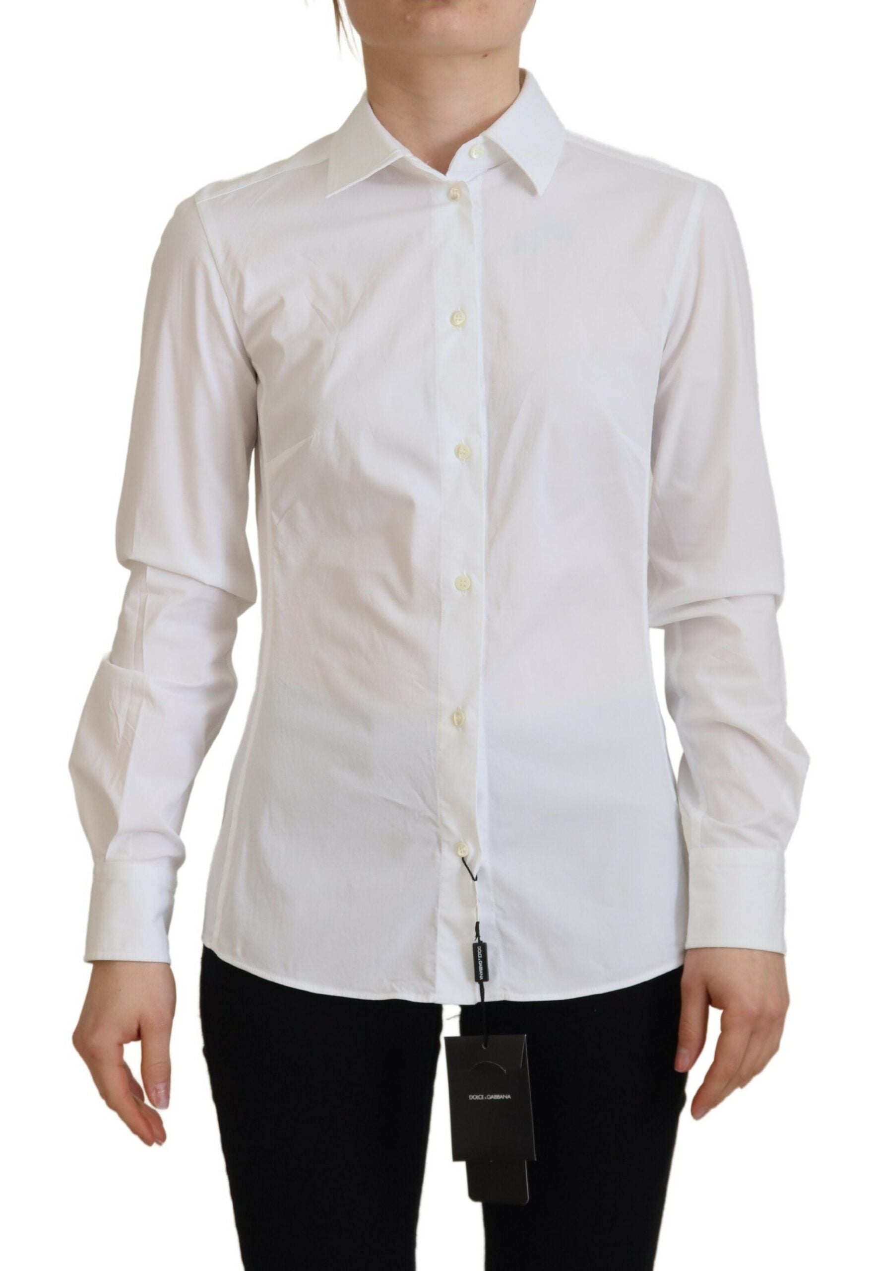 Discover the epitome of Italian sophistication with our pristine white button-up top from Dolce & Gabbana. Crafted from a high-quality blend of cotton and elastane, this top offers both exceptional comfort and a tailored fit. Immaculately designed with the brand’s signature eye for detail, this piece is a versatile addition to any fashion connoisseur’s wardrobe, perfect for elevating your everyday style.