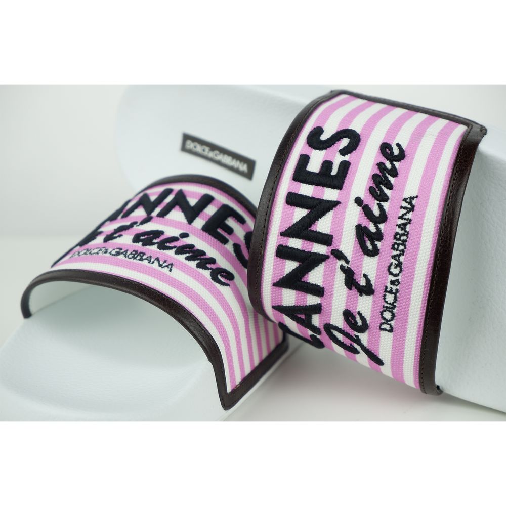 Indulge in the epitome of luxury with these exquisite white slippers from Dolce & Gabbana. Crafted with a blend of high-quality materials, these slippers feature a durable rubber sole, a canvas upper accented with refined calfskin leather details, lending a touch of elegance to your casual wear. Perfectly constructed in Italy, these sandals offer both supreme comfort and style.