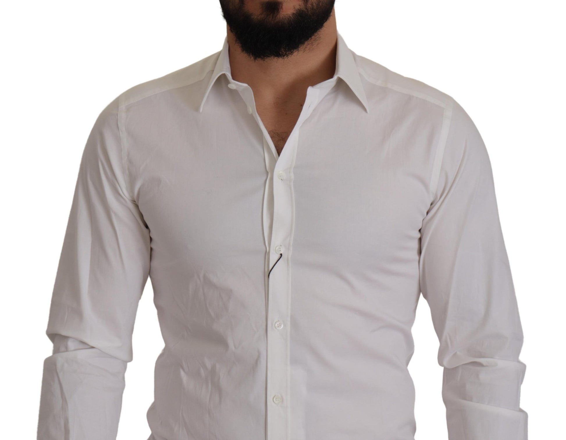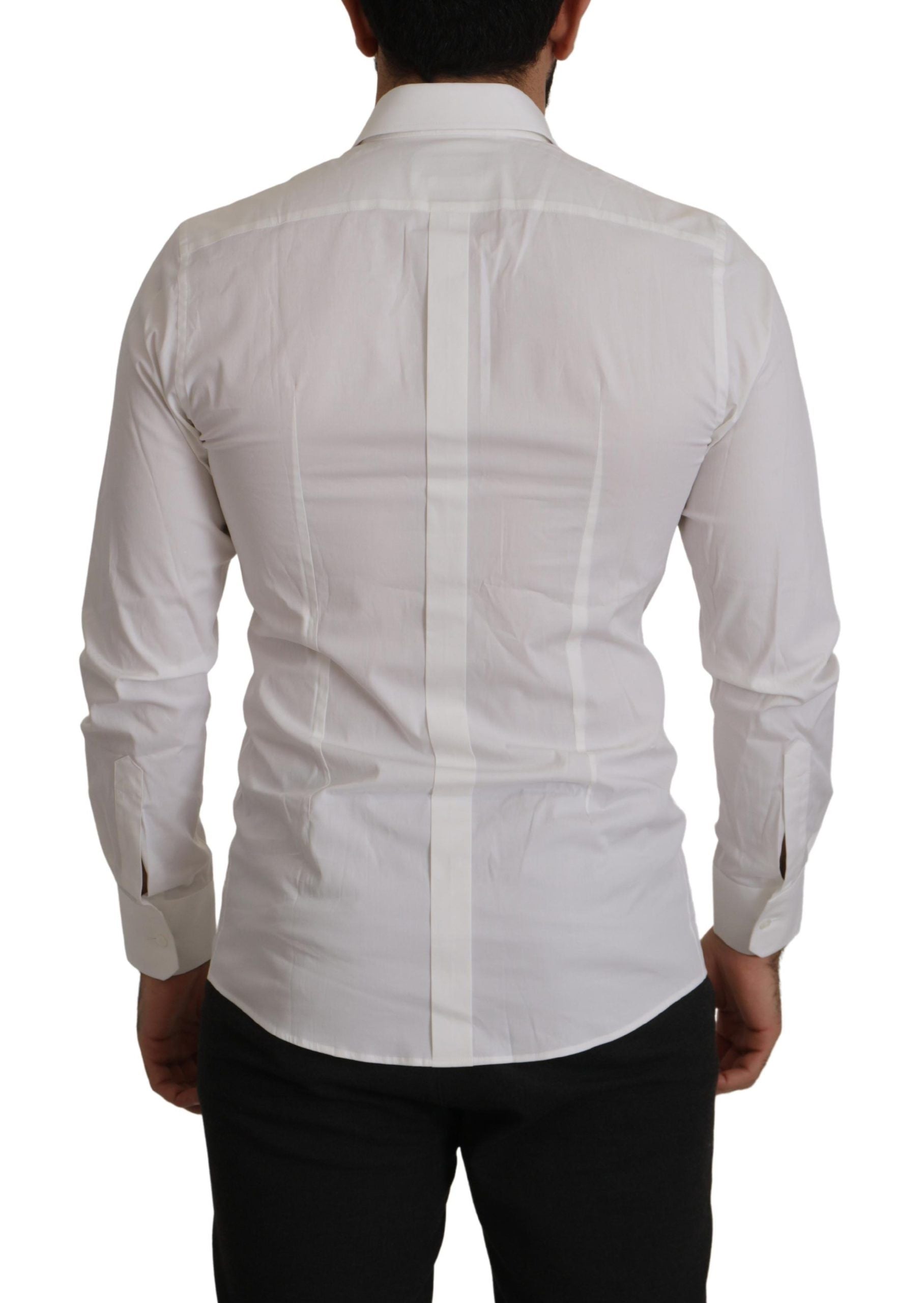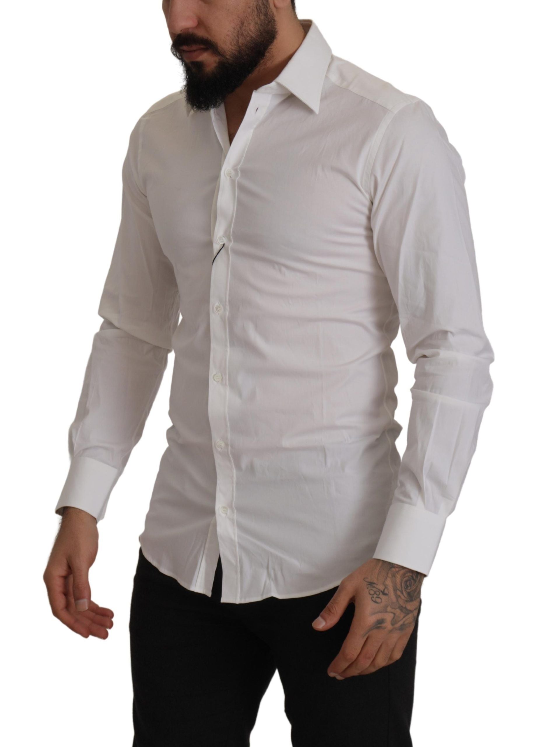Indulge in the epitome of sophistication with our stunning Dolce & Gabbana dress shirt. This piece is a true testament to luxury, perfect for those who appreciate the finer things in life. Crafted from a premium blend of 97% cotton and 3% elastane, it boasts a crisp white color that exudes elegance and class. The slim fit cut ensures a sleek silhouette, while the classic collar, long sleeves, and front button closure offer a timeless look. This shirt is embellished with subtle logo details that speak to its distinguished brand identity—all made in the heart of fashion, Italy.