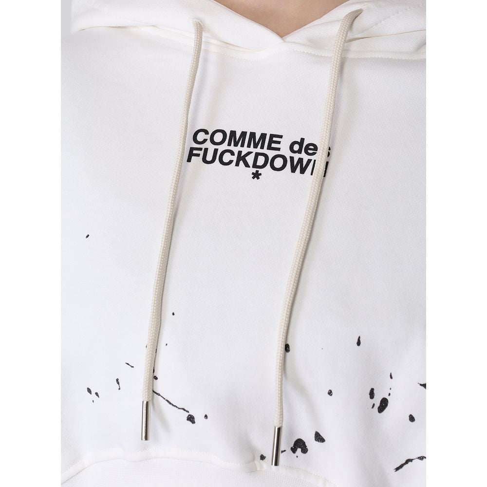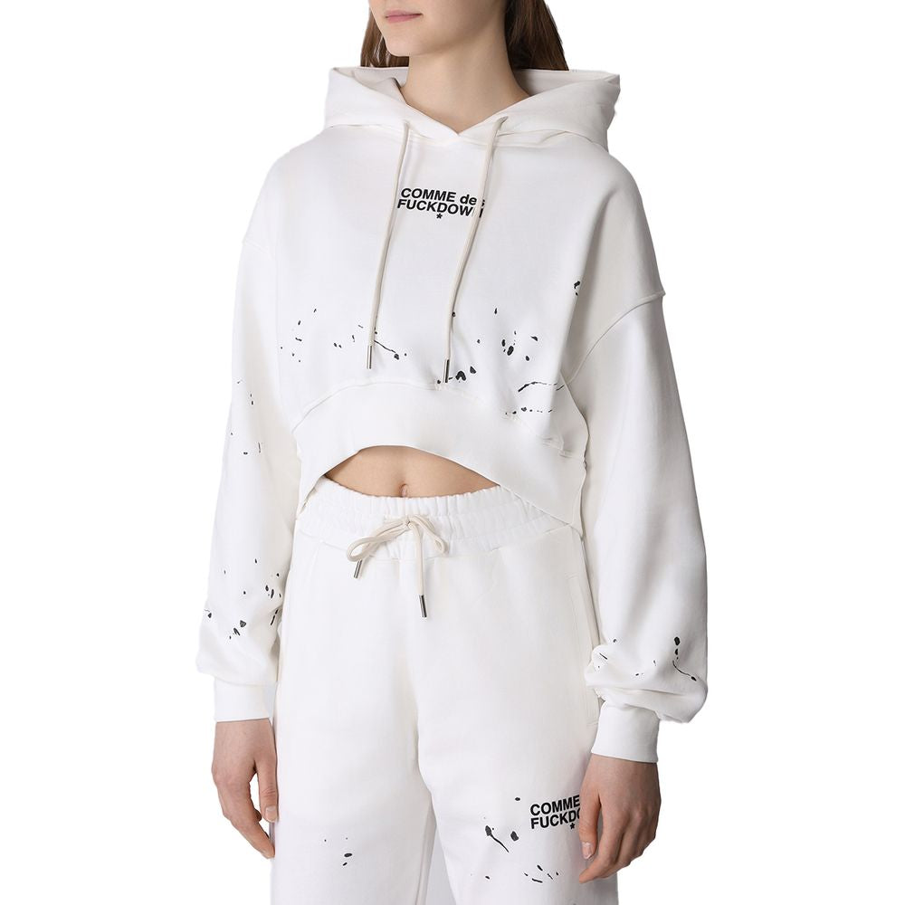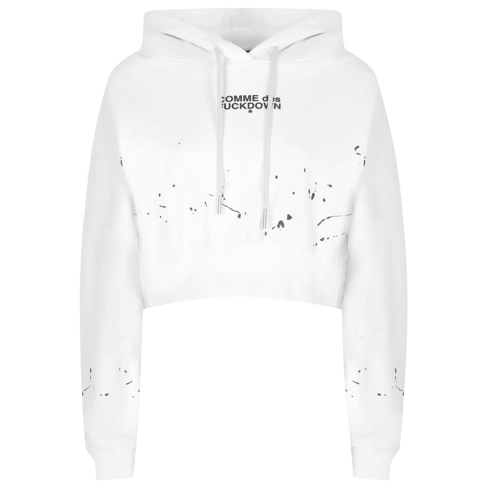 Comme des Fuckdown short cotton hoodie with drawstring hood, logo print and scattered glitter paint spots