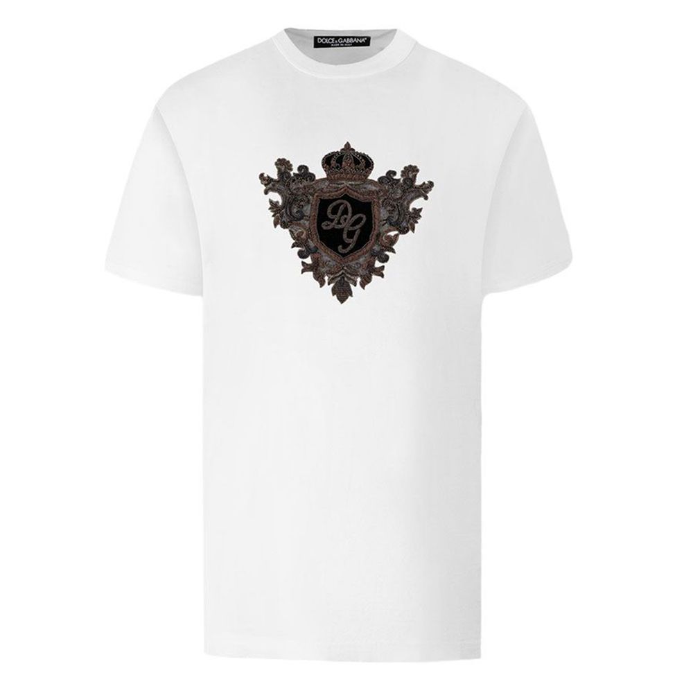 Indulge in the epitome of Italian luxury with this pristine white t-shirt, graced with a distinctive logo application that embodies the Dolce & Gabbana aesthetic. Crafted from the finest 100% cotton fabric for unmatched comfort and style, this tee offers a piece of high fashion made in Italy, promising to elevate your casual wardrobe.