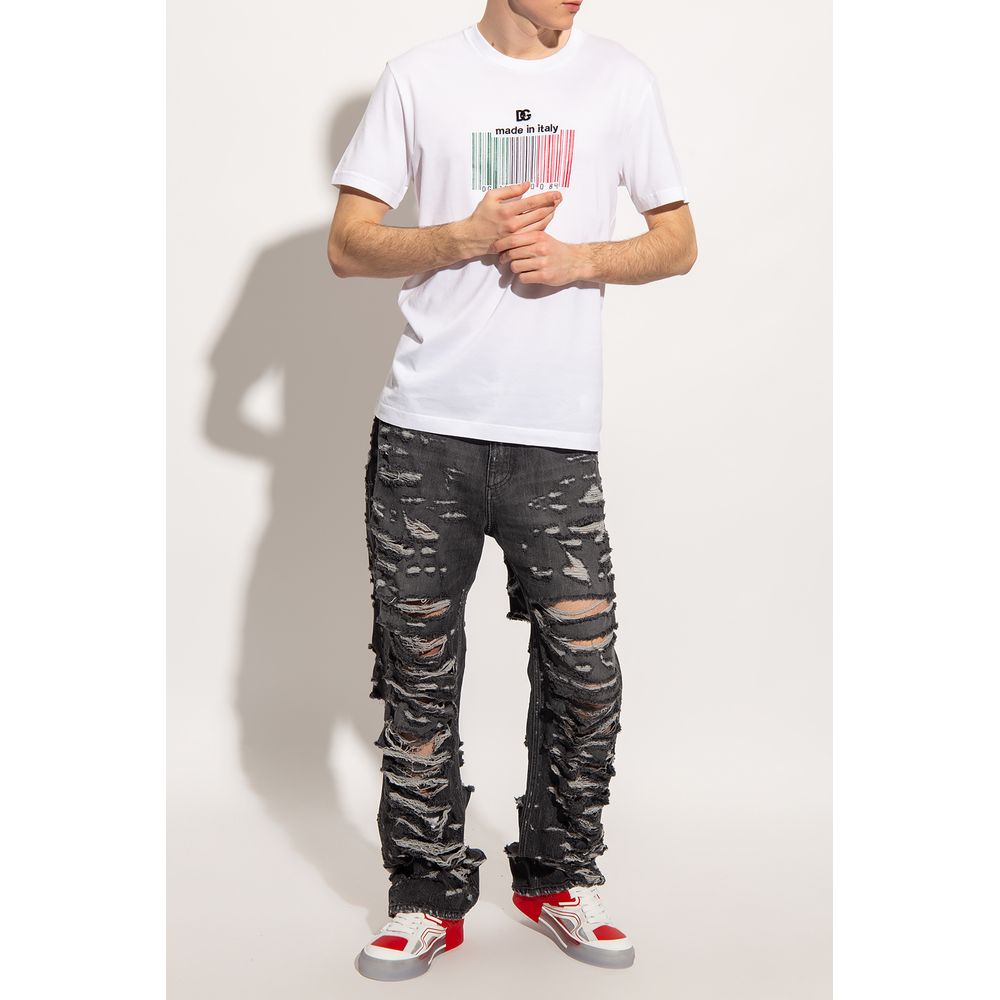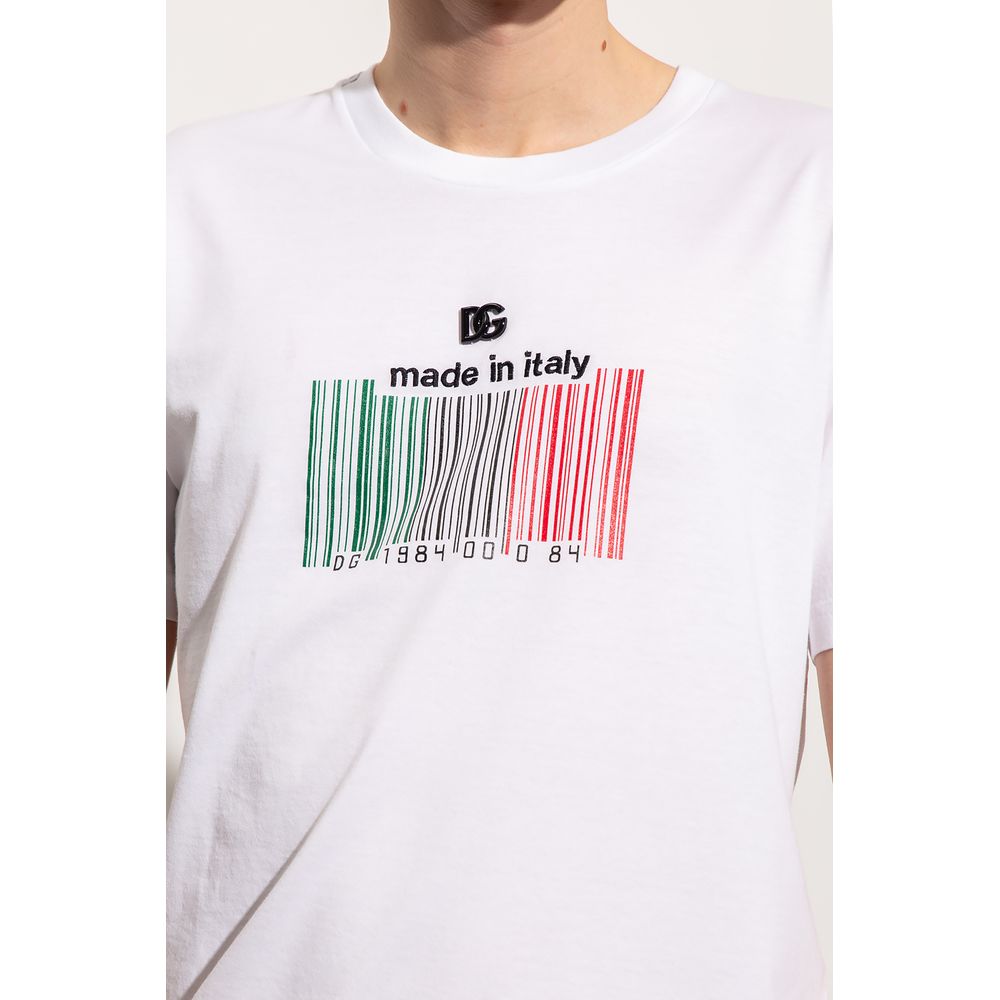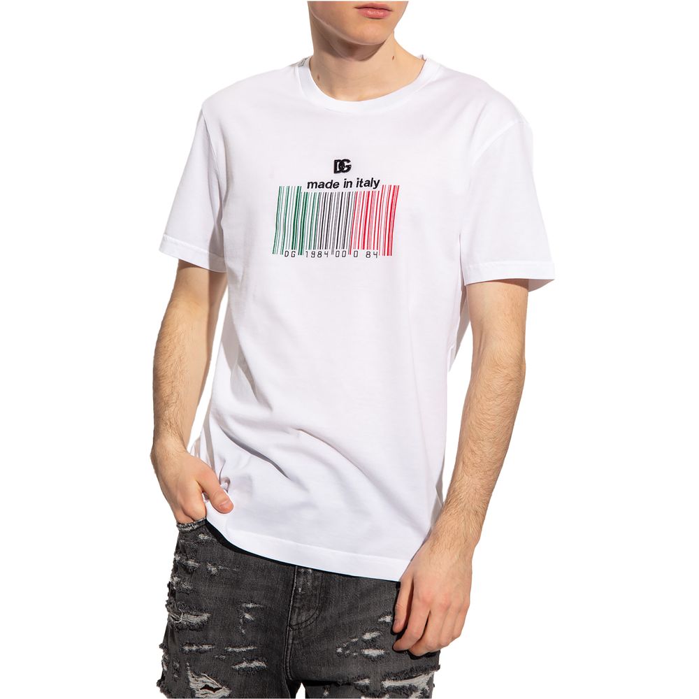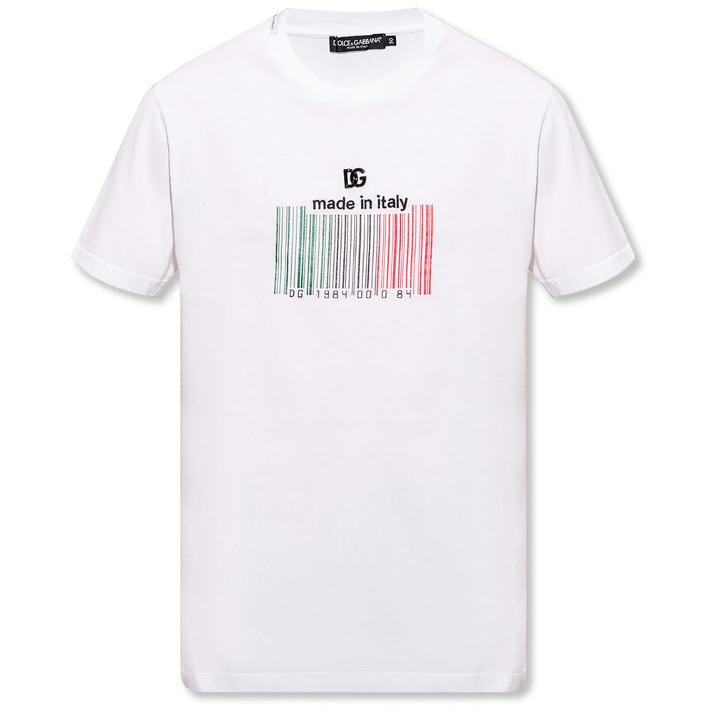 Step into effortless style with our pristine white cotton t-shirt, featuring a unique barcode print front and center. An applied metallic DG logo adds a touch of luxury, while the delicately embroidered script below speaks of the meticulous attention to detail that Dolce & Gabbana is renowned for. Perfect for a casual yet polished look.