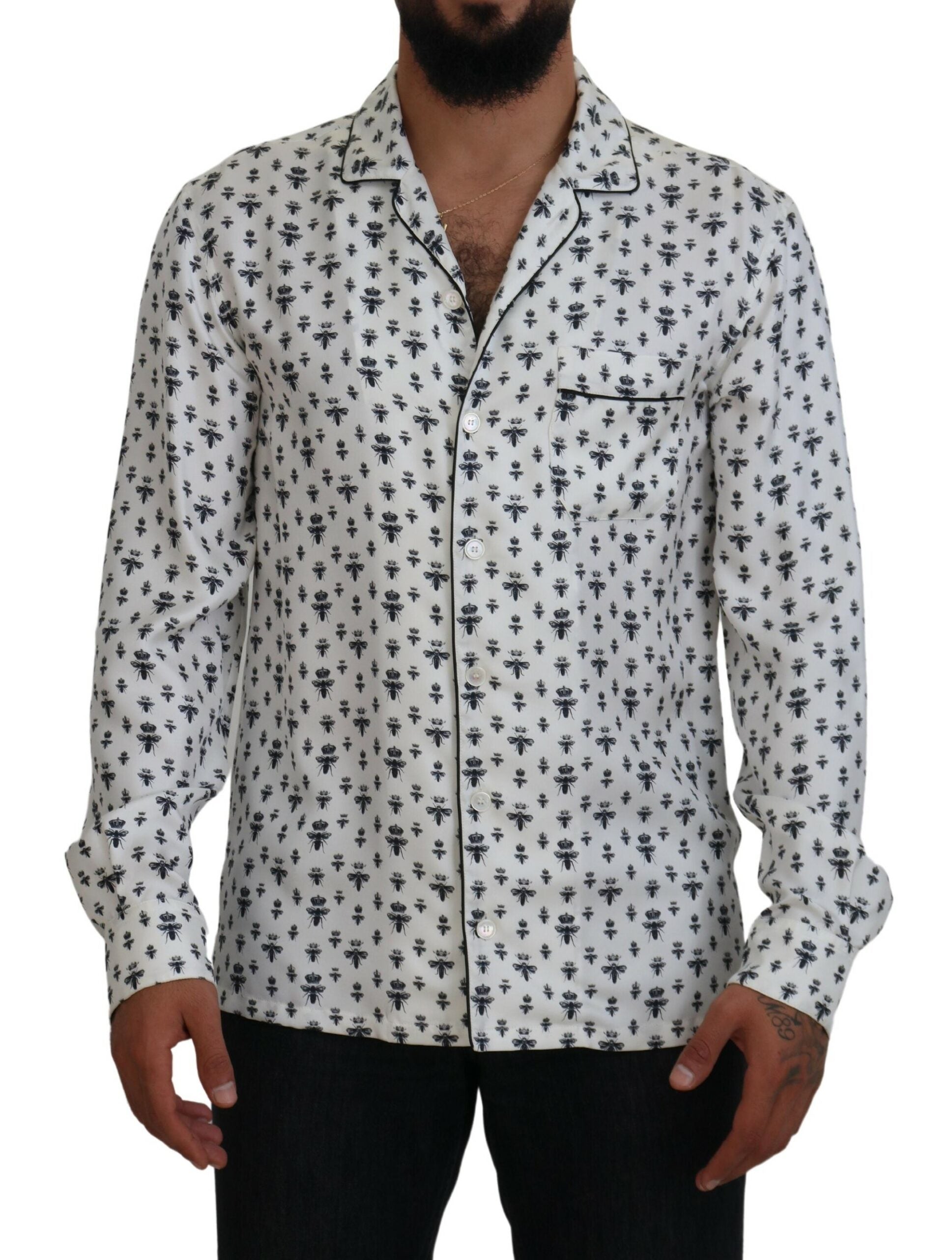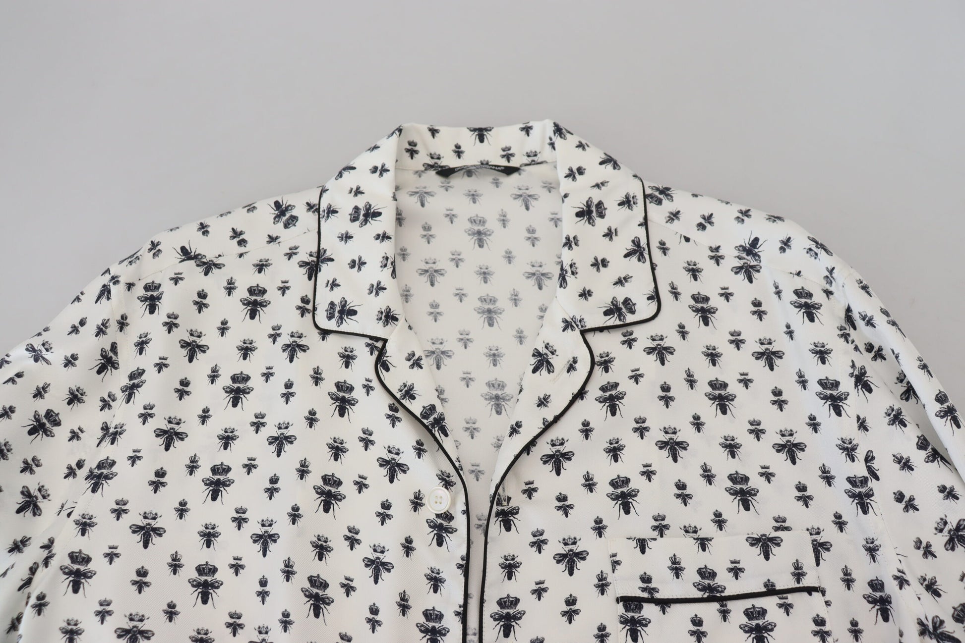 Indulge in the luxurious comfort of a 100% Authentic Dolce & Gabbana pajama top. Elegantly designed with a subtle crown bee print on an off white canvas, this top exudes sophistication with its classic neck and long sleeves. A front button closure ensures a secure and stylish fit, making it an exquisite addition to your loungewear collection. Crafted in Italy with impeccable attention to detail, it is a testament to the exceptional quality of Dolce & Gabbana.
