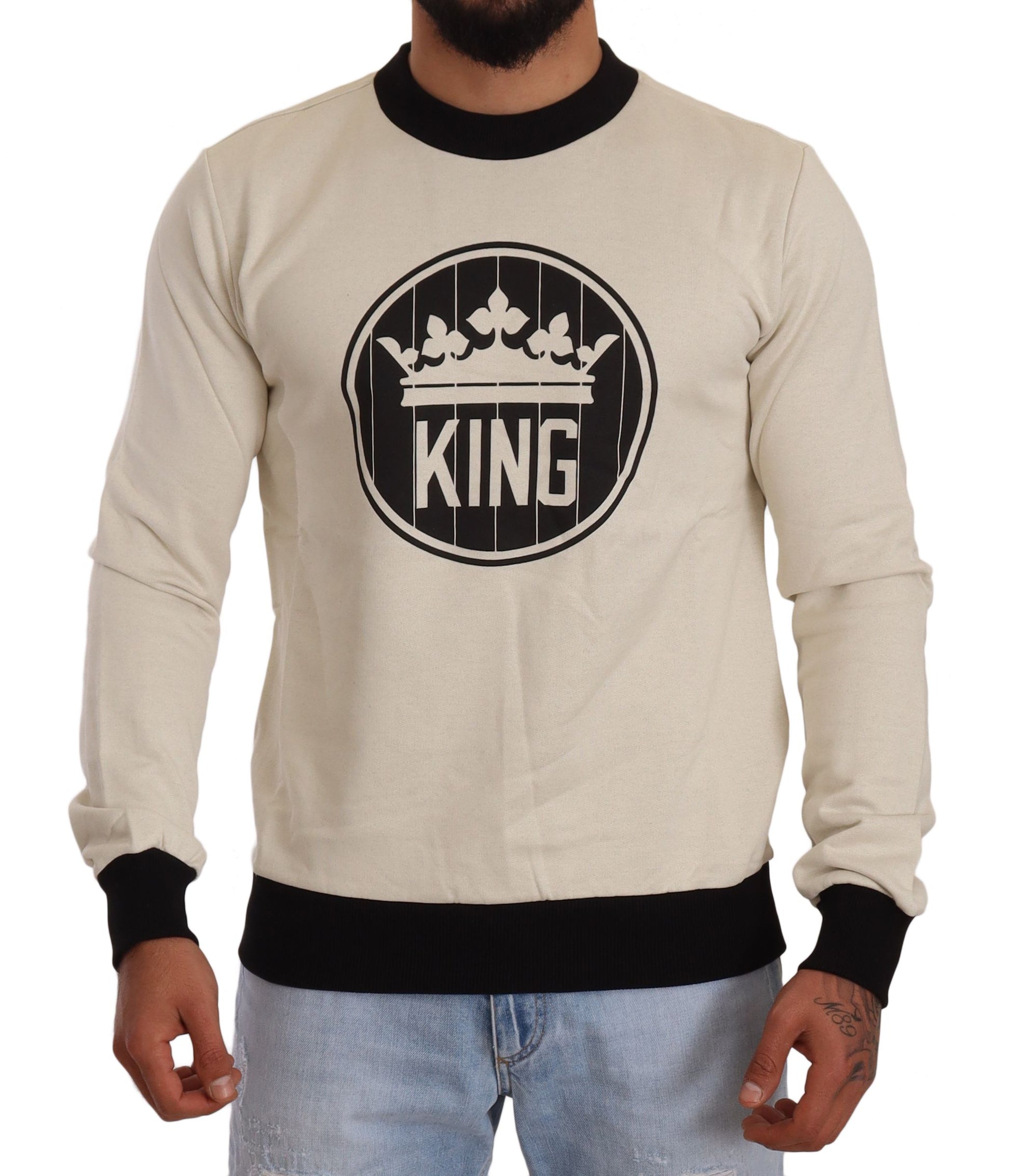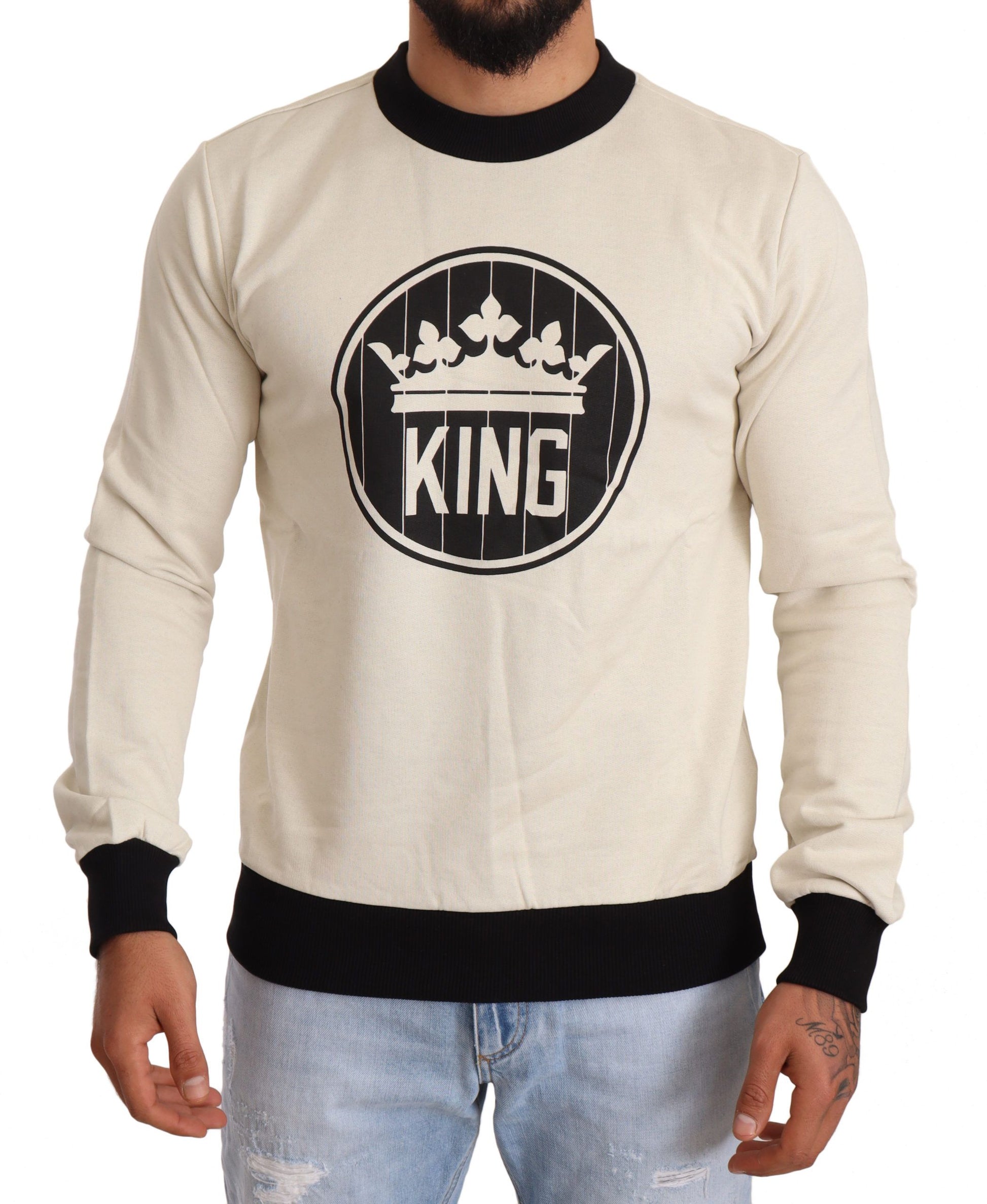 Indulge in the epitome of luxury with this Dolce & Gabbana iconic crewneck sweater. An elegant white and black design, adorned with a sophisticated King crown motif, this piece promises to elevate your wardrobe with its regal charm. Crafted in Italy from the finest 100% cotton, it delivers both comfort and style. Perfect for those who appreciate the blend of modern elegance and classic grandeur.