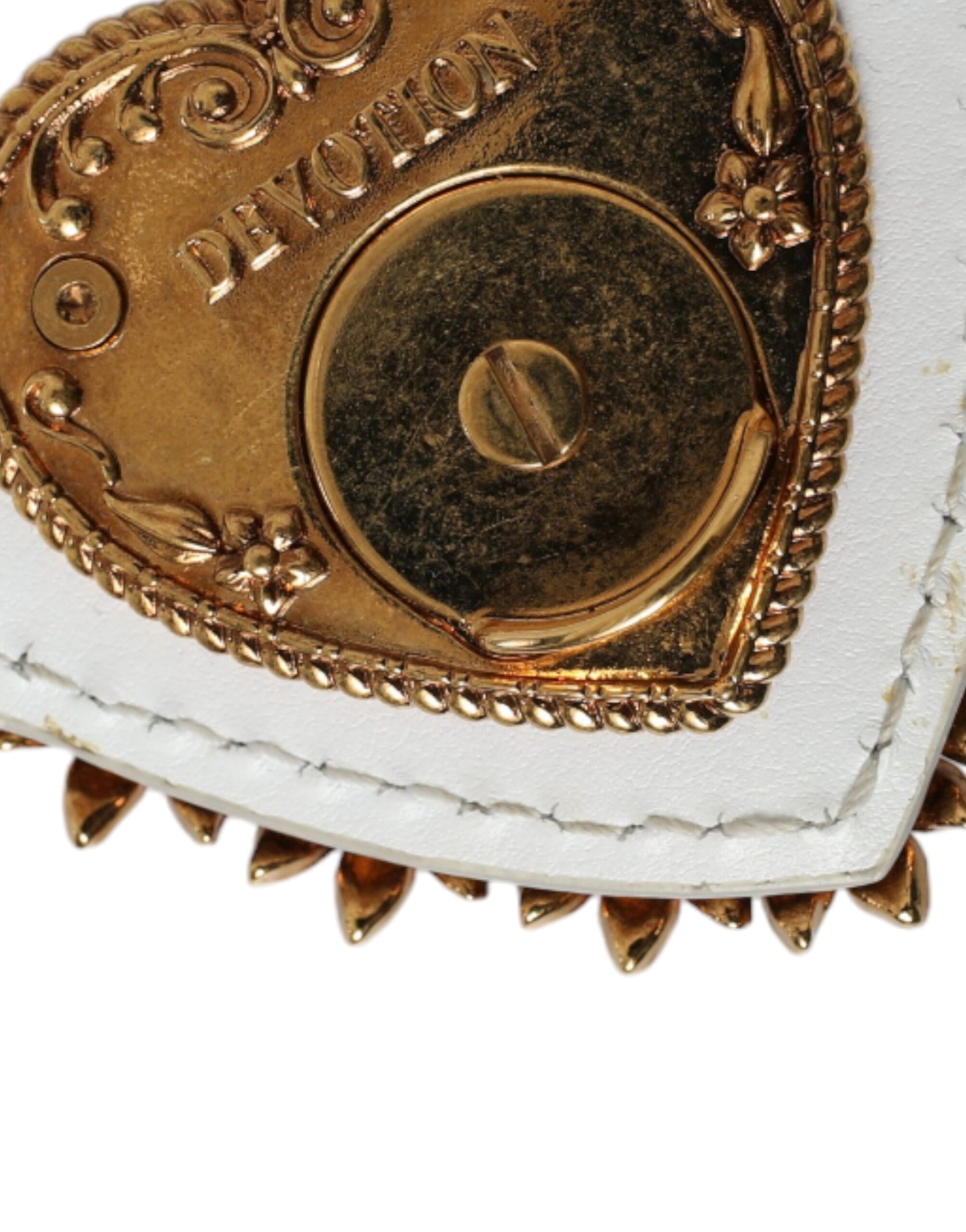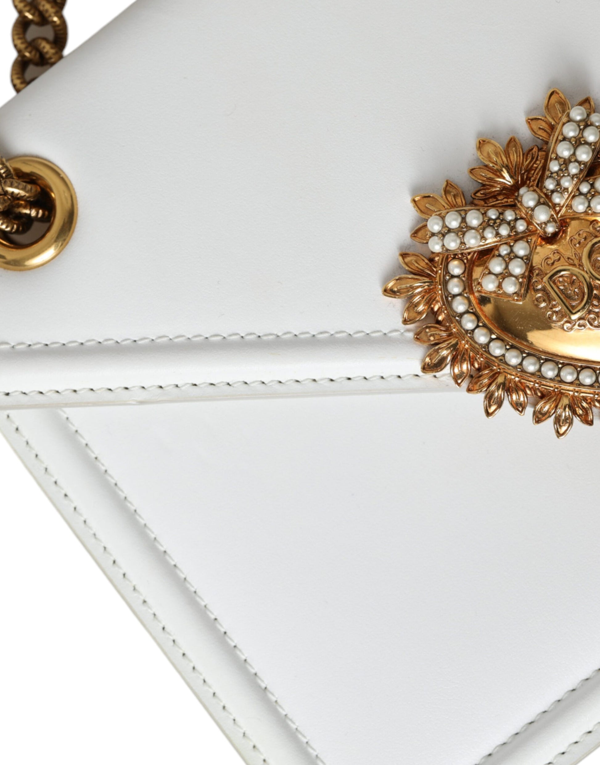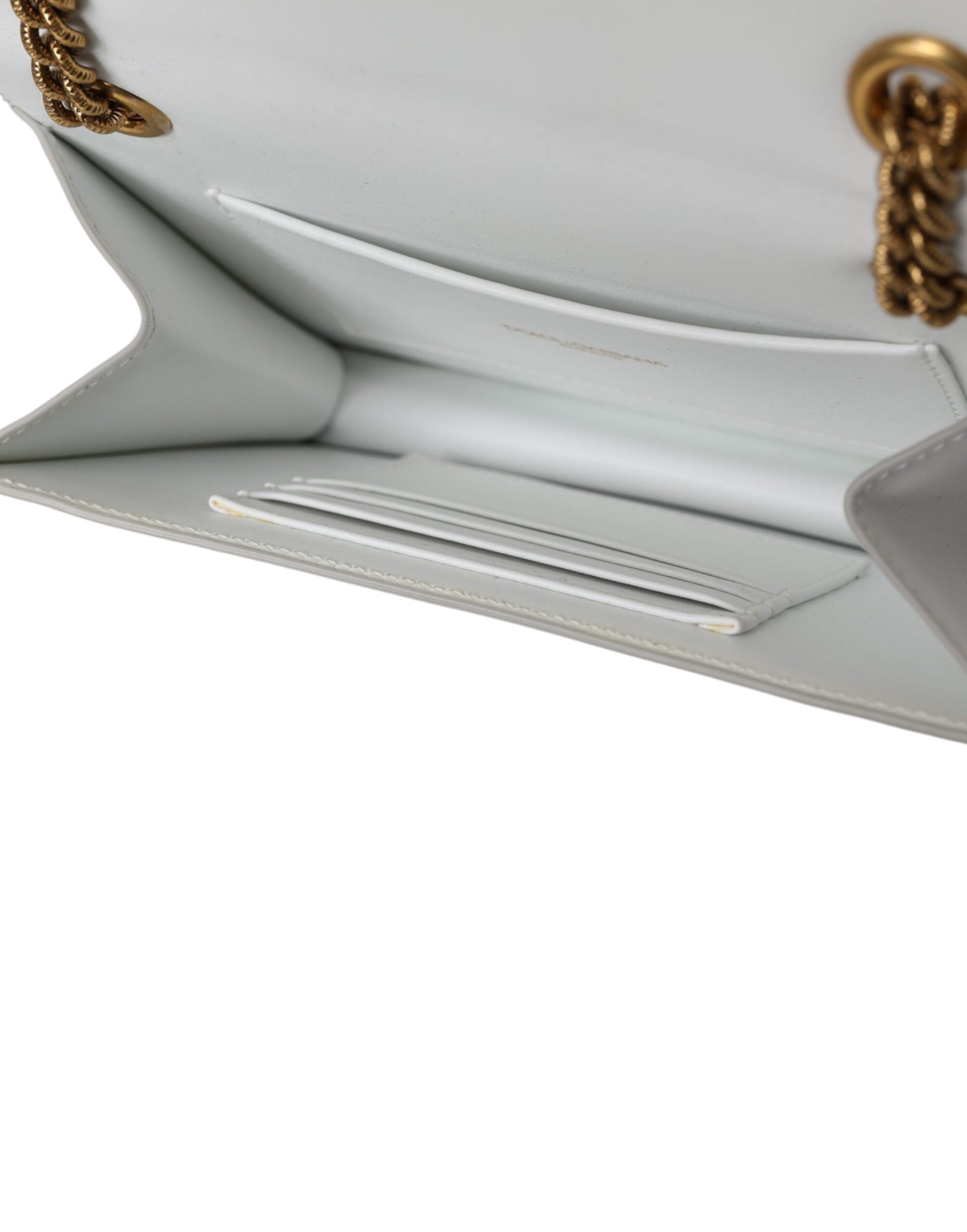 Discover elegance with the ‘Devotion’ small envelope top handle bag, crafted from the finest 100% calfskin leather by the renowned Dolce & Gabbana. This luxurious white bag with gold metal detailing embodies sophistication. A chic shoulder chain strap and white inner lining complement the magnetic closure, ensuring your essentials remain secure. Each detail, including the logo-engraved hardware, speaks to the exclusive high craftsmanship that hails directly from Italy. A perfect blend of style and practicality with dimensions that make it a versatile piece for any occasion.
