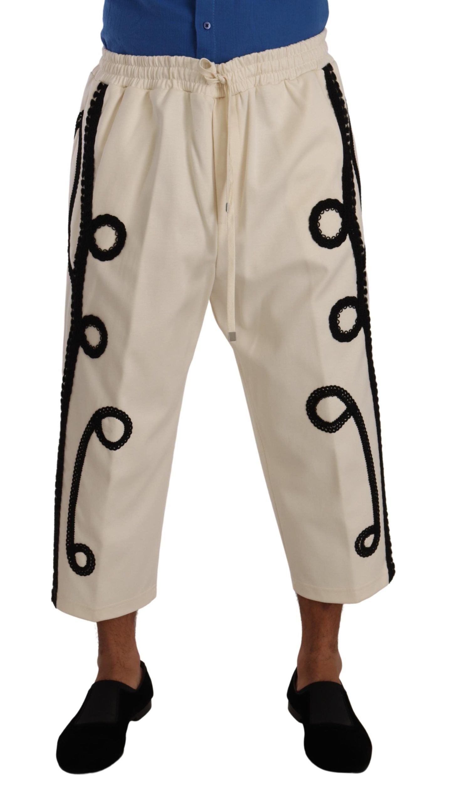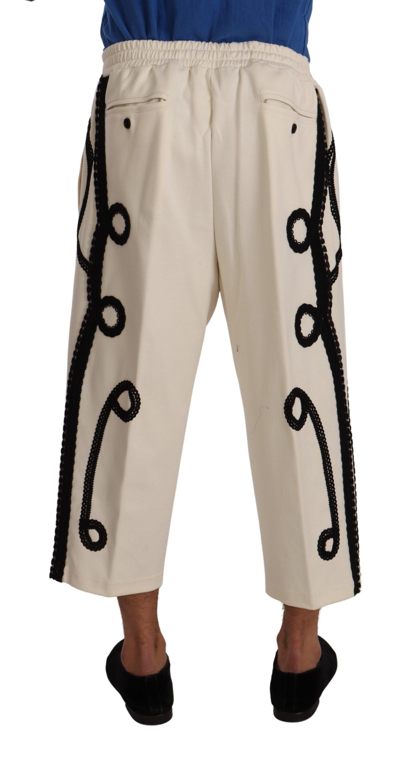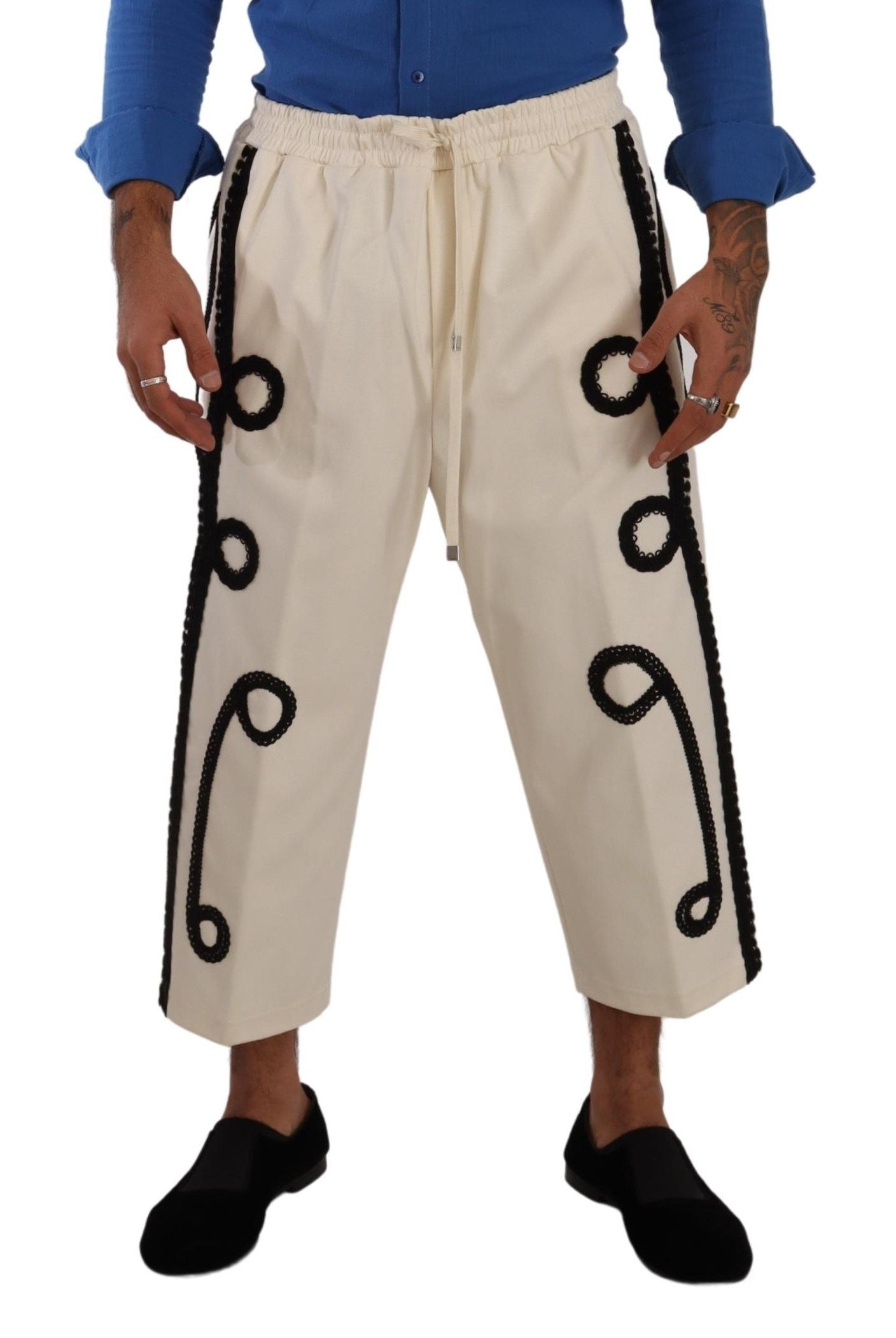 Discover the epitome of Italian luxury with these Dolce & Gabbana Cropped Pants. These pants are brand new with tags, ensuring you receive a pristine product. Featuring the iconic Torero motifs and a striking off-white with black detailing, they seamlessly blend classic charm with on-trend style. Designed for a regular fit, they embody a sophisticated aesthetic while providing comfort. Perfect for fashion-forward individuals who appreciate high-quality craftsmanship.