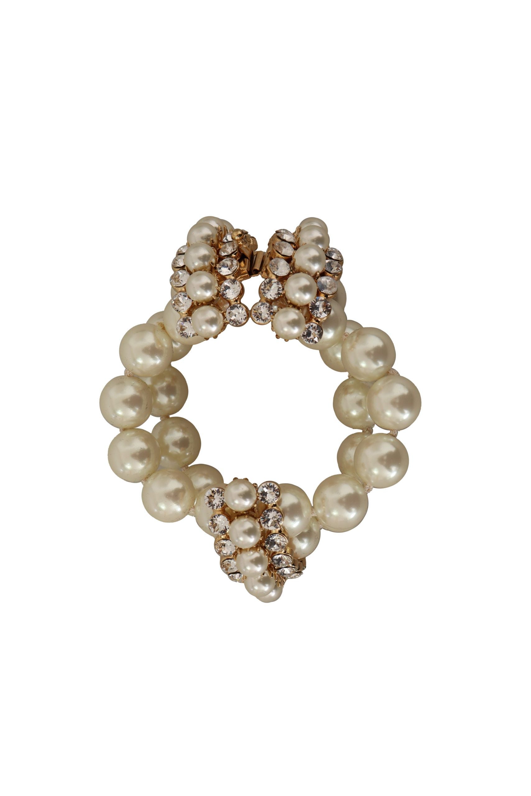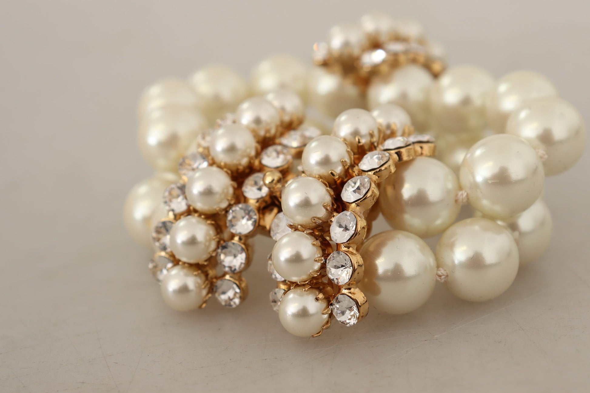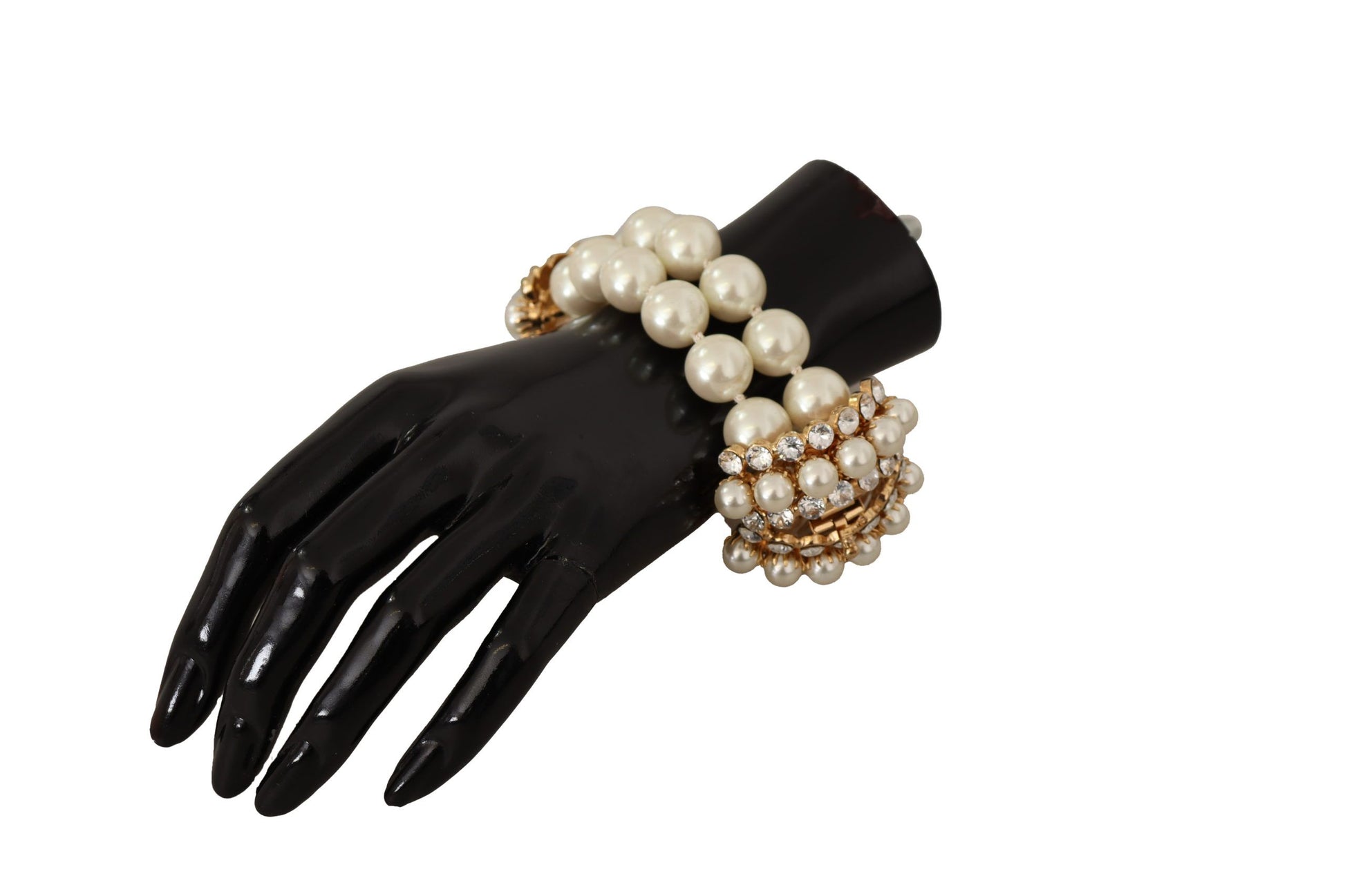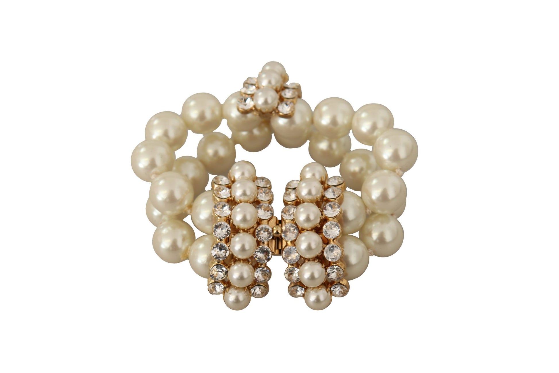 Indulge in the epitome of elegance with this exquisite faux pearl charm bracelet by Dolce & Gabbana. Beautifully crafted with a blend of sparkling glass and radiant brass, complemented by white faux pearls, this bracelet is a testament to sophistication and style. Its clear crystals add a touch of glamour, making it perfect for any occasion where you want to make an unforgettable impression.