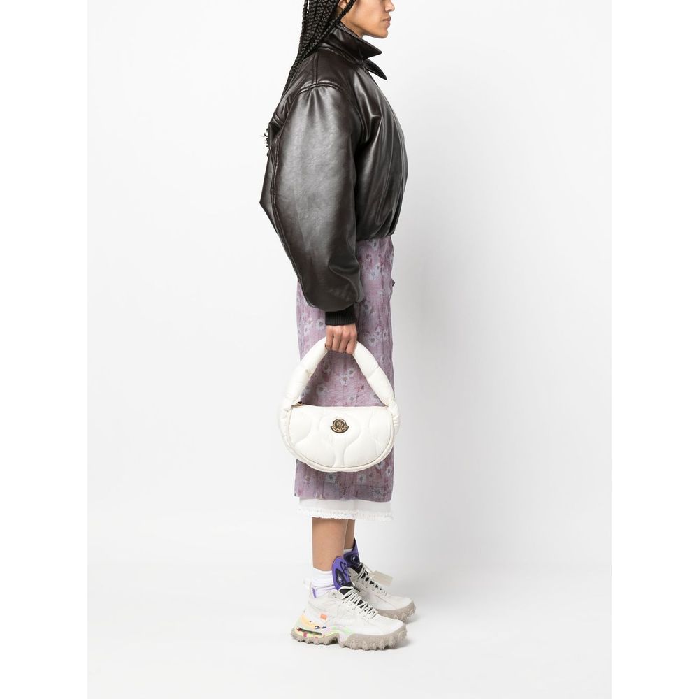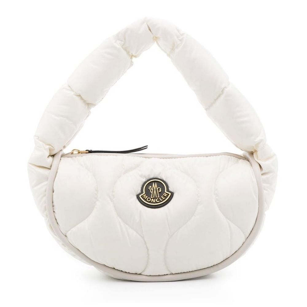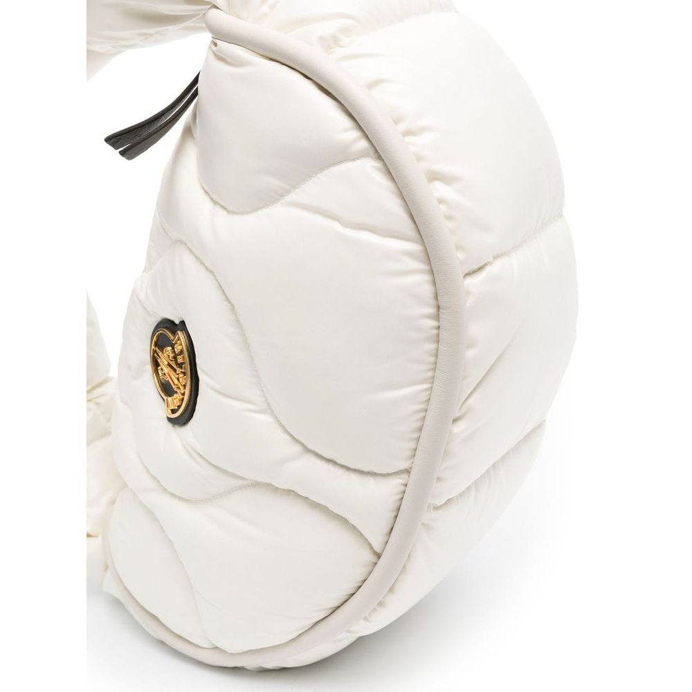 Embrace elegance with this chic and luxurious hobo bag, perfect for the woman who covets fashion that speaks in subtle opulence. Crafted from snowy white nylon and generously padded with feather, this bag evokes the sensation of a serene winter escape. Complemented with smooth black leather trim, it’s an ensemble of contrast that demands attention without trying. Gold-colored metalwork adds a hint of glamour, while the zipper closure ensures your belongings are secure. The nylon-lined interior comes complete with a flat pocket for organizing essentials. The bag’s crowning glory is the front-applied logo patch, a testament to its fine craftsmanship and style statement.