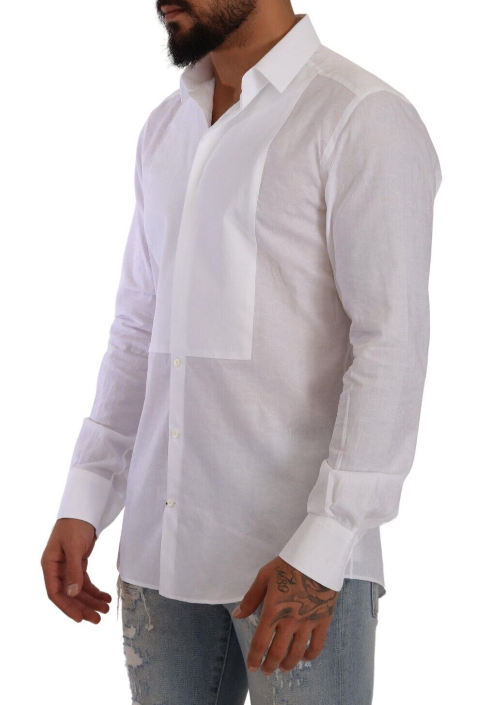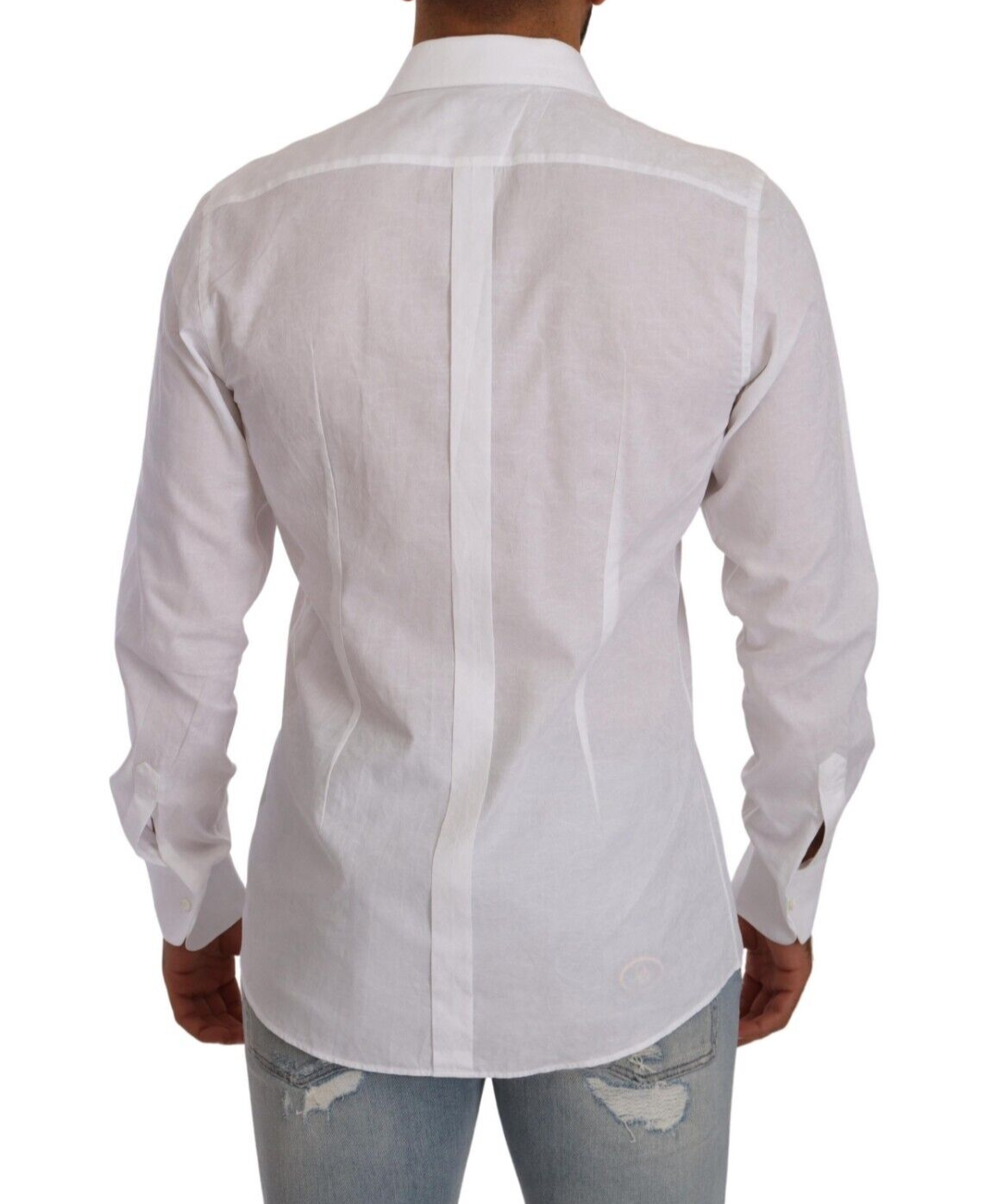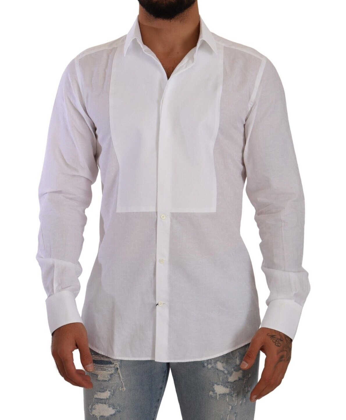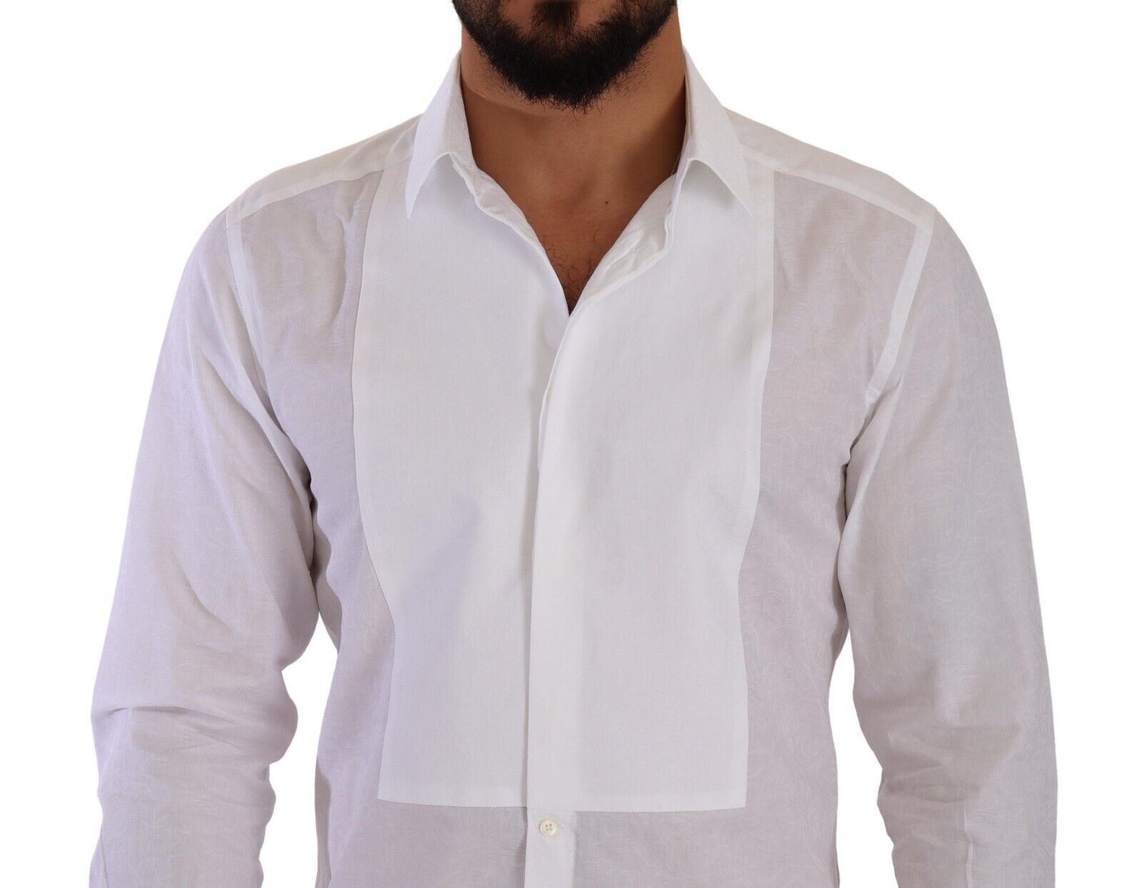 Step into the world of high fashion with this stunning Dolce & Gabbana dress shirt, crafted from the finest 100% cotton. Perfect for the discerning gentleman, this white shirt with a delightful floral baroque pattern boasts a sharp, slim fit cut. It features an exquisite pleated plastron which, combined with the elegant spread collar and the meticulous back yoke and box pleat, adds a touch of sartorial elegance to your wardrobe. Finished with one-button cuffs and front button closure, this shirt is an epitome of the brand’s attention to detail and impeccable style.