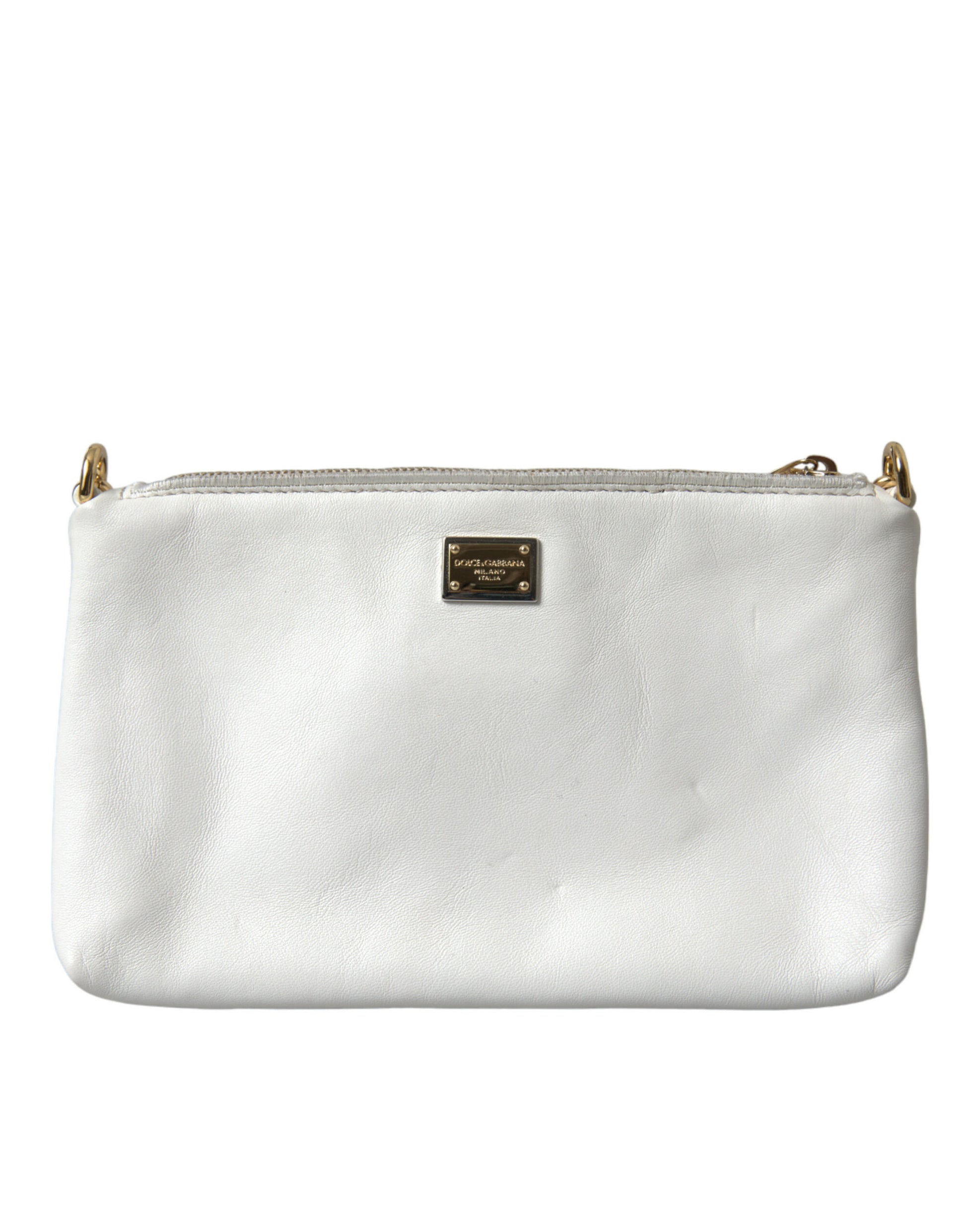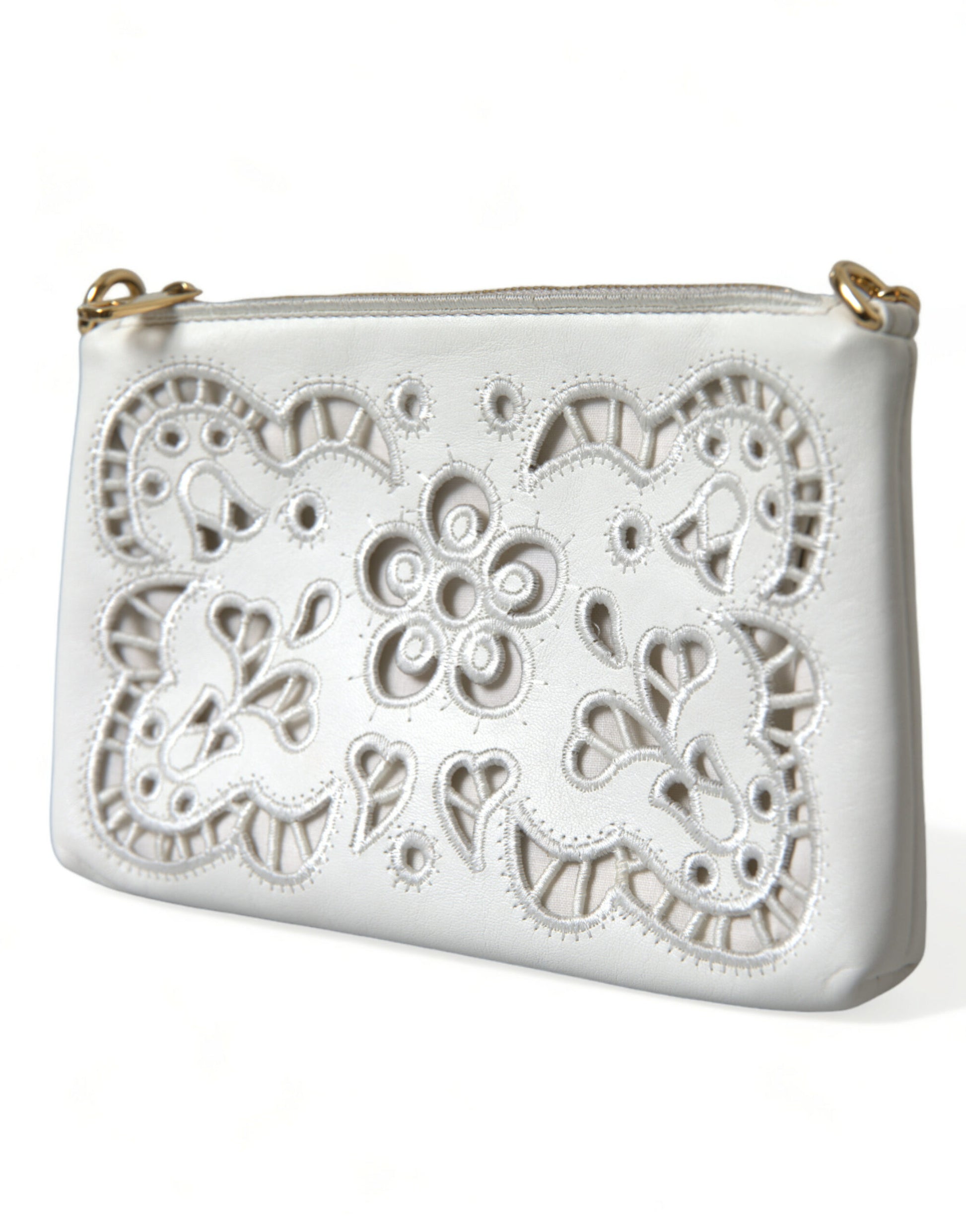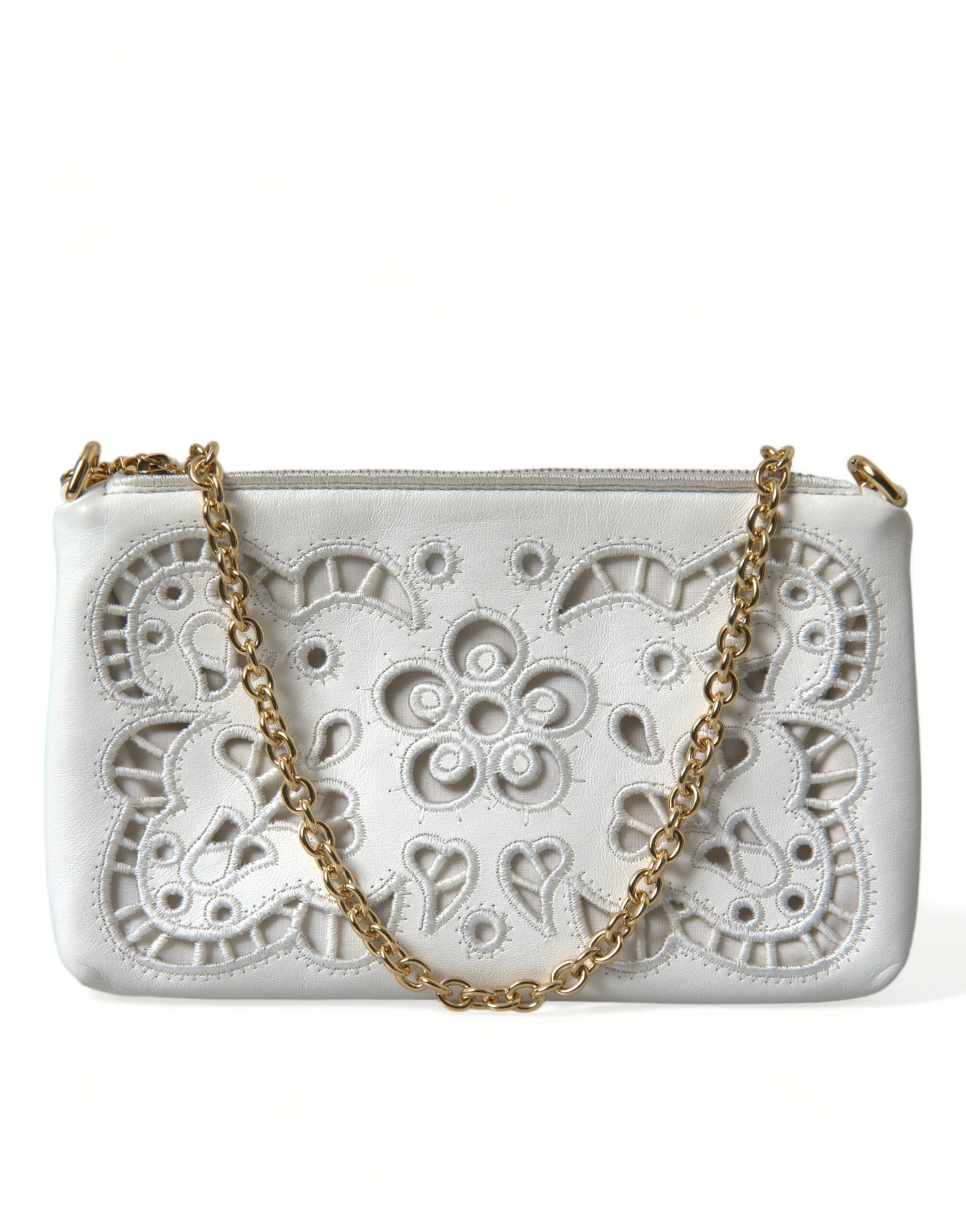 Indulge in the elegance of this exquisitely crafted leather clutch by Dolce & Gabbana, adorned with a graceful floral embroidery and a polished gold-tone metal chain handle. This luxurious accessory is a perfect blend of classic charm and modern sophistication, complete with a secure top zip and the subtle glamour of a tonal logo plaque.