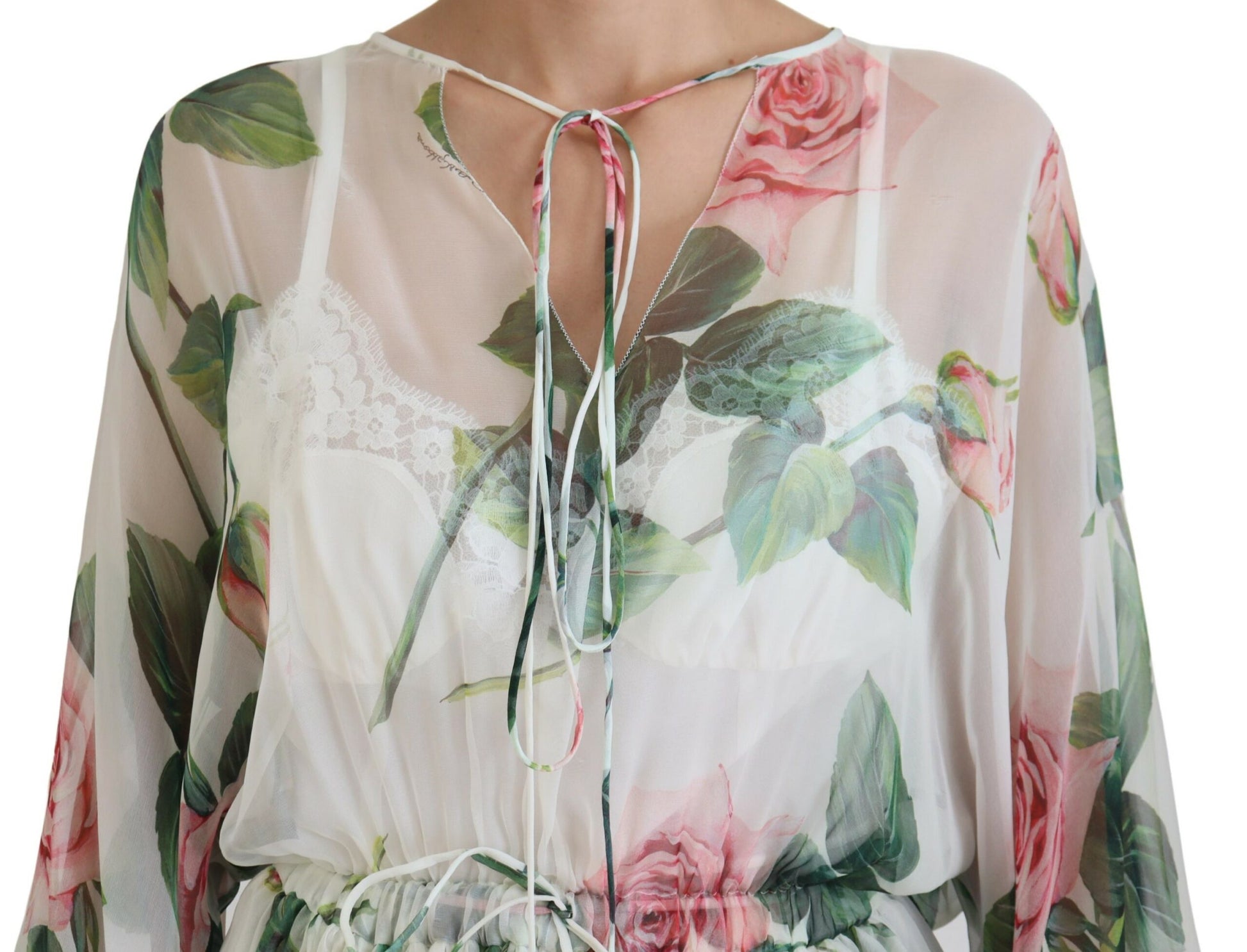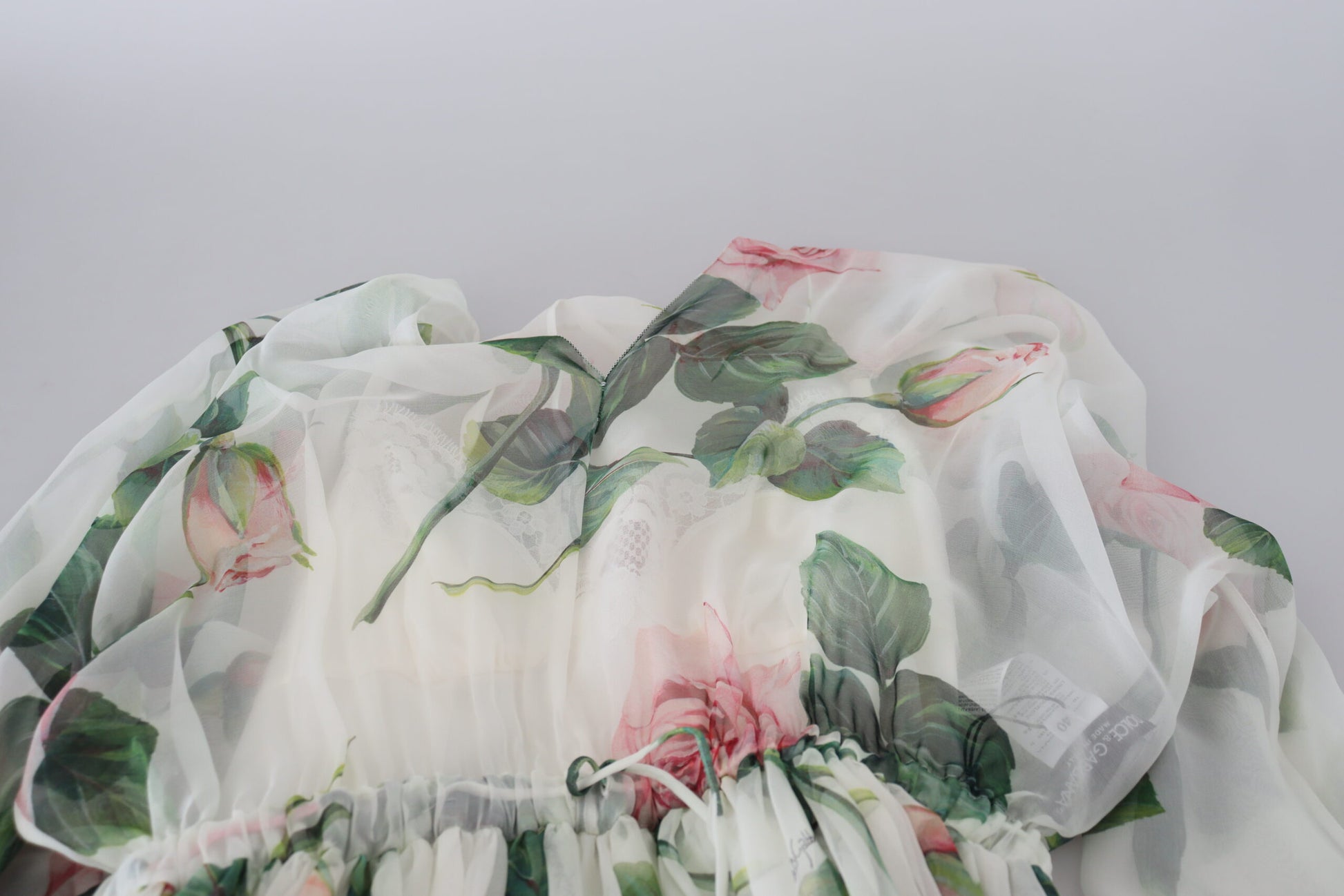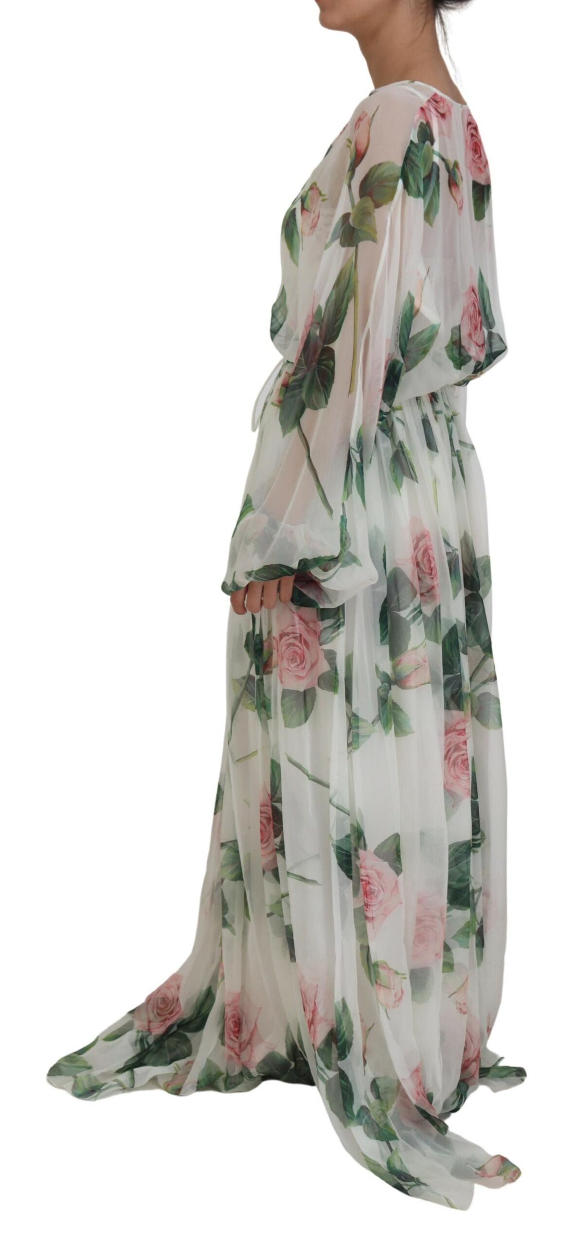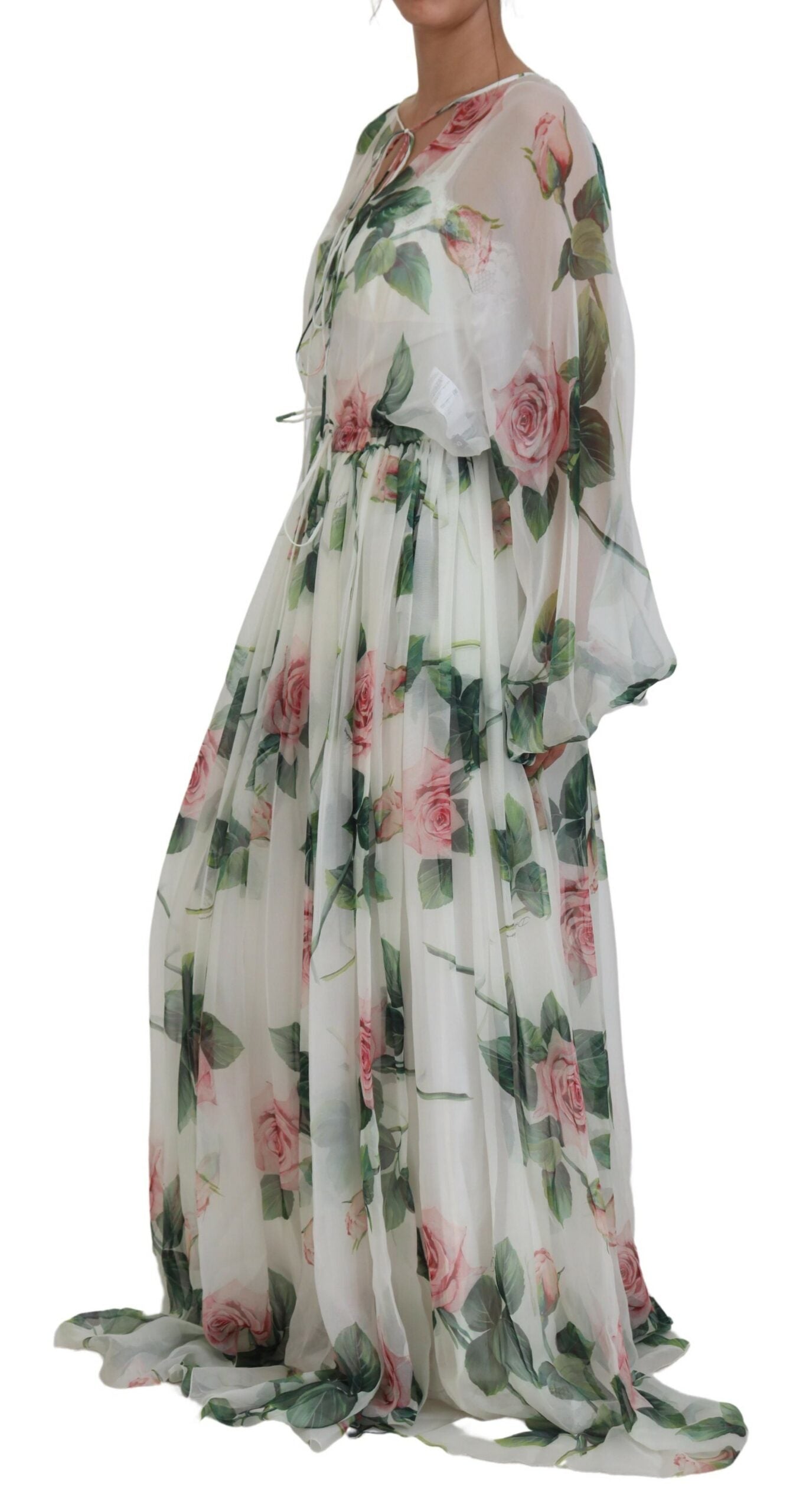 Step into the essence of elegance with this brand new, tag-attached, floor-length maxi dress from Dolce & Gabbana. A vision of grace in white, adorned with a romantic pink roses print that exudes femininity. The dress is designed to make a statement with its elastic sleeve ends and a charming neckline accentuated by a delicate ribbon. Ensuring a perfect silhouette with its thoughtful zip and hook closure, this dress is a pure blend of luxury and style.