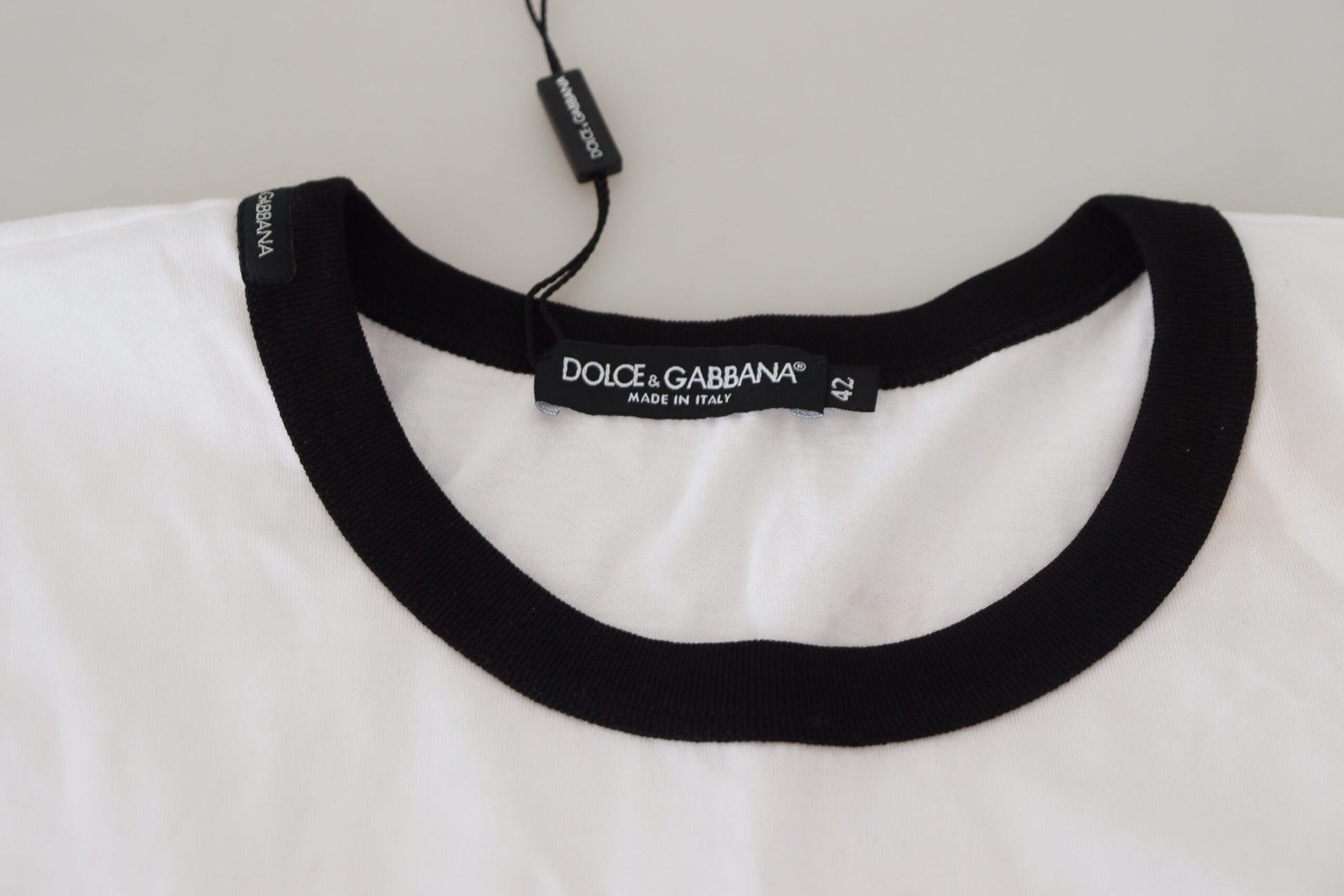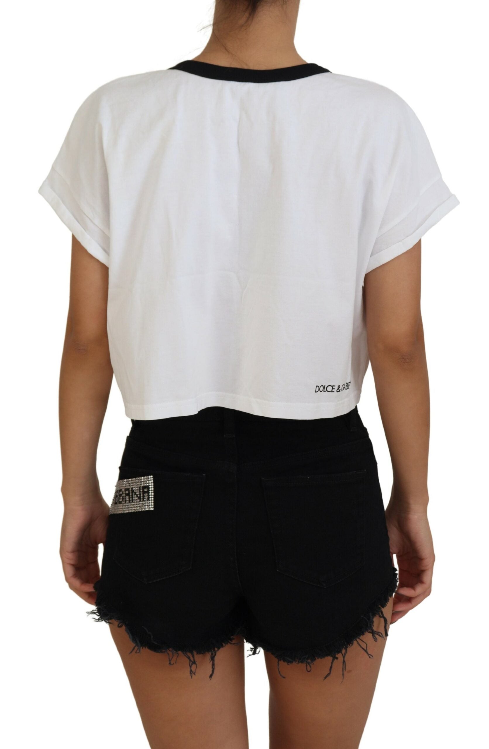 Step into chic comfort with this stunning, 100% authentic white cotton short sleeves crop top tee from Dolce & Gabbana. This gorgeous top is a brand new addition to your wardrobe, complete with tags and exuding Italian craftsmanship. The crisp white color is paired with a stylish logo detail that accentuates the brand’s iconic luxury aesthetic, perfect for a fashion-forward summer look.
