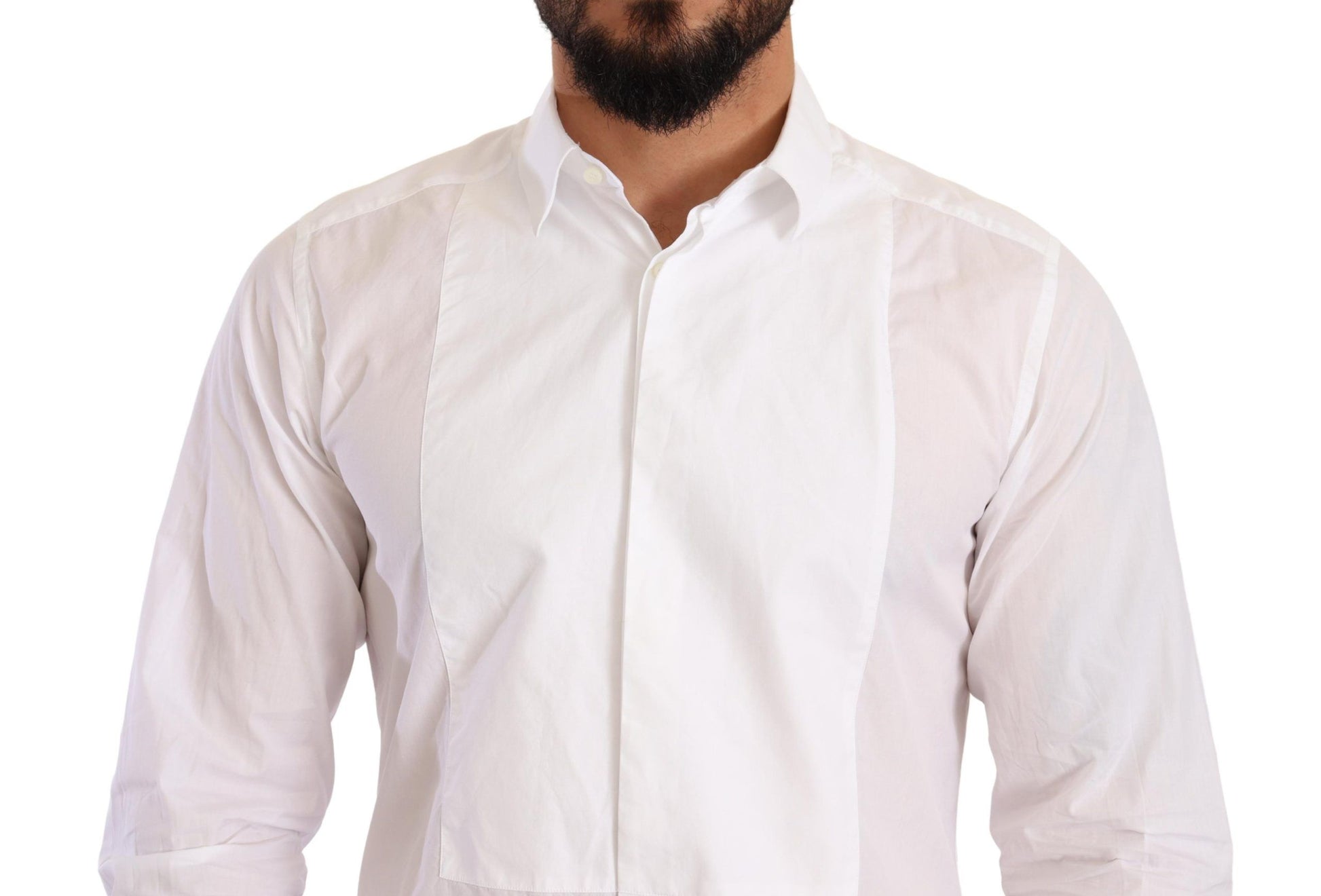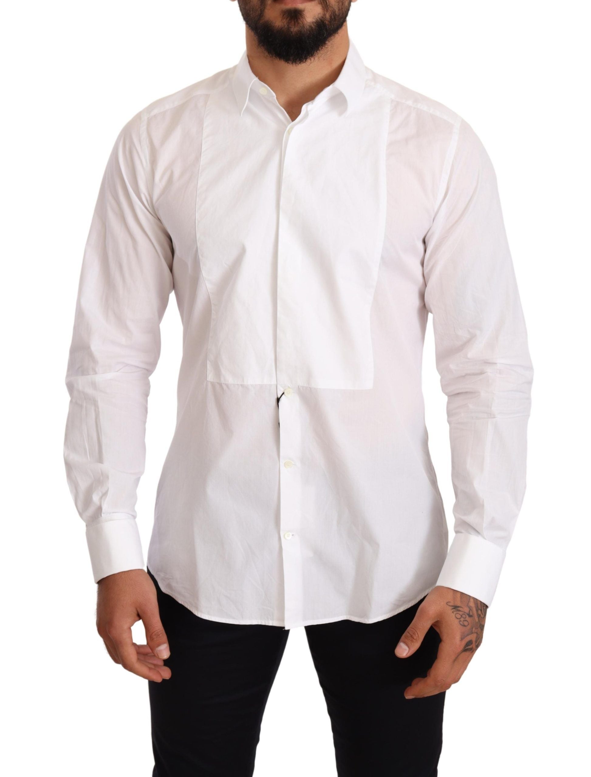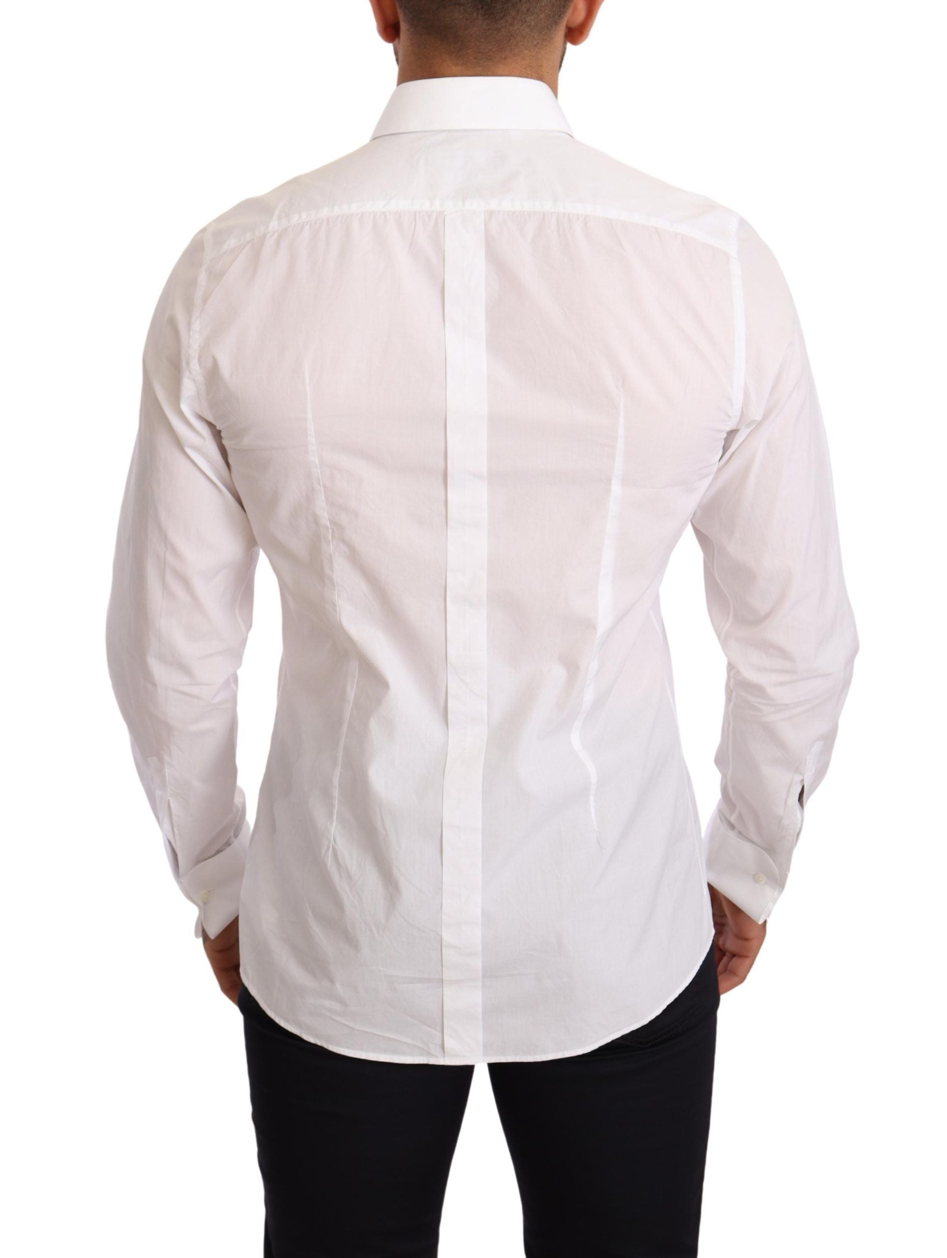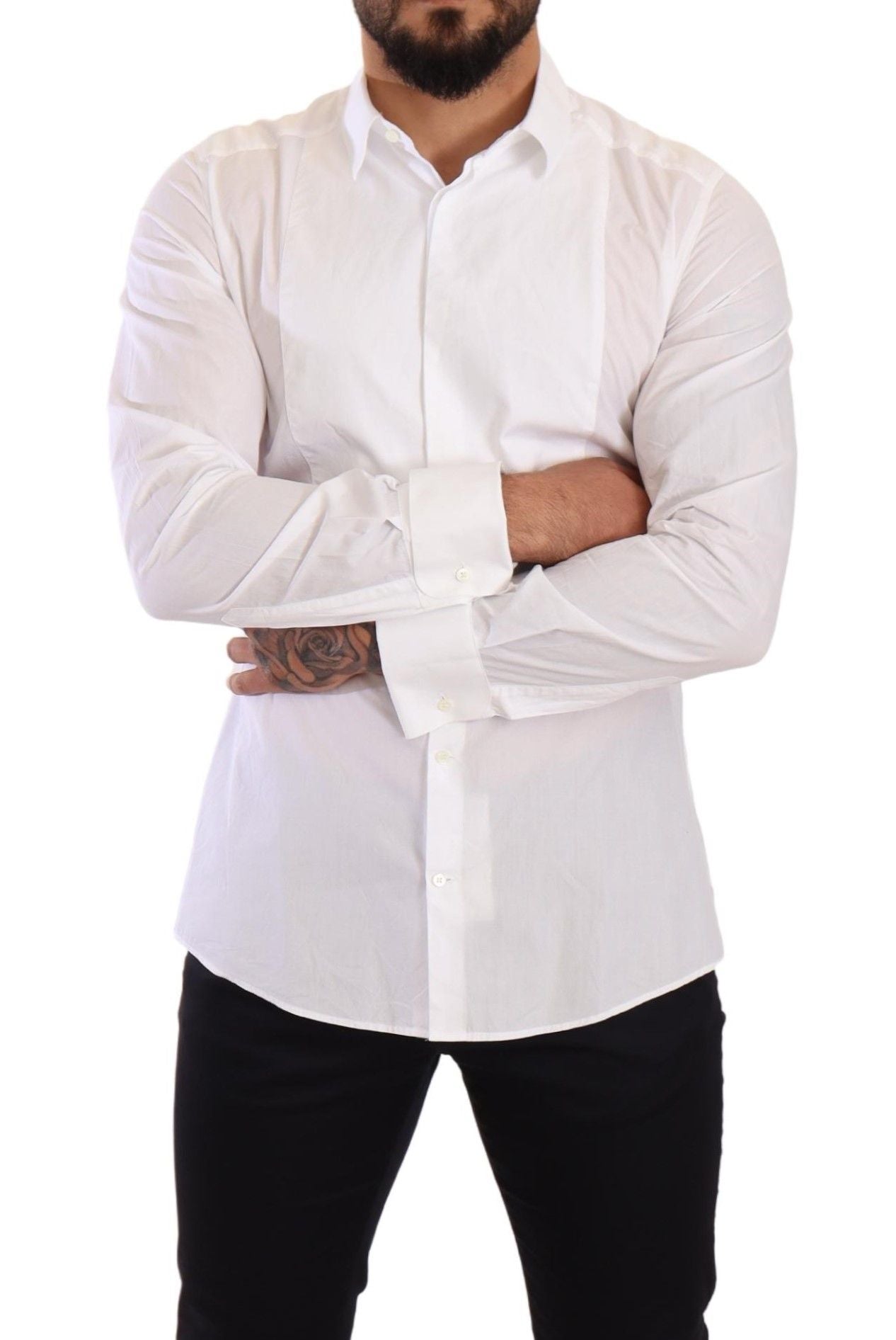Infuse your wardrobe with sophistication and Italian elegance with this stunning white dress shirt by Dolce & Gabbana. Designed for the modern man, this shirt highlights a crisp spread collar, a beautiful pleated plastron, and precise back yoke with a box pleat, ensuring a sharp silhouette. The iconic Gold fit is slim and tailored, cut from luxurious 100% cotton fabric for exceptional comfort and breathability. This exquisite piece is perfected with one-button cuffs and front button closure, featuring subtle logo details that epitomize the brand’s attention to detail. Made in Italy, it’s a timeless investment in style and quality.