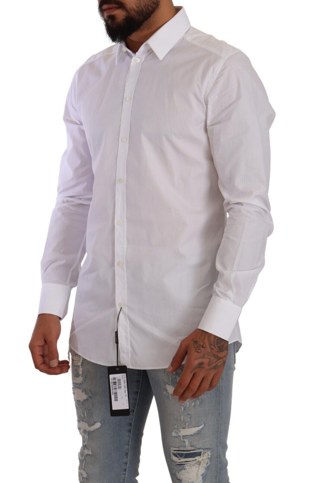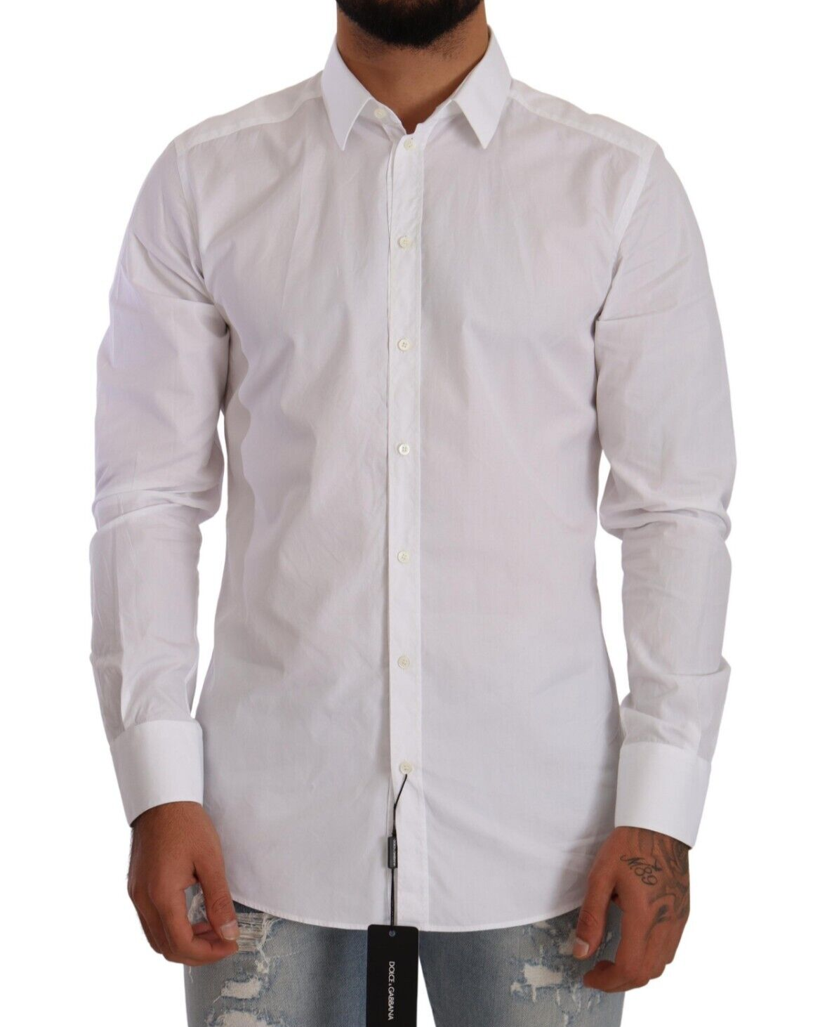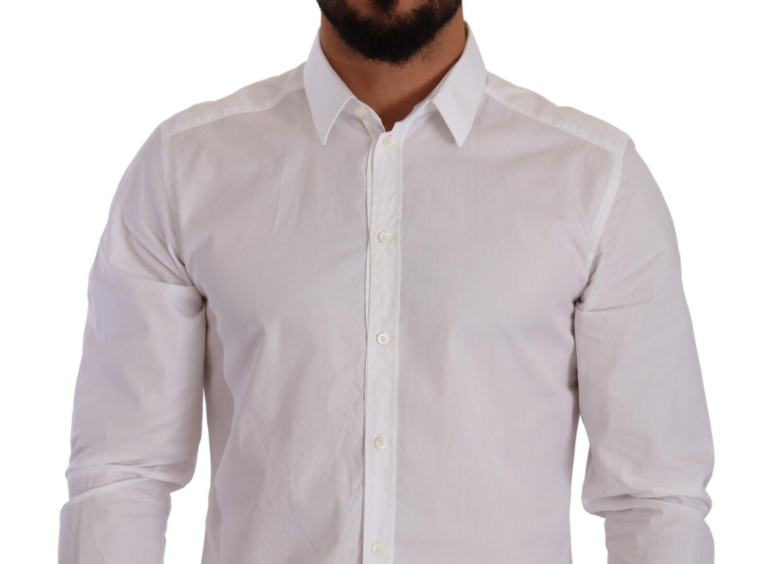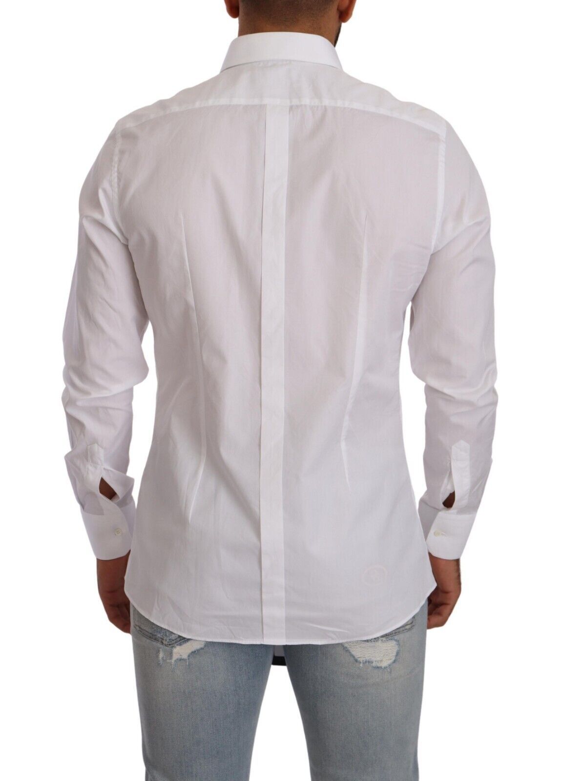 Step into a world of sophistication with this stunning slim fit dress shirt, directly from the exquisite collection of Dolce & Gabbana. Crafted with the finest 100% cotton, its crisp white hue is a testament to timeless style, while the meticulous tailoring ensures a silhouette that speaks of sharp elegance. Perfect for those who appreciate the finer details, this shirt boasts a classic collar, long sleeves and a sleek button-down closure, along with the distinguished logo details that are subtly incorporated to elevate your ensemble. Proudly made in Italy, it’s more than a shirt—it’s a statement.