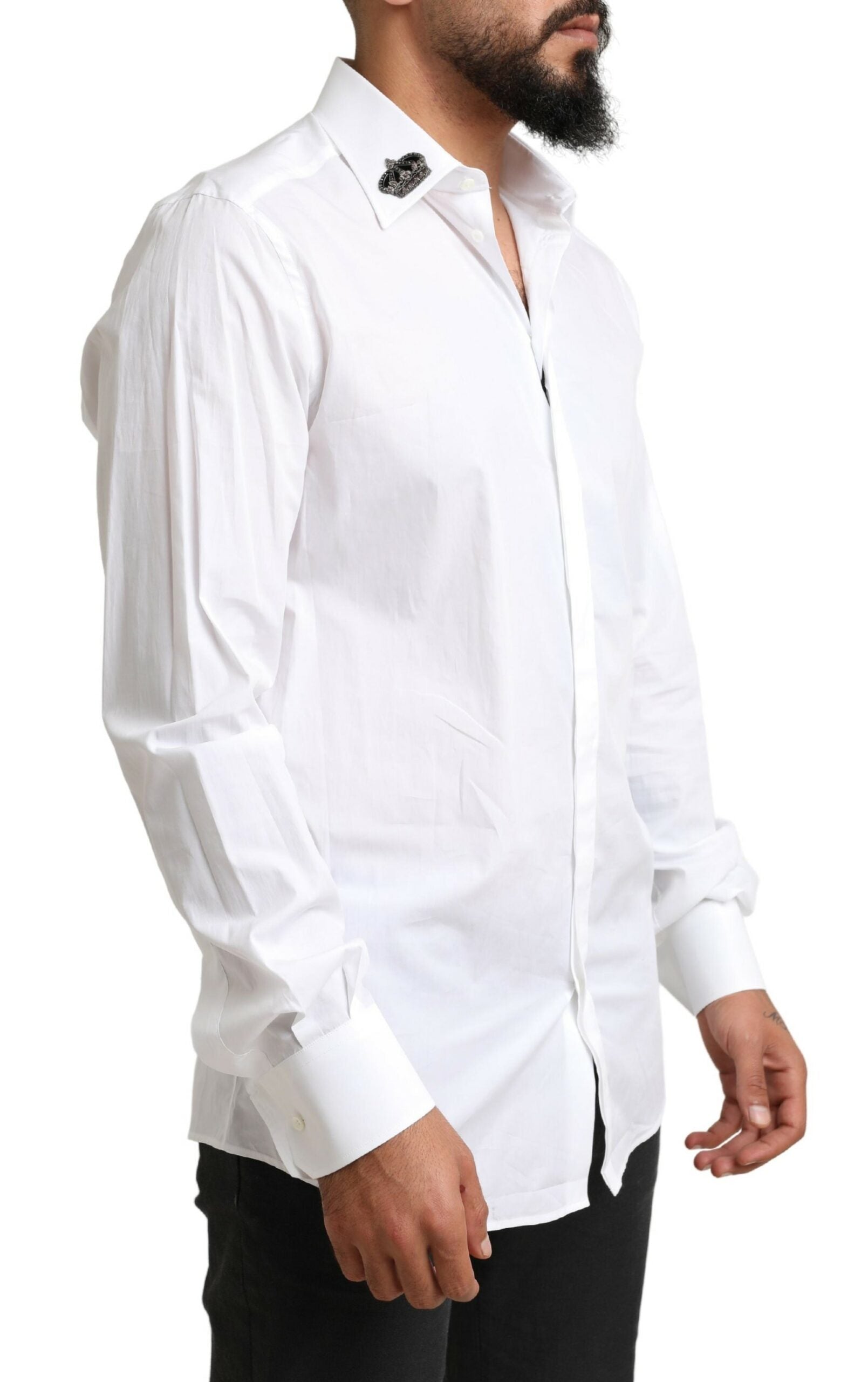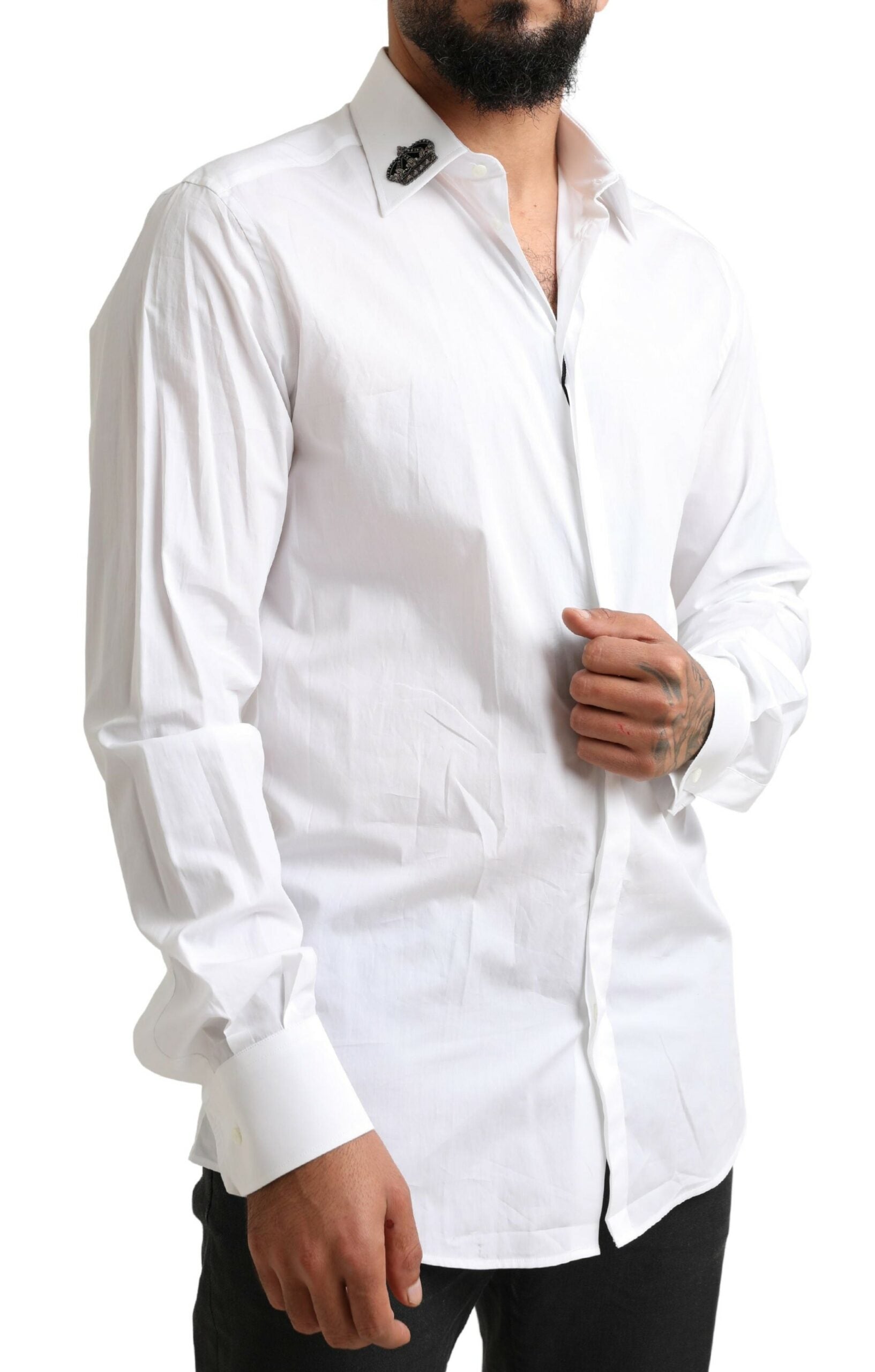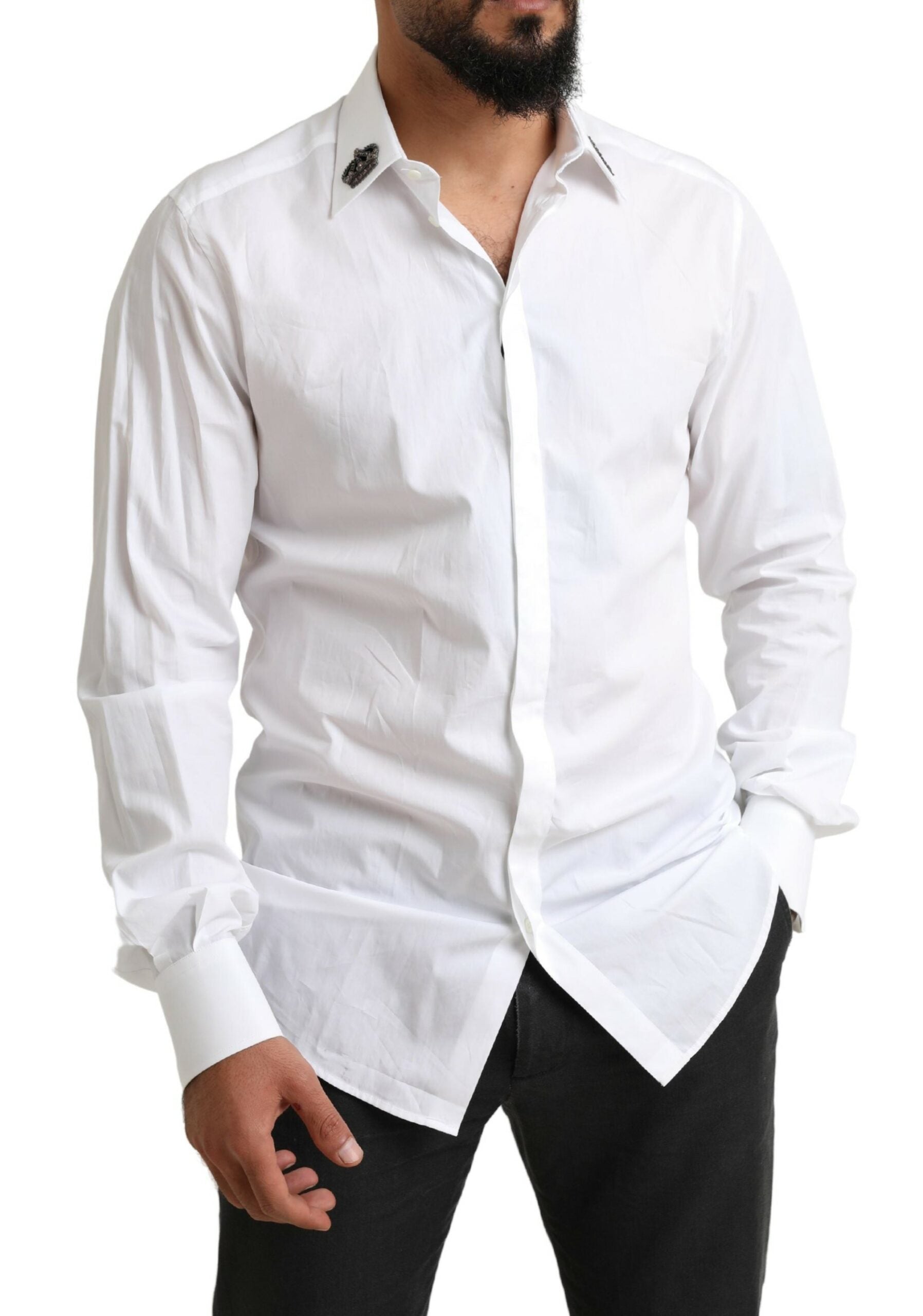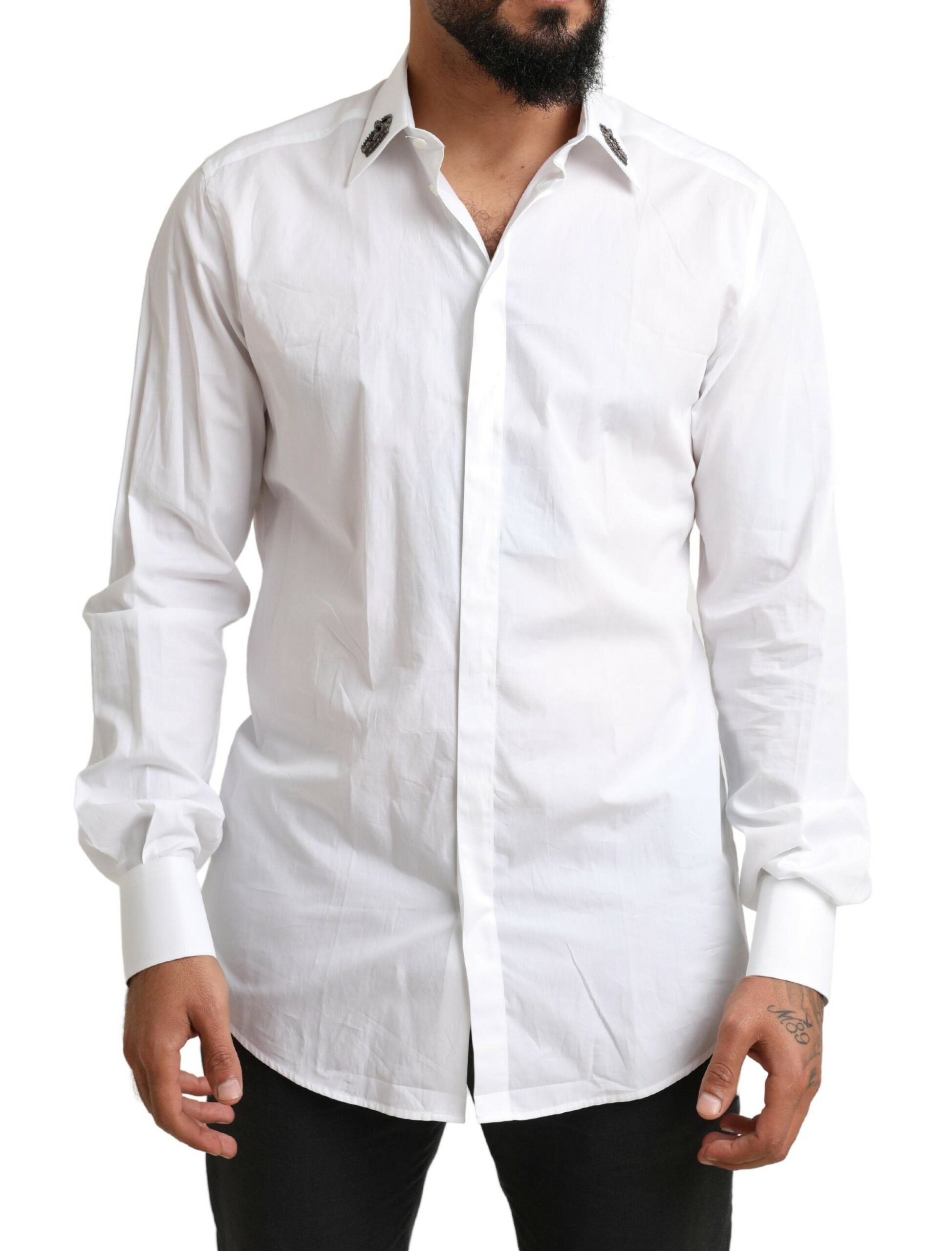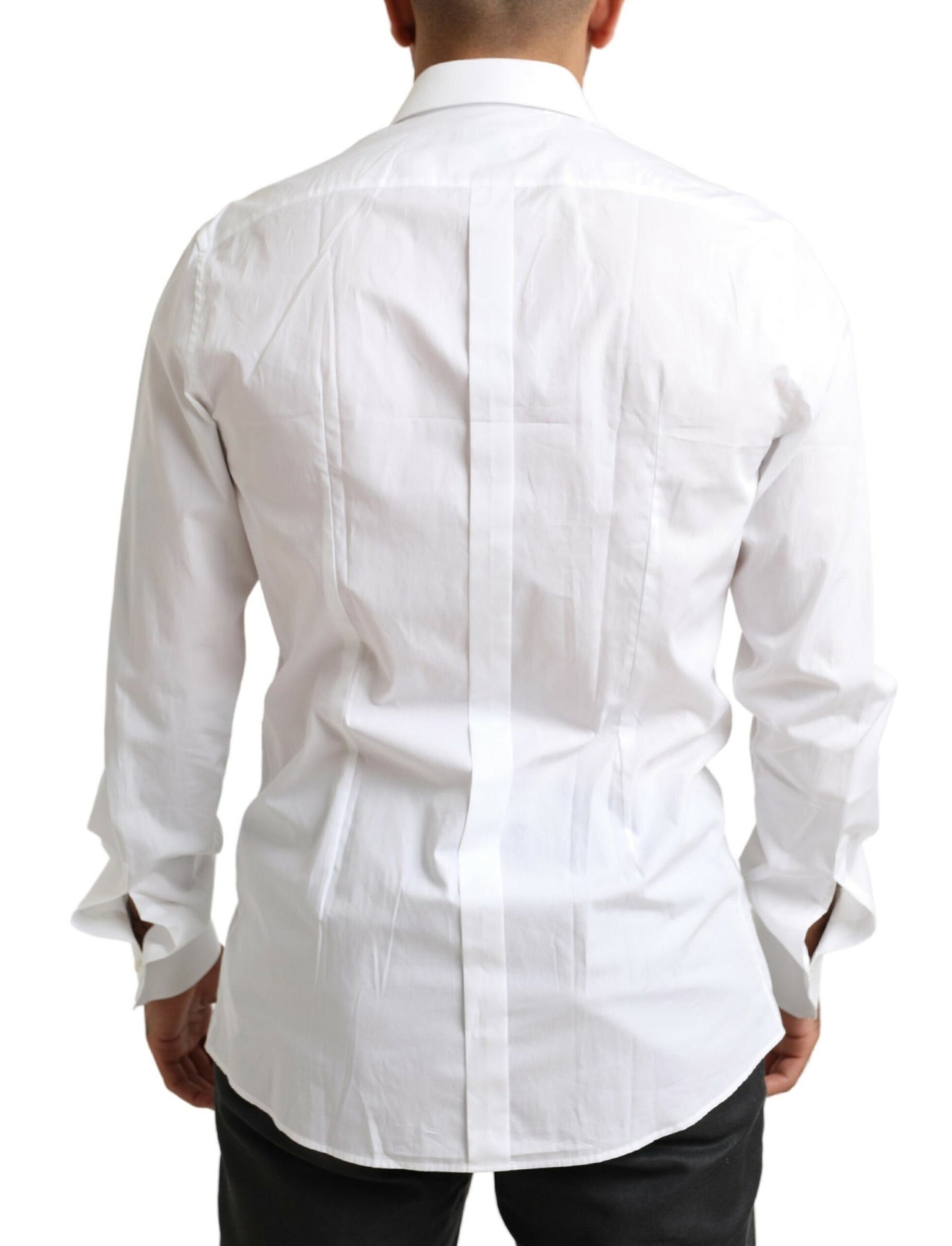 Discover the epitome of sophistication with our exquisite snow-white tuxedo shirt, a true representation of elegance and Italian craftsmanship. Designed by the renowned Dolce & Gabbana, this slim-fit shirt is meticulously crafted from fine long-staple cotton poplin, boasting a luxurious, silky touch.