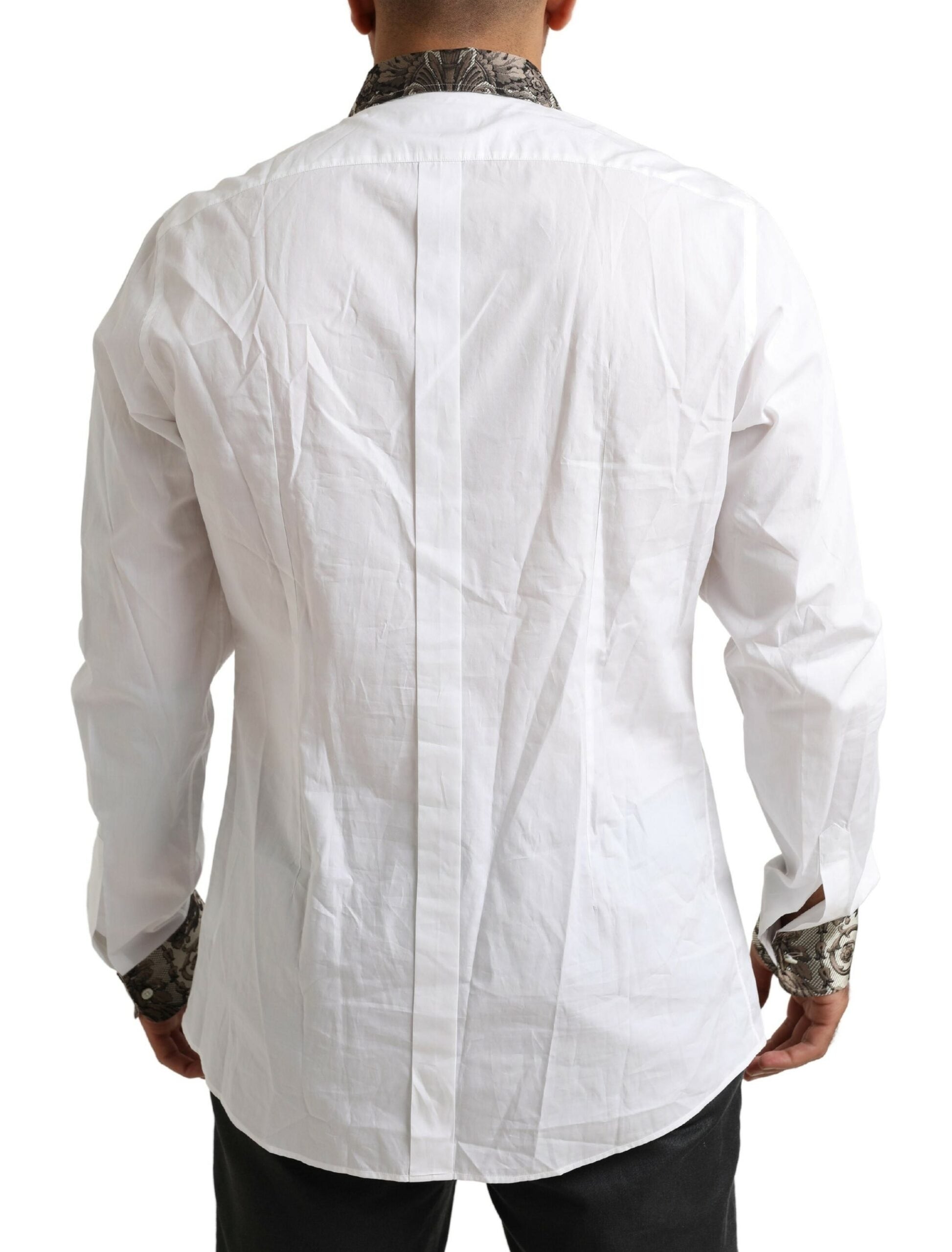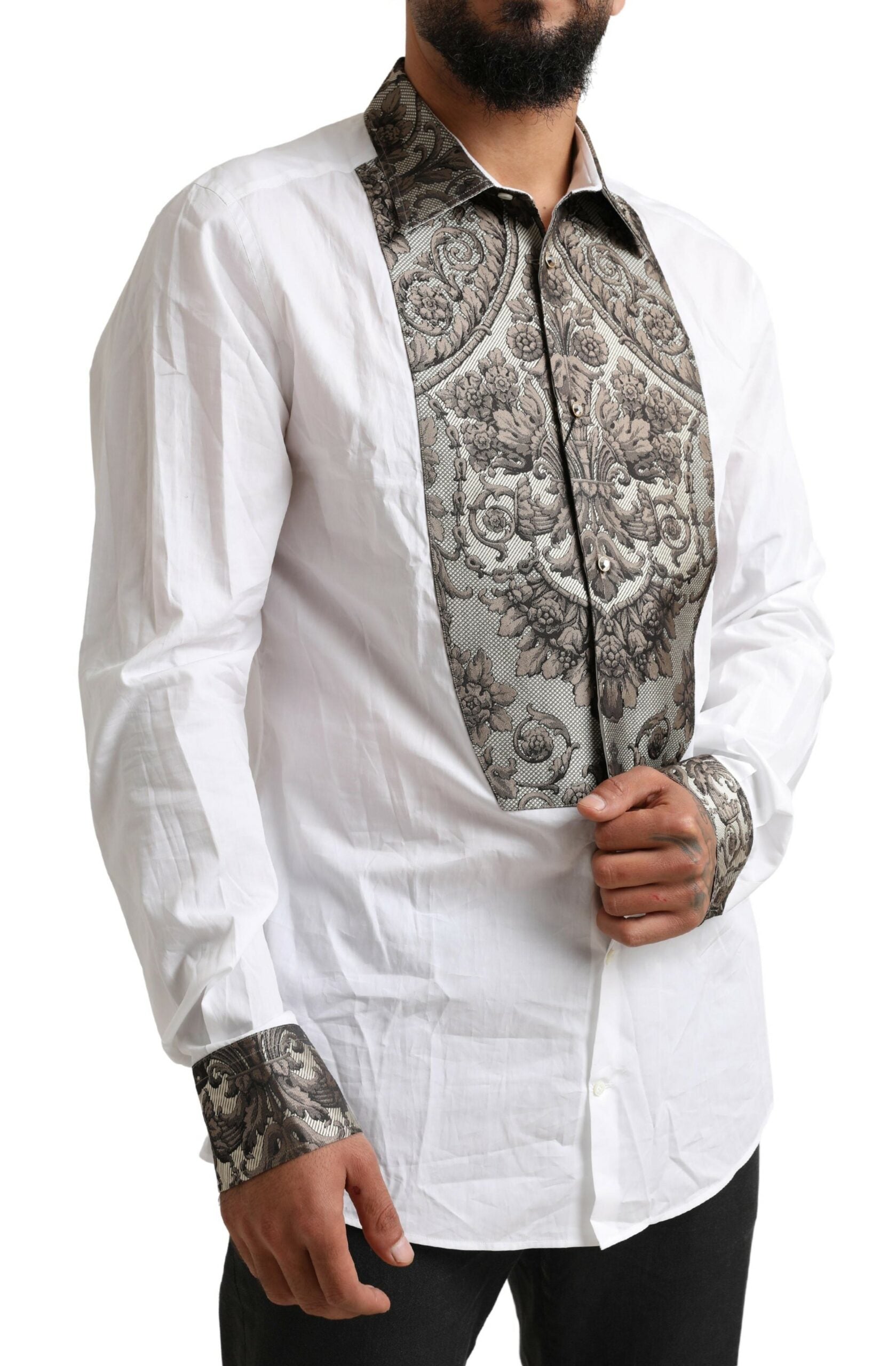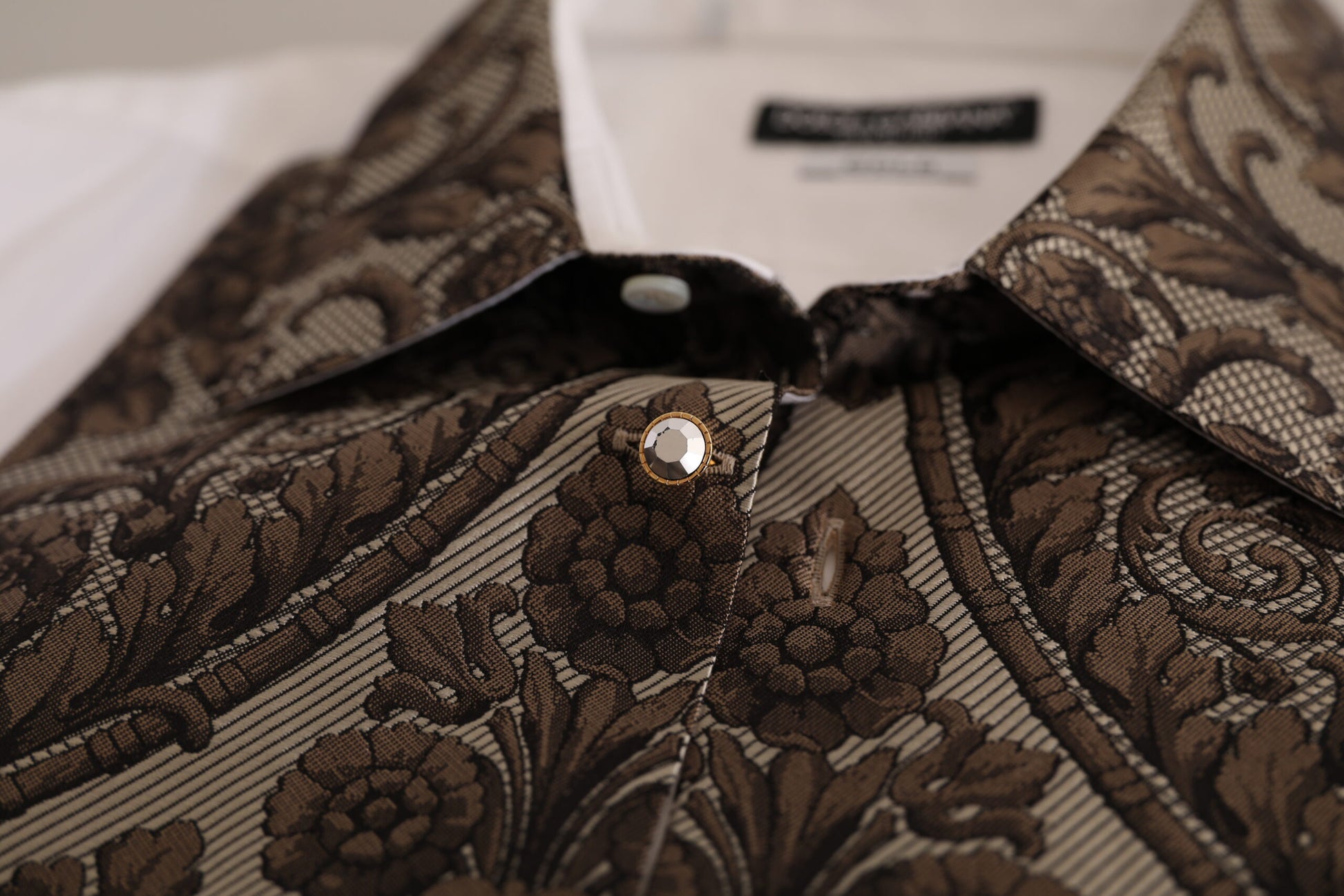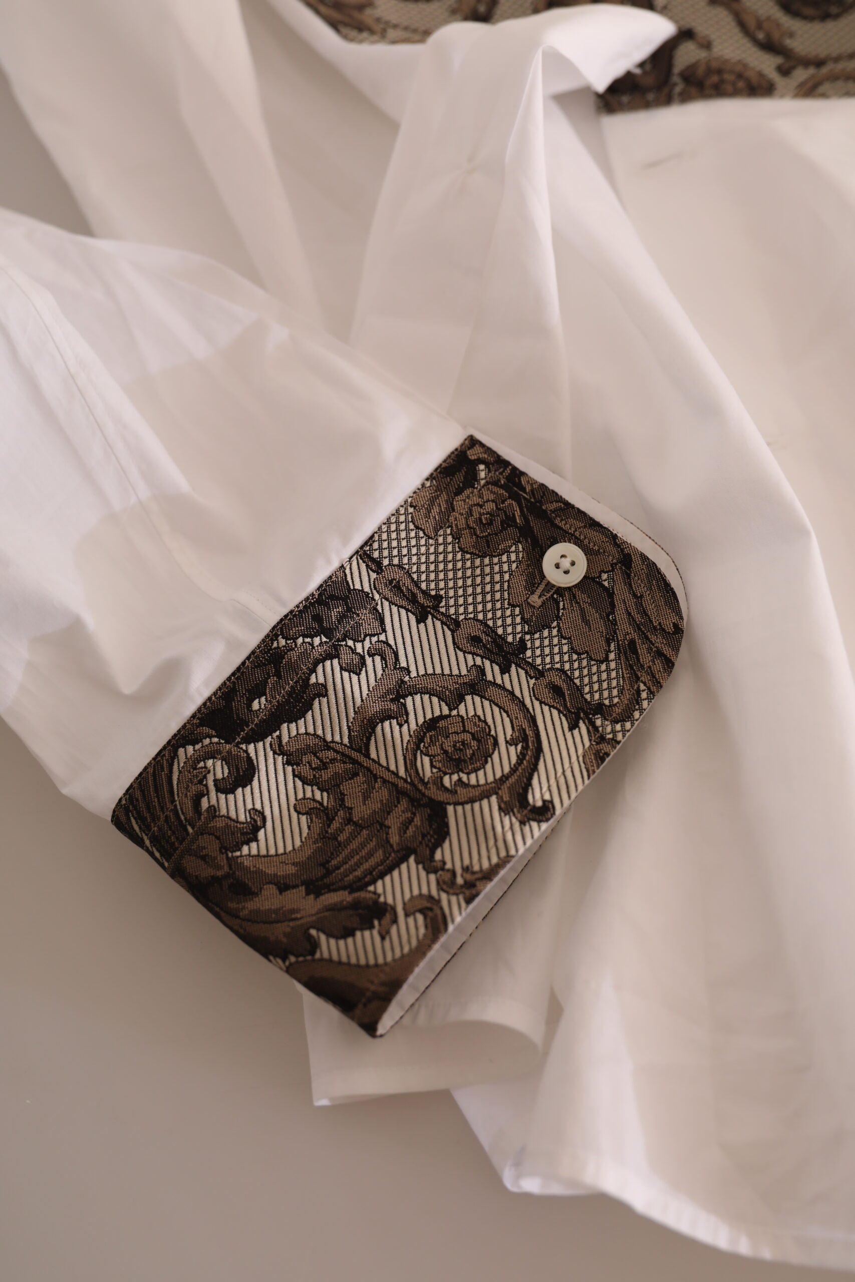 Refine your wardrobe with a touch of sophistication with this stunning white dress shirt from Dolce & Gabbana. Crafted from a luxurious cotton blend, this shirt showcases exquisite brown and gray baroque detailing that exudes a timeless elegance. Designed with the modern gentleman in mind, its flattering slim fit and French cuffs make it the perfect choice for formal events or adding a dash of class to any suave outfit. Proudly made in Italy, this shirt is a testament to the craftsmanship and style that Dolce & Gabbana is renowned for.