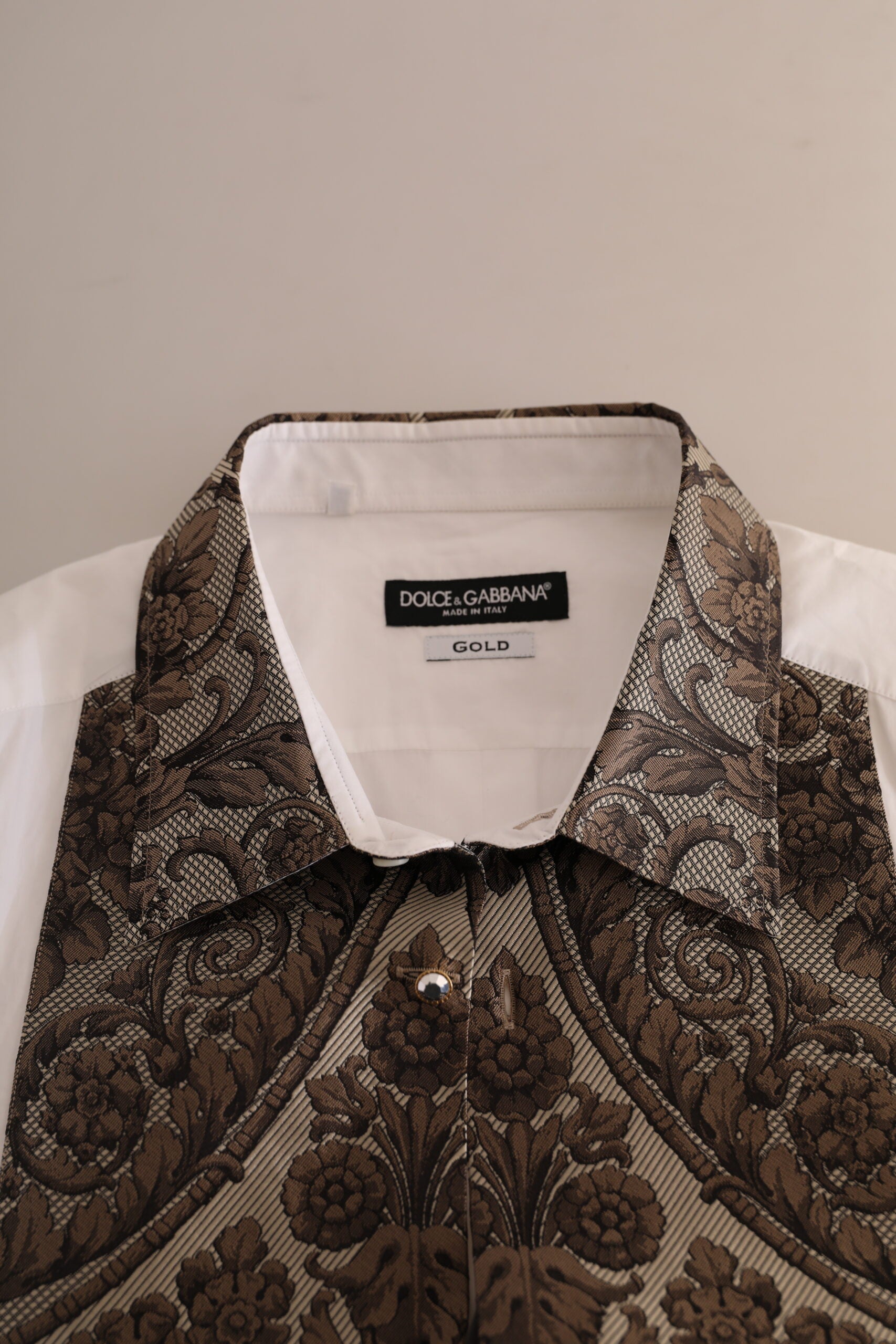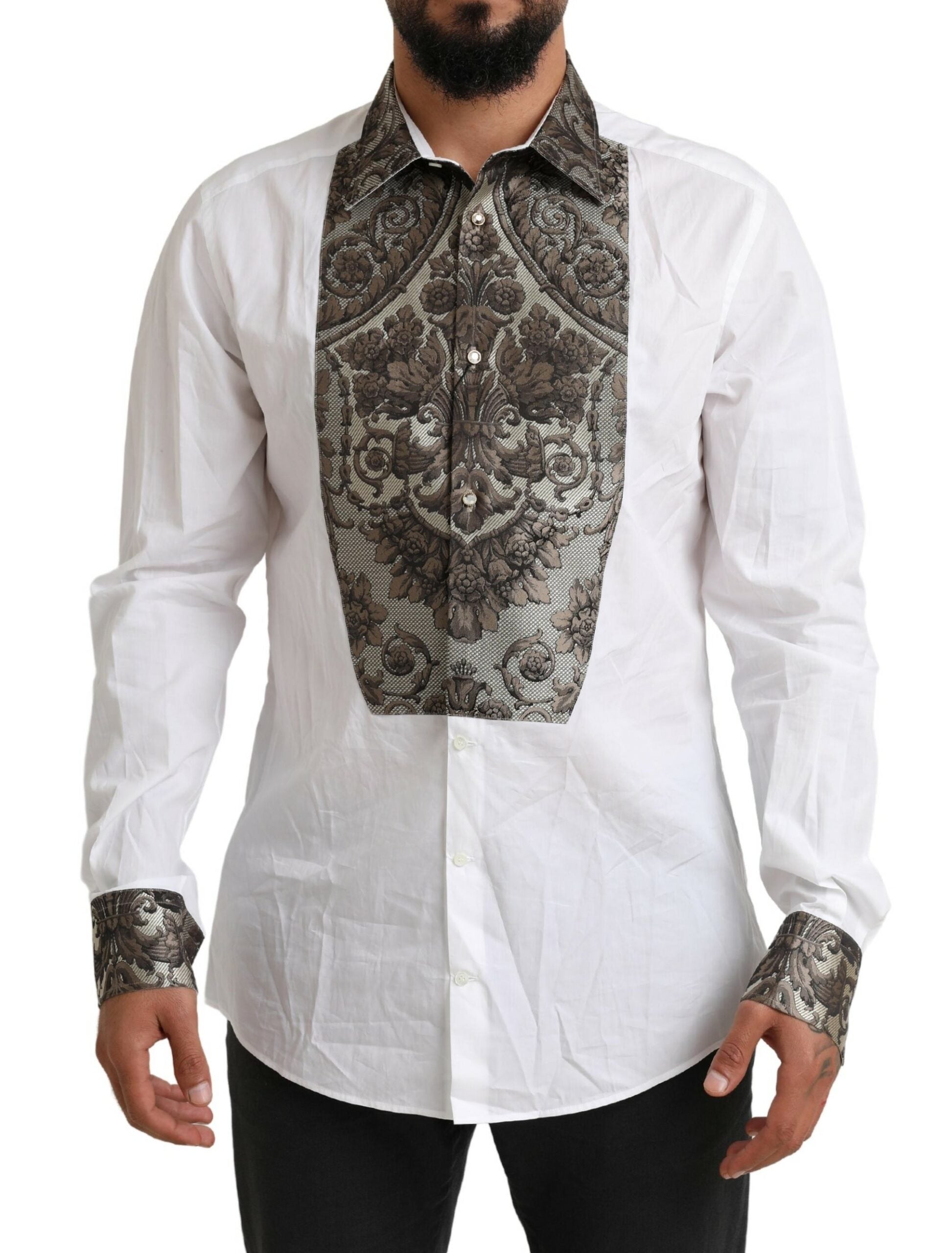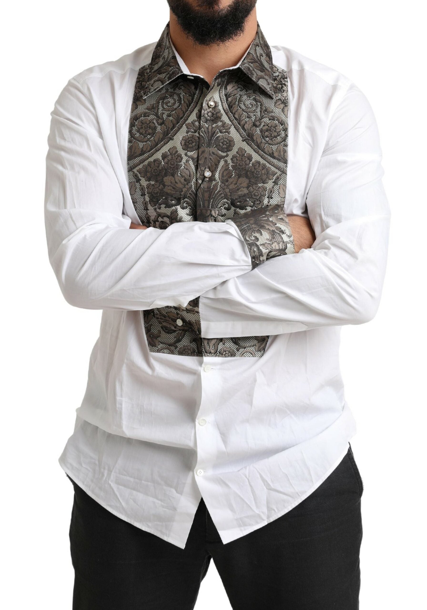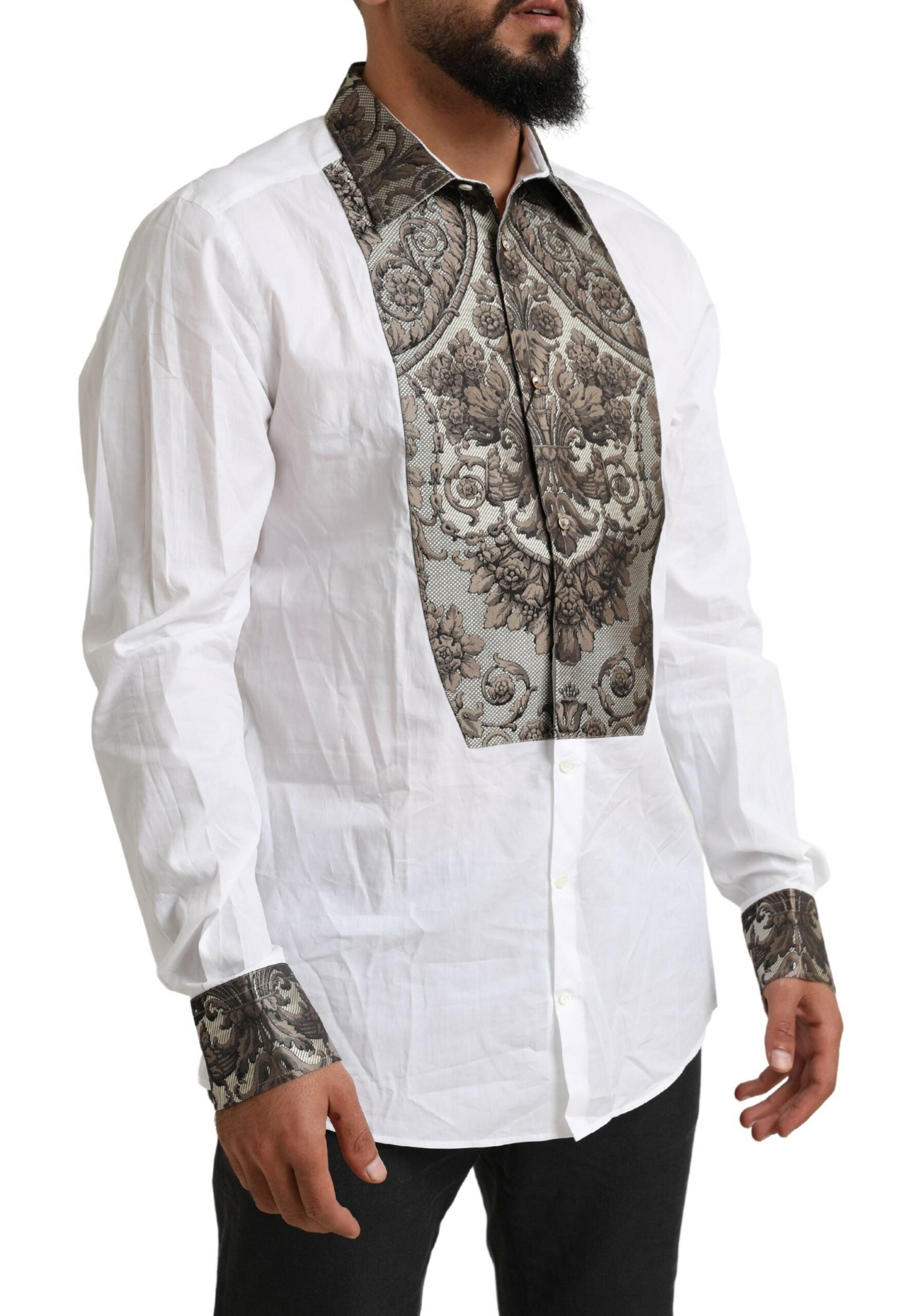 Refine your wardrobe with a touch of sophistication with this stunning white dress shirt from Dolce & Gabbana. Crafted from a luxurious cotton blend, this shirt showcases exquisite brown and gray baroque detailing that exudes a timeless elegance. Designed with the modern gentleman in mind, its flattering slim fit and French cuffs make it the perfect choice for formal events or adding a dash of class to any suave outfit. Proudly made in Italy, this shirt is a testament to the craftsmanship and style that Dolce & Gabbana is renowned for.