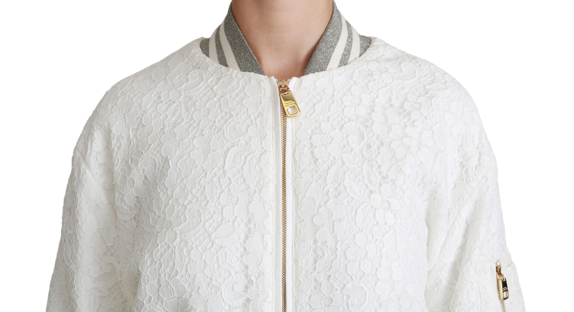 Embrace luxury with this pristine Dolce & Gabbana White Lace Bomber Jacket, a perfect blend of sophistication and contemporary design. Adorned with gold metal details and contrasting gray stripes, this jacket features a full zip closure and practical pockets, ensuring both style and functionality. Made in Italy, this piece showcases the brand’s dedication to exceptional craftsmanship.