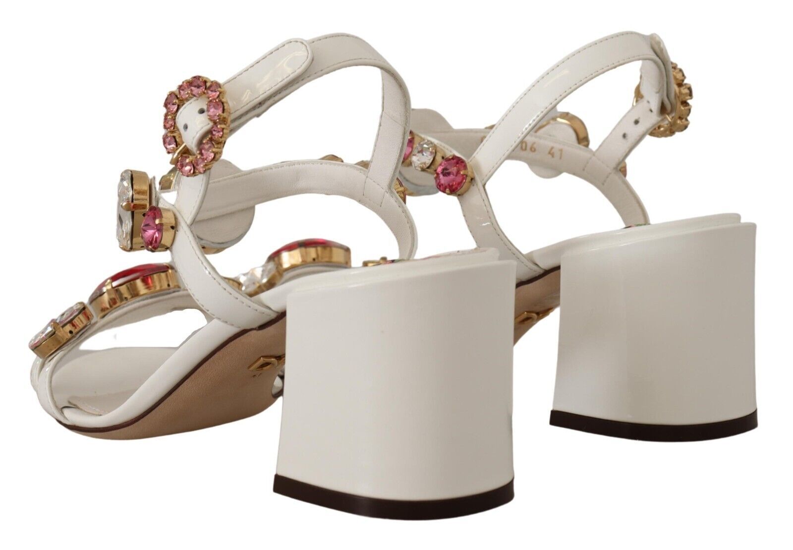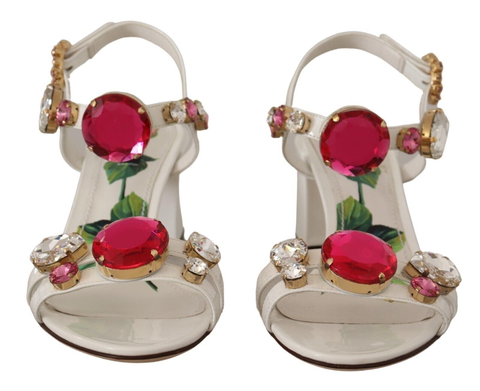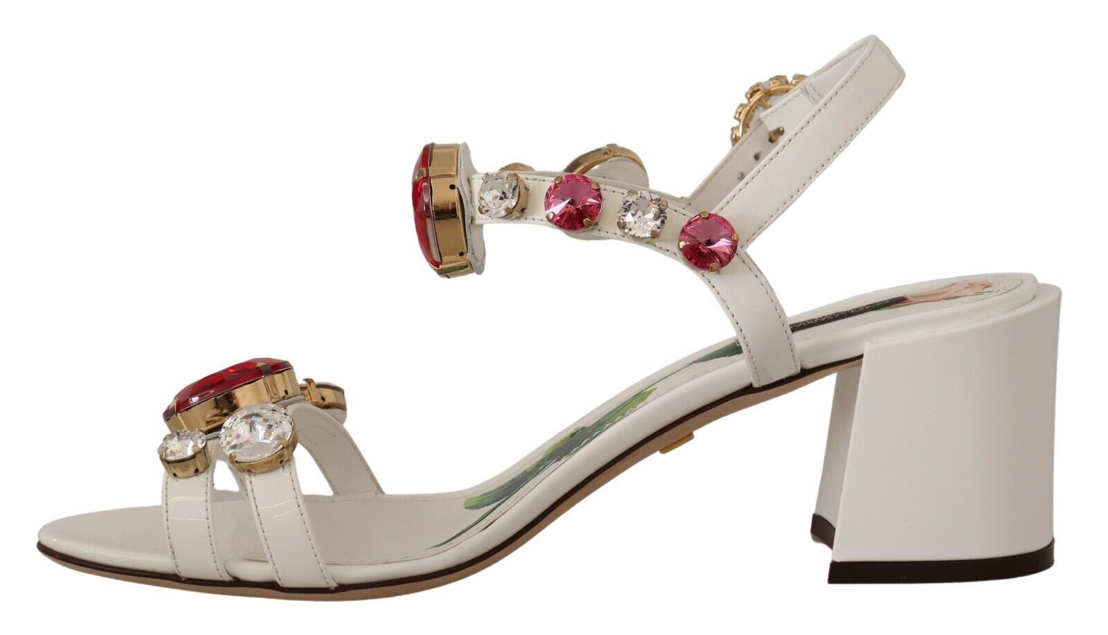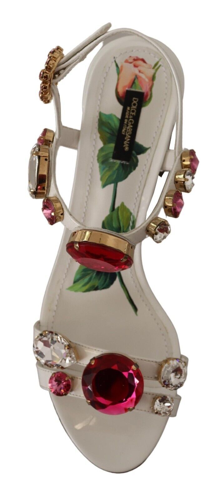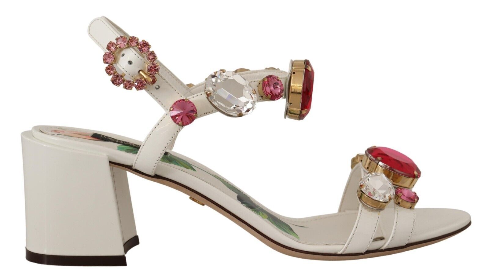 Step out in pure elegance with these stunning white Keira ankle strap heels by Dolce & Gabbana. Adorned with a charming rose print and shimmering crystals, these sandals epitomize luxury fashion. Meticulously crafted from premium leather, featuring a comfortable sole and the iconic logo detailing, they promise both high quality and comfort. Perfect for special occasions, they exude Italian craftsmanship and style.