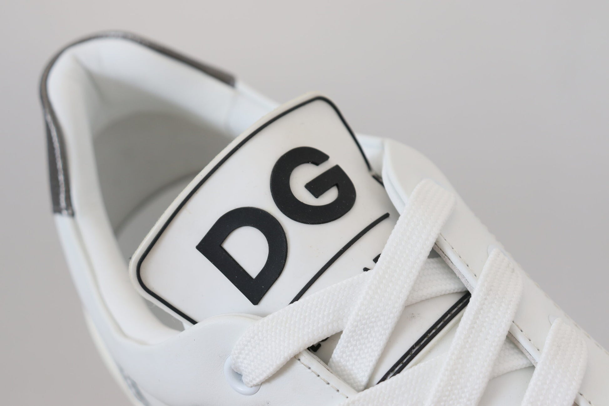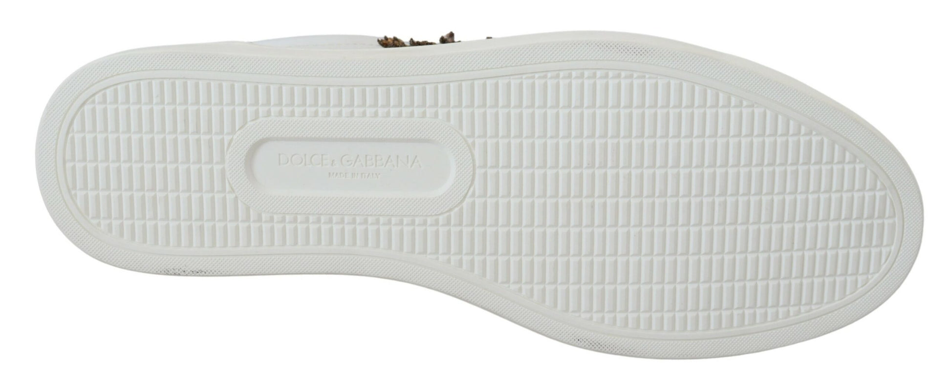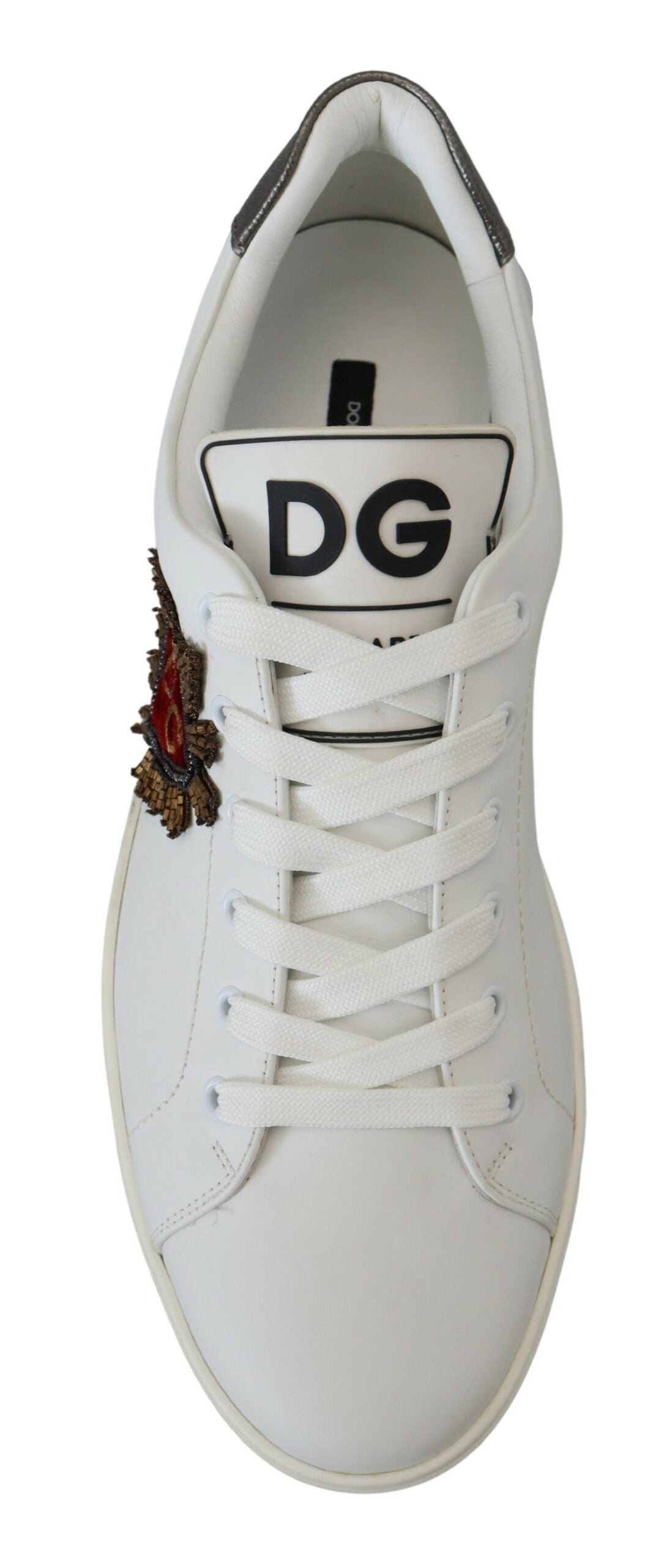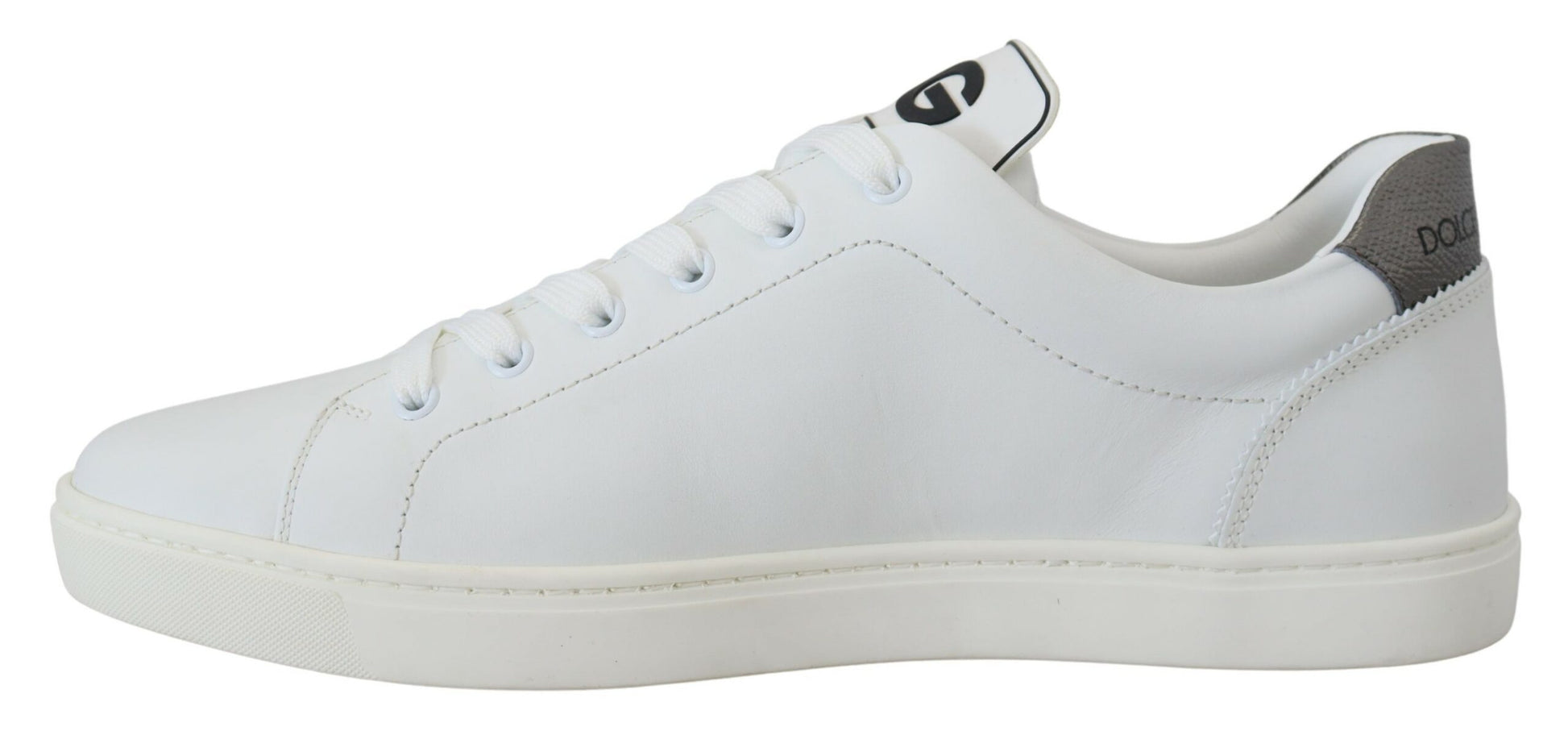 Step into luxury with these pristine white low-top sneakers from Dolce & Gabbana, exuding elegance with their silver detailing. Crafted from the finest leather and made in Italy, these shoes are a testament to premium quality and style. The rubber sole ensures comfort and durability, while the subtle logo branding adds an exclusive touch to your casual wardrobe.