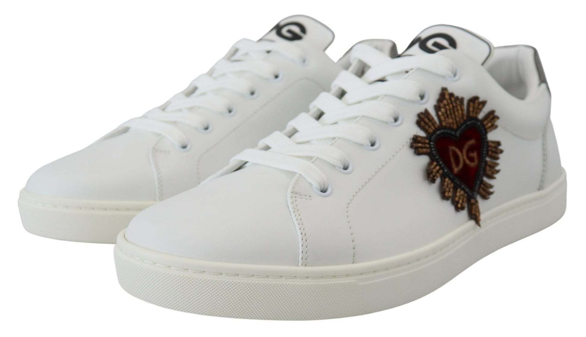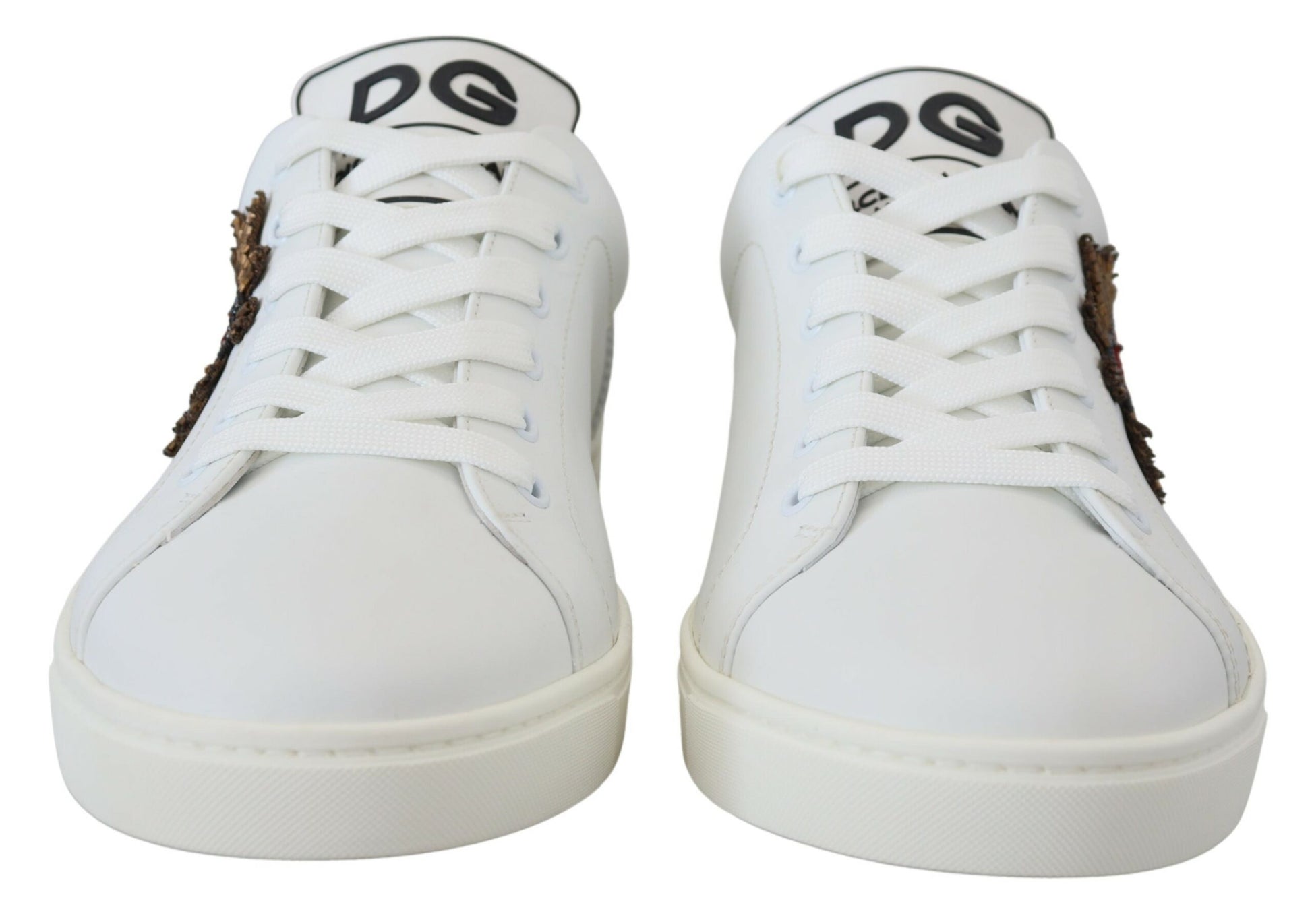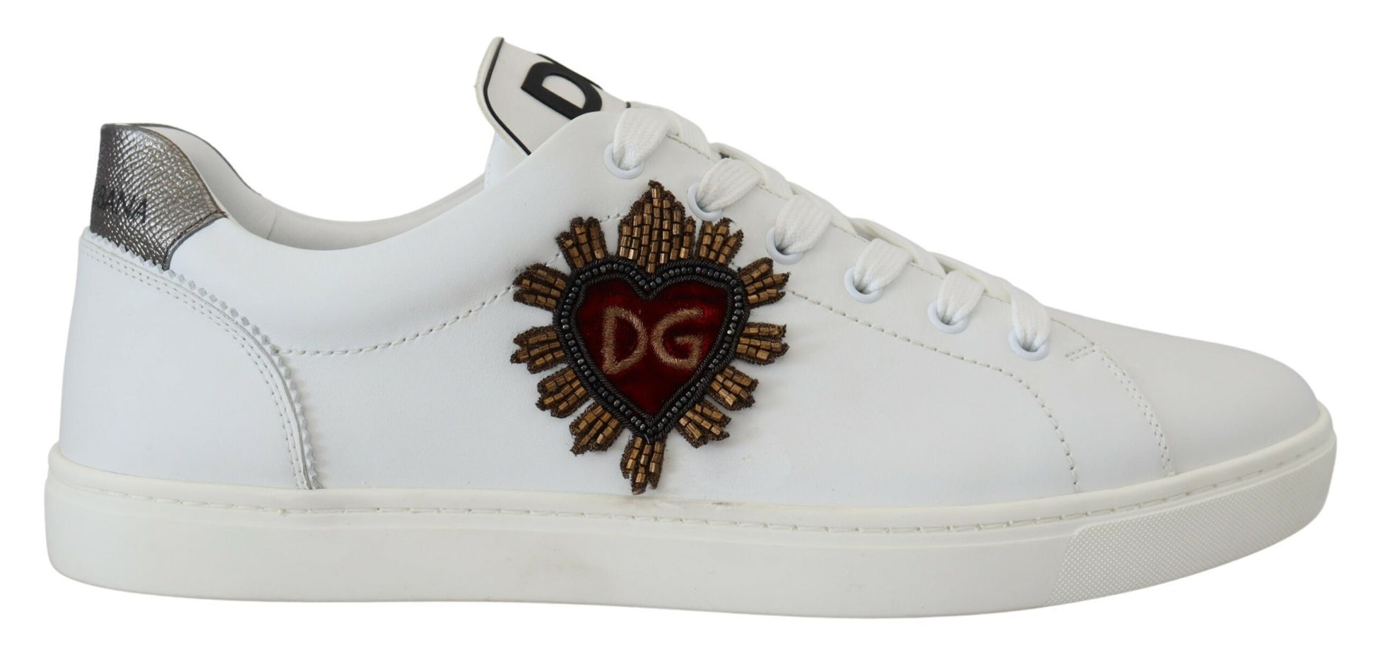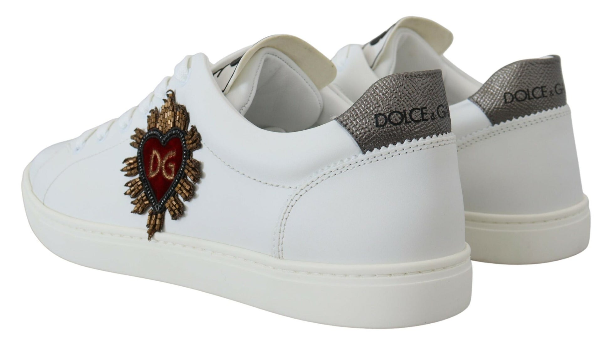 Step into luxury with these pristine white low-top sneakers from Dolce & Gabbana, exuding elegance with their silver detailing. Crafted from the finest leather and made in Italy, these shoes are a testament to premium quality and style. The rubber sole ensures comfort and durability, while the subtle logo branding adds an exclusive touch to your casual wardrobe.