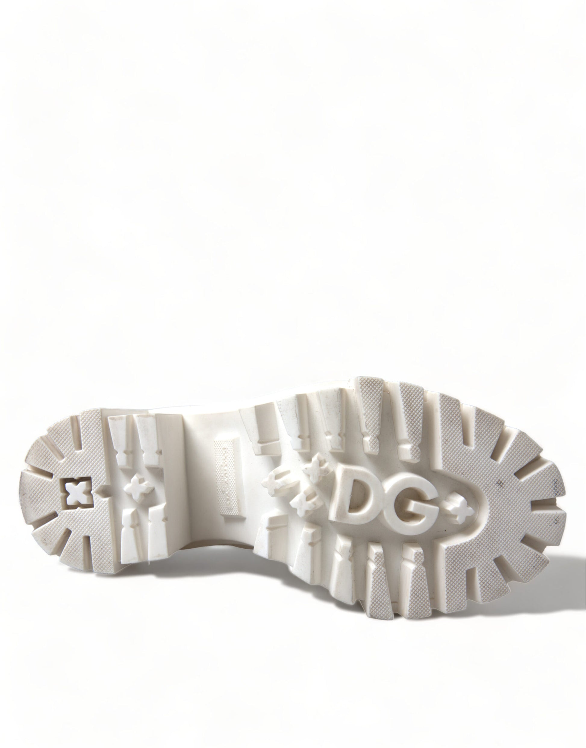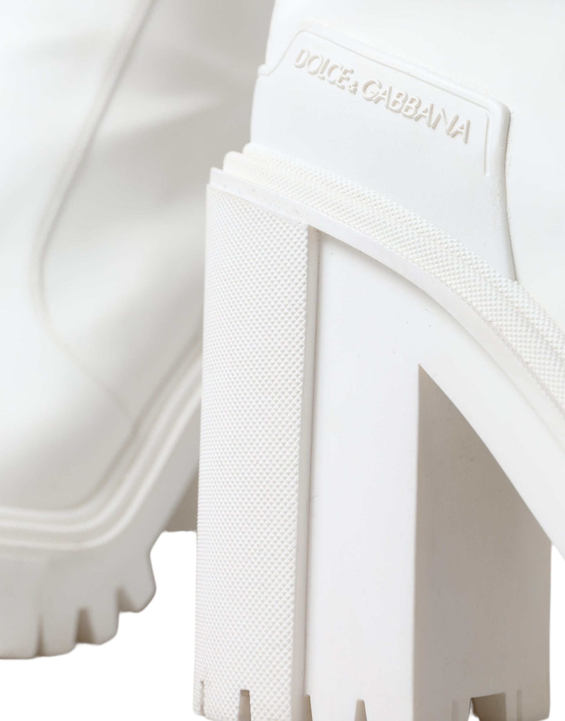 Step out in style with these stunning, brand new 100% Authentic Dolce & Gabbana trekking boots. Crafted from premium rubberized calfskin leather, these high-top boots offer both luxury and practicality, marrying high-quality craftsmanship with comfort. Designed in a chic white color, they feature a durable rubber sole, handy zip closure, and the unmistakable Dolce & Gabbana logo details. Perfect for those who demand both luxury and utility in their footwear. Made in Italy, these boots are a testament to timeless style and robust design.