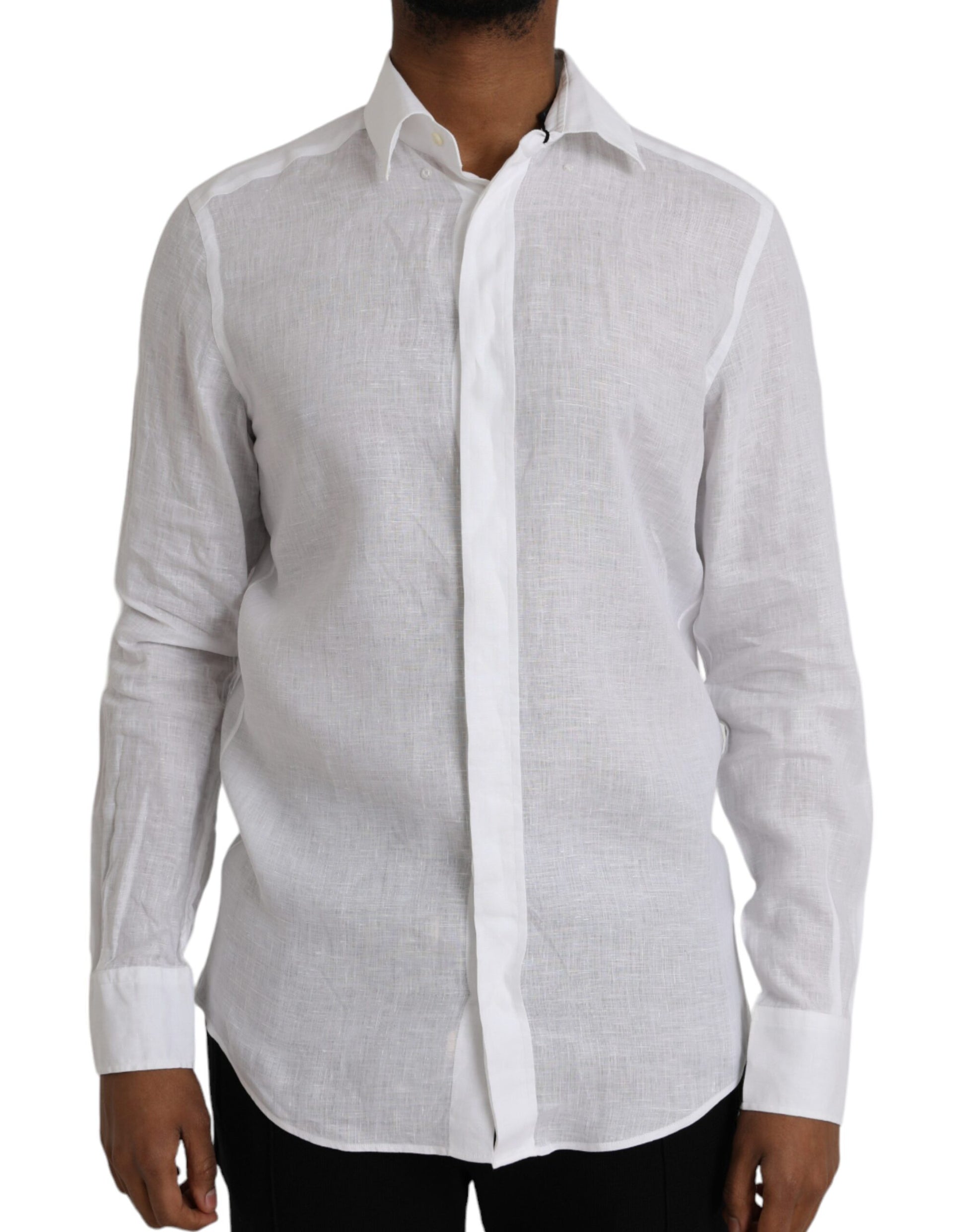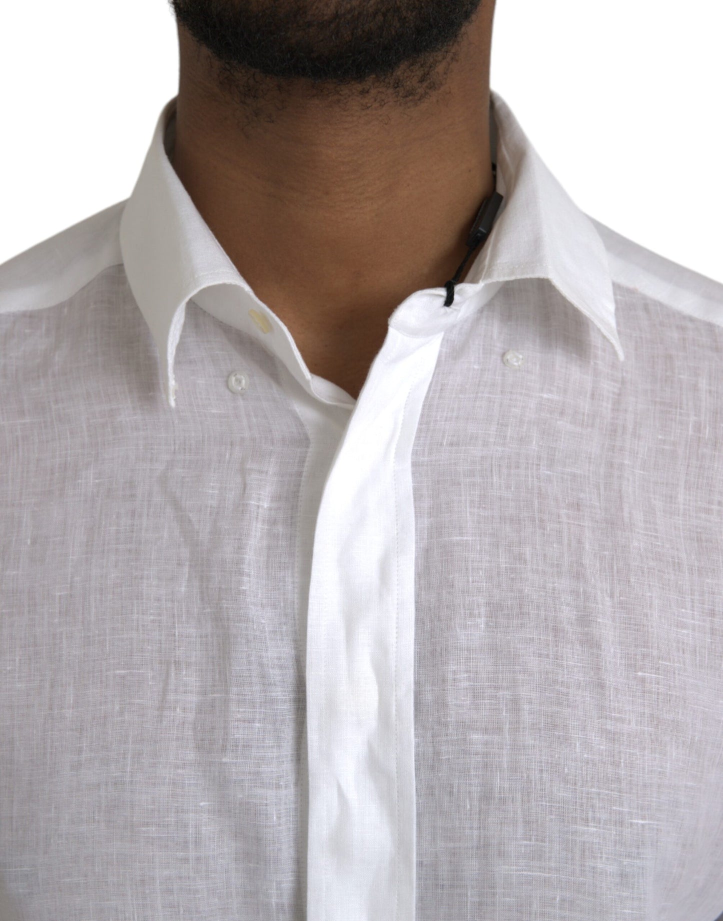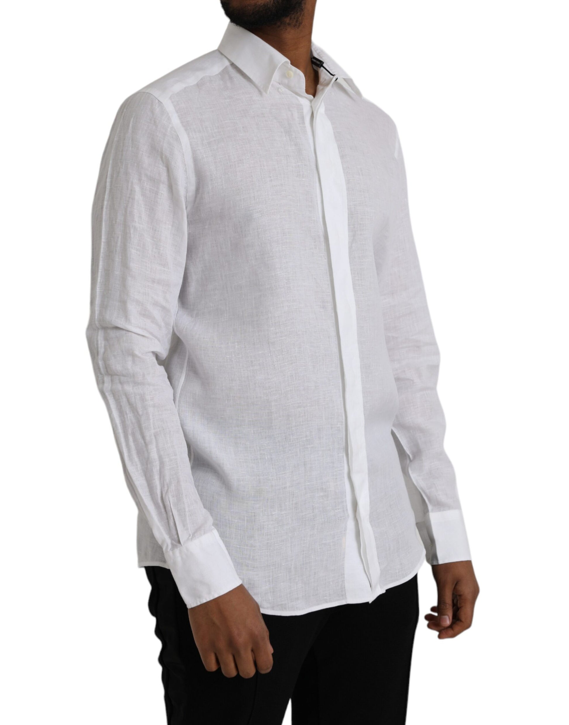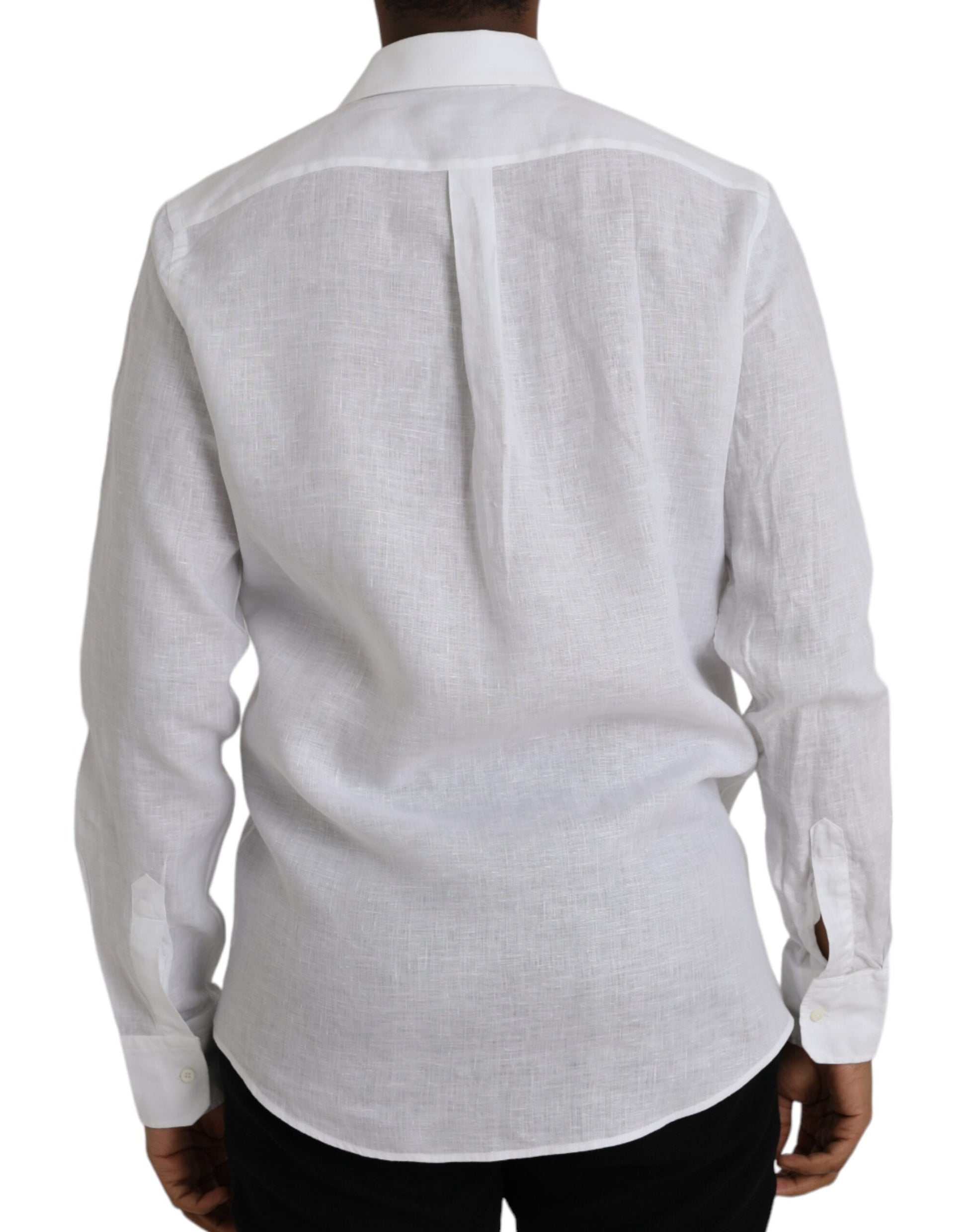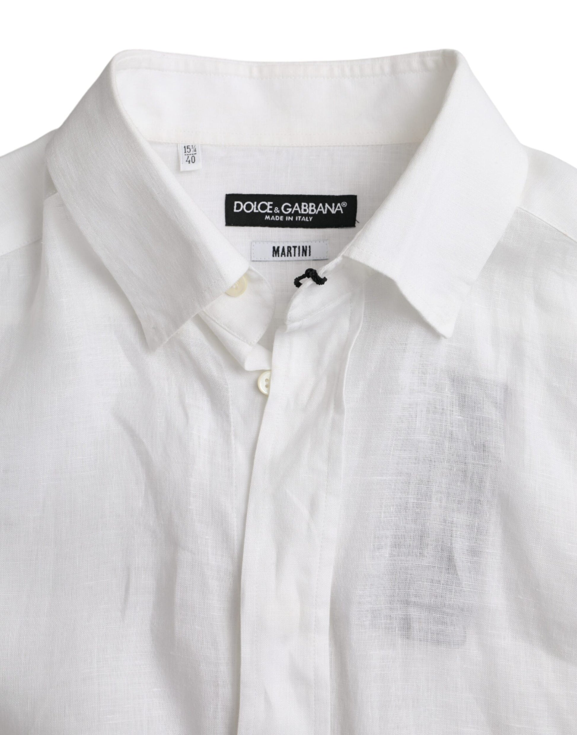 Absolutely stunning, 100% Authentic, brand new with tags Dolce & Gabbana MARTINI linen shirt. The model has a classic collared neck, long sleeves and a button down closure.