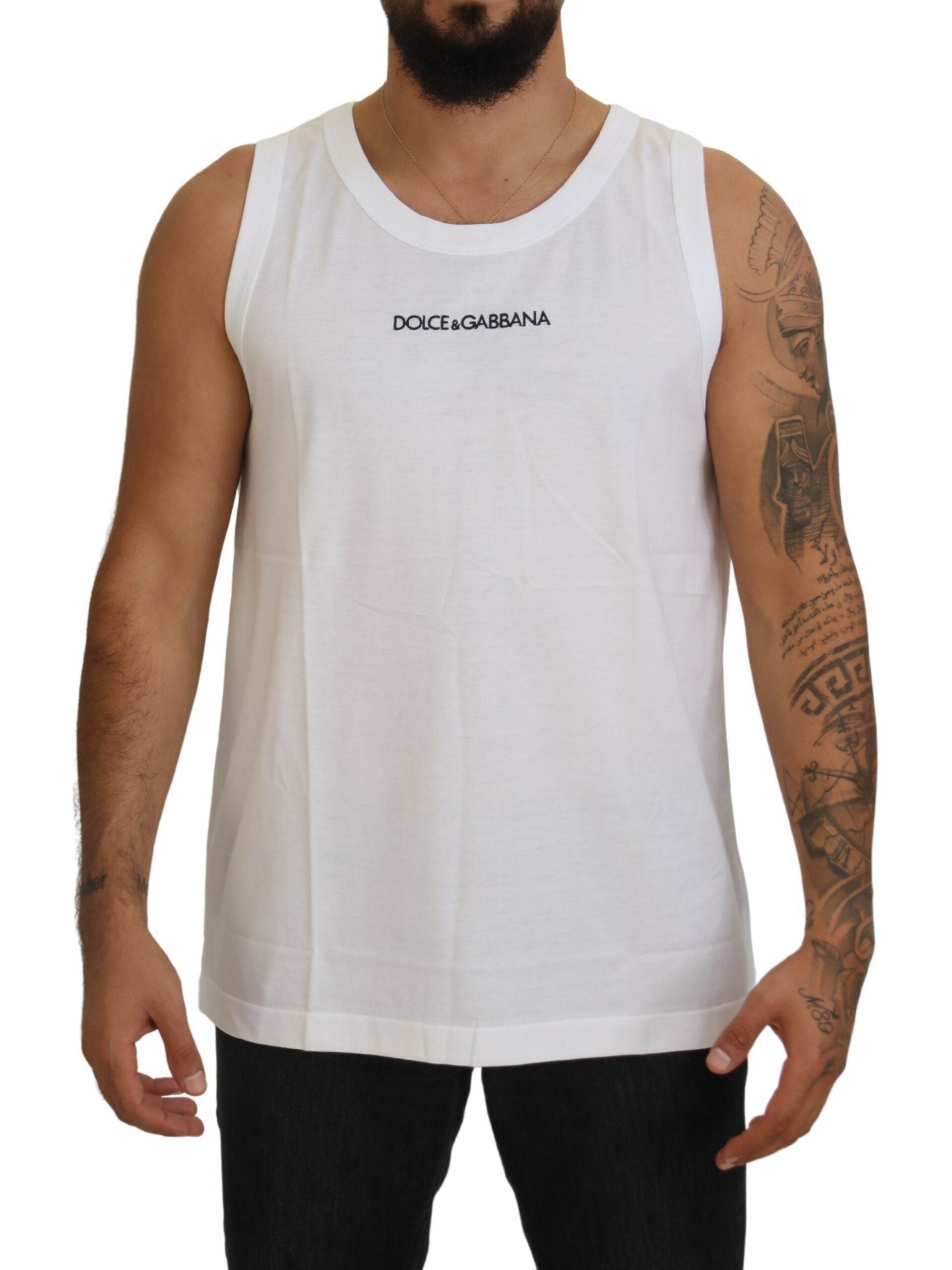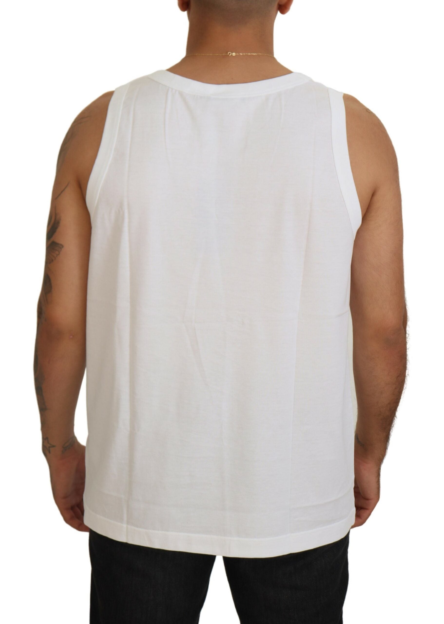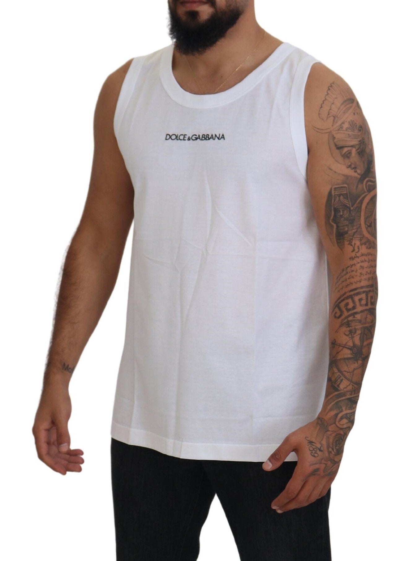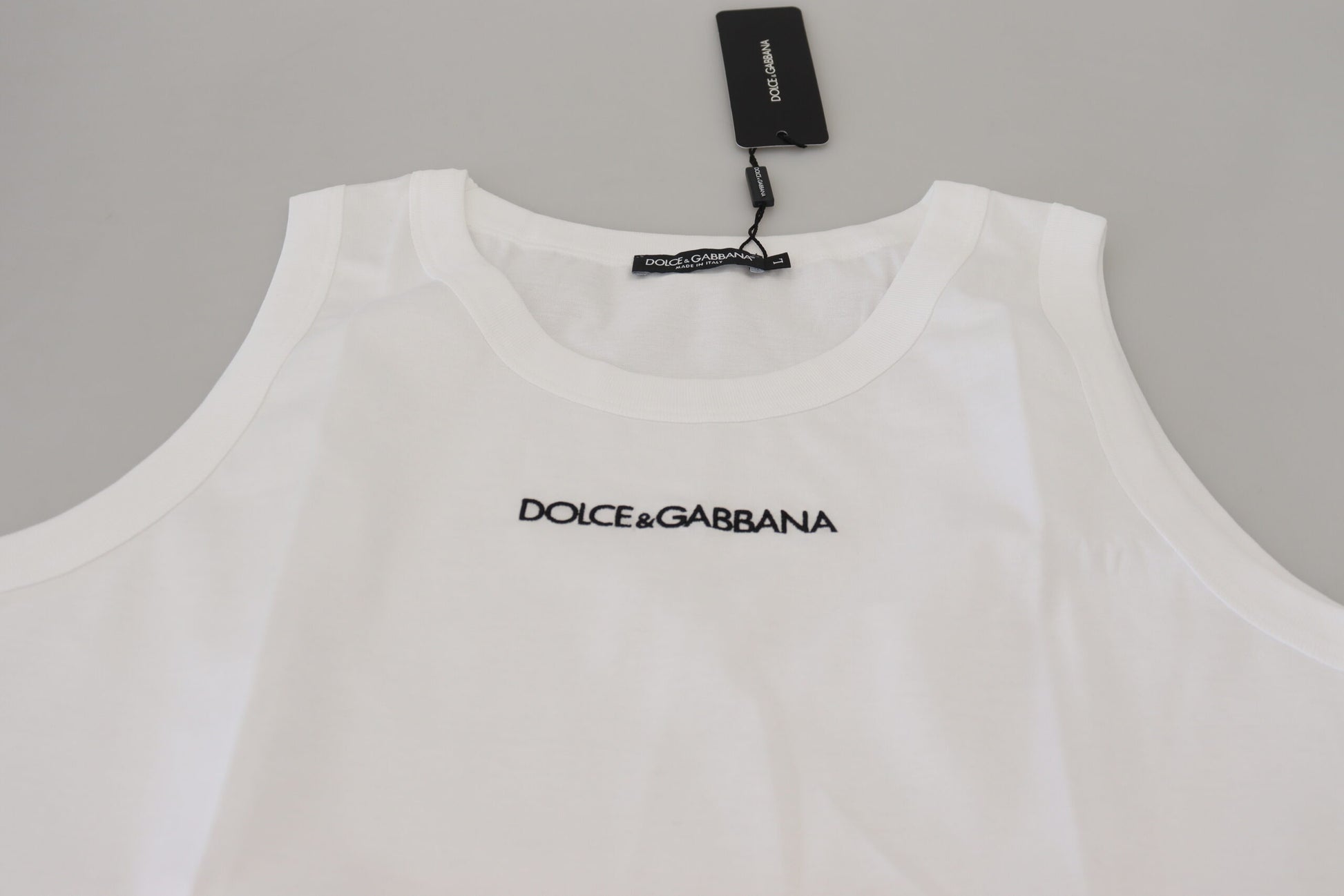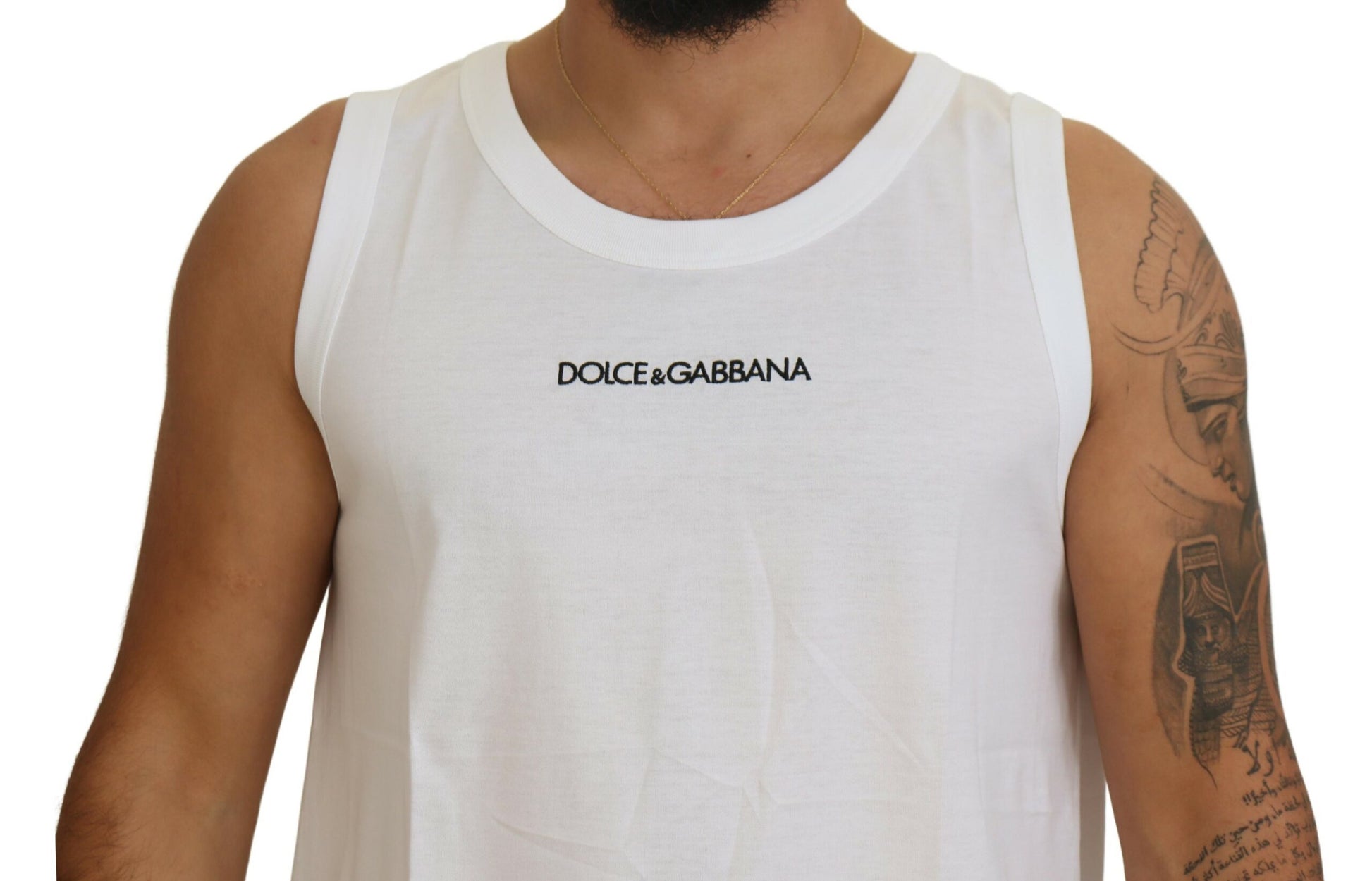 Indulge in the luxury of Dolce & Gabbana with this brand new, tag-attached tank t-shirt boasting an elegant sleeveless design and a classic round neckline. Fashioned for a regular fit, this top is an embodiment of style with its crisp white hue and striking logo print. Expertly crafted in Italy, it is a must-have for those who appreciate sophistication in their casual wear.