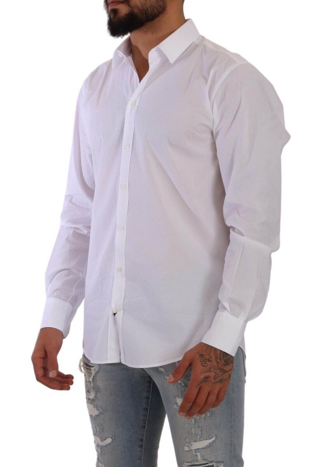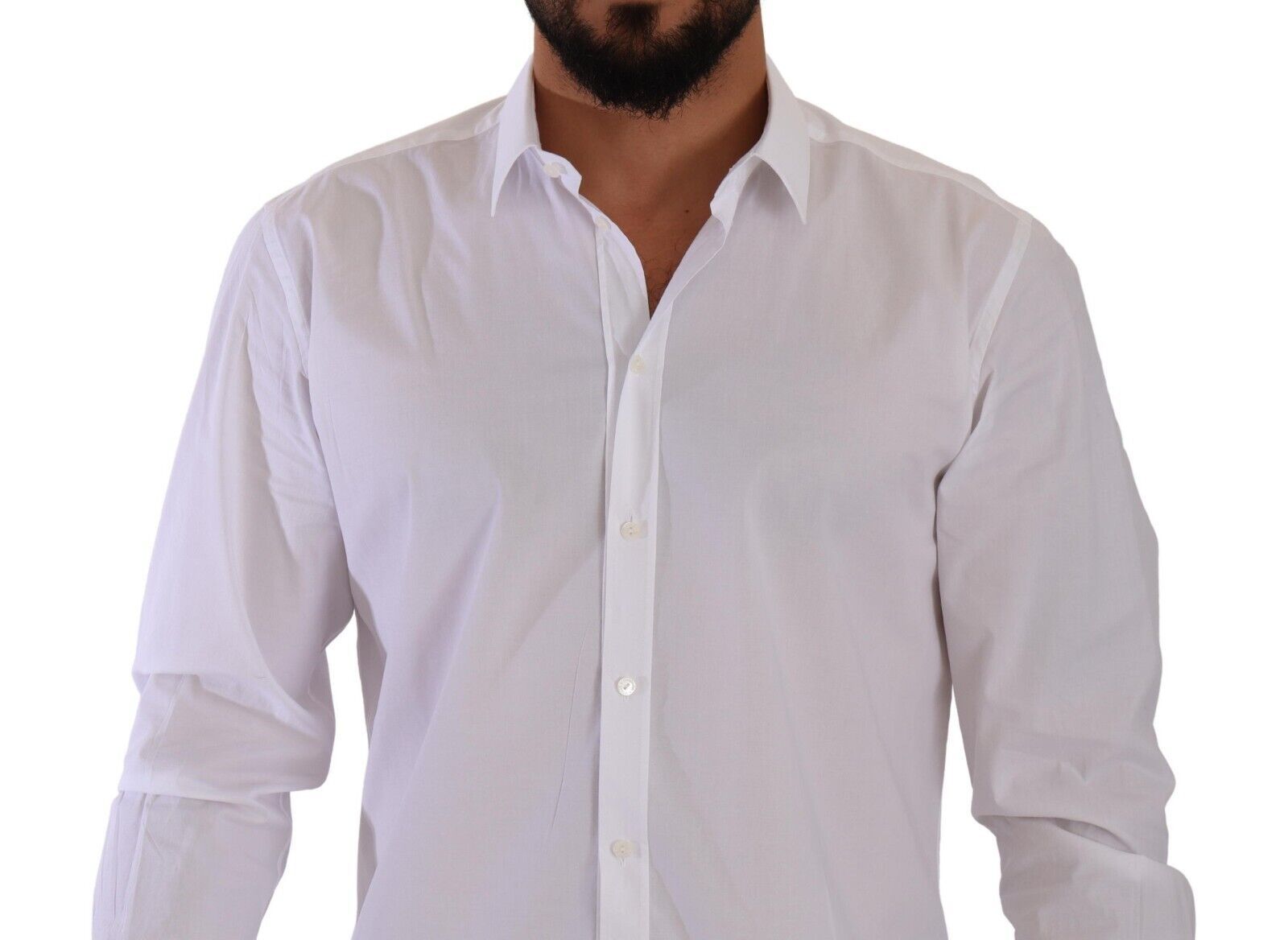 Exude timeless elegance in this pristine White Slim Fit Martini Dress Shirt by Dolce & Gabbana. Crafted from a luxurious blend of 97% cotton and 3% elastane, it promises not only a stunning aesthetic but also comfort and durability. The classic neck and long sleeves define sophistication, while the slim fit cut offers a modern silhouette. Perfect for any formal event or stylish affair, this shirt with front button closure and subtle logo details embodies Italian craftsmanship at its finest.