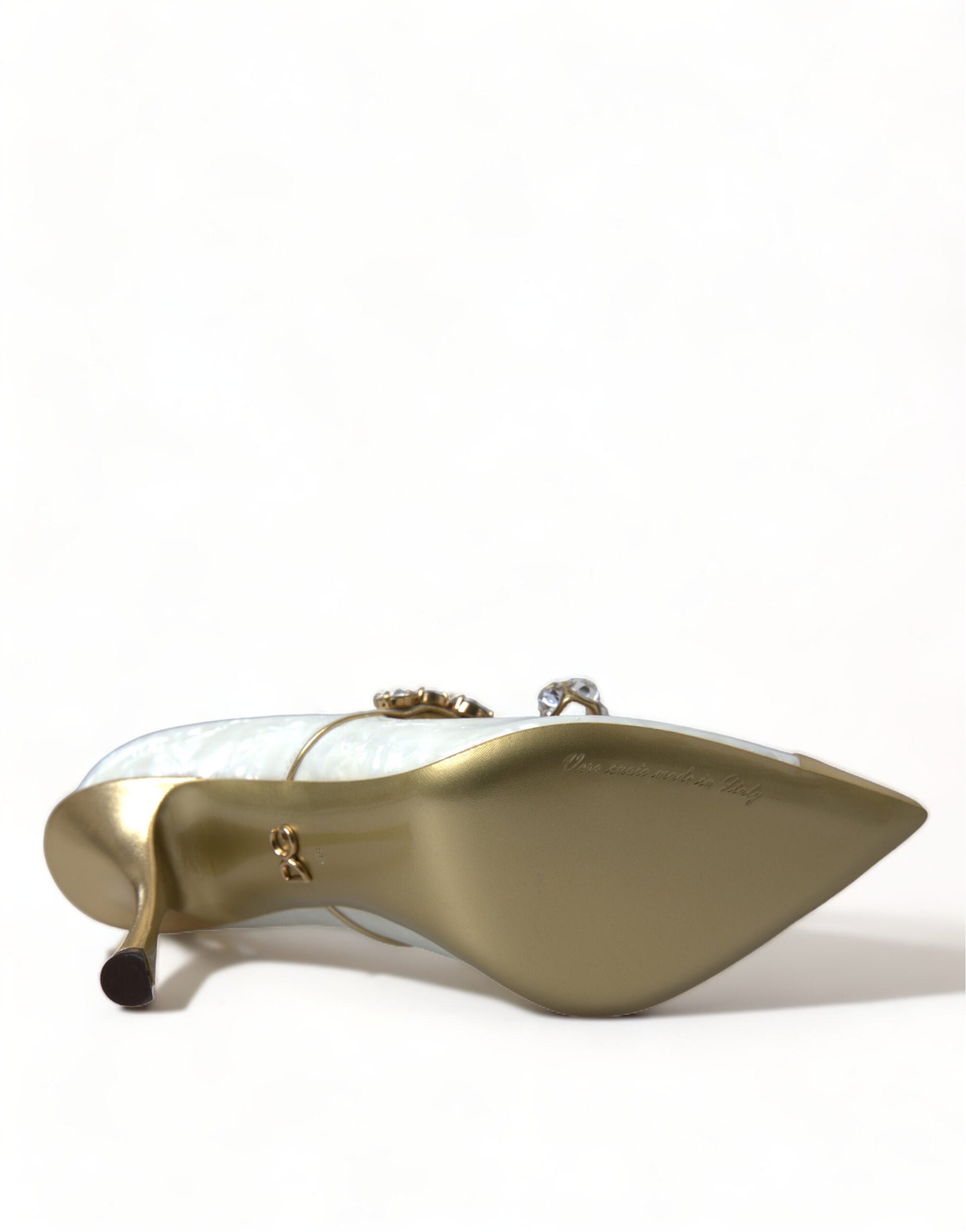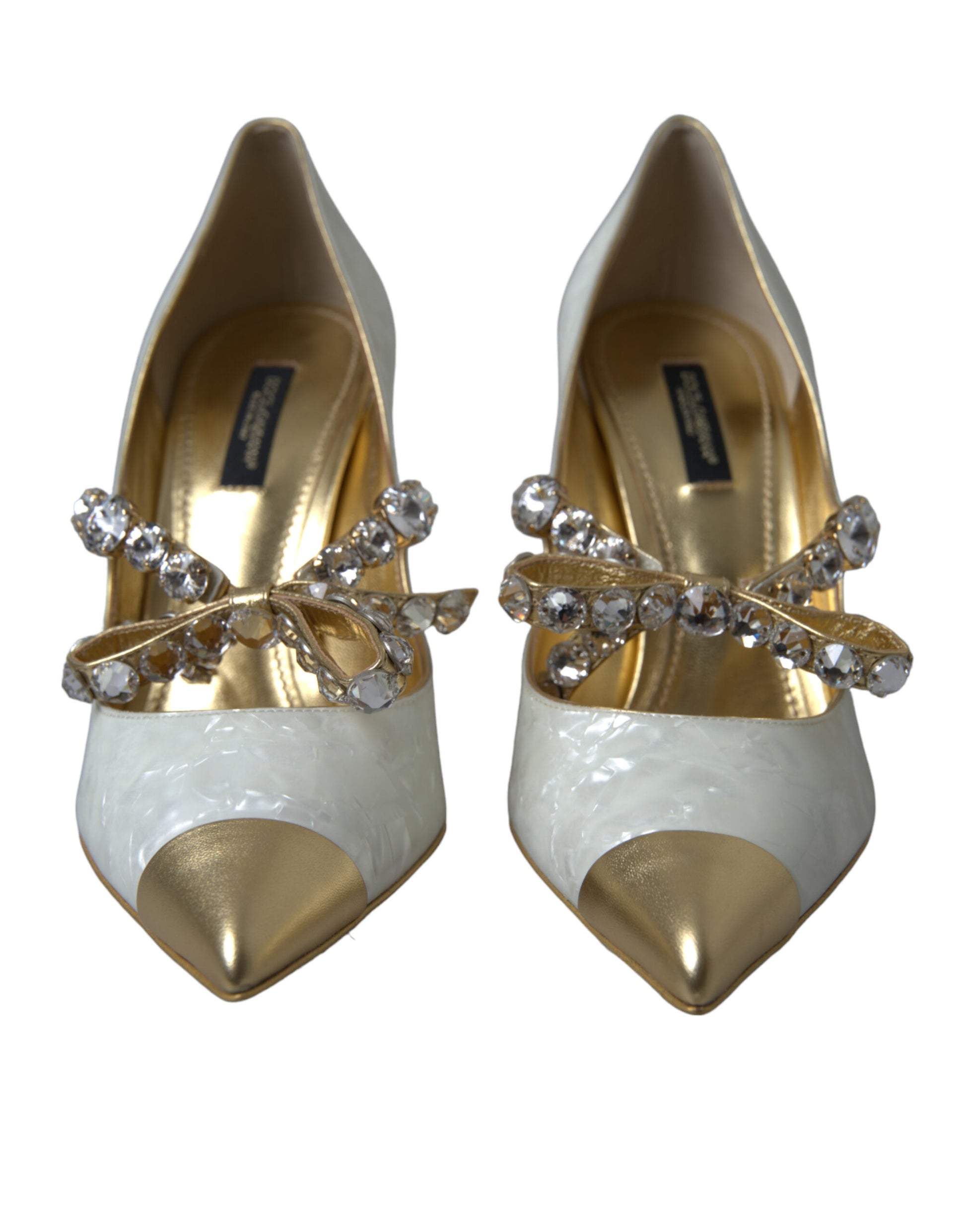 Step into a world of elegance and charm with these Dolce & Gabbana high heel shoes. Exquisitely crafted from patent leather featuring an iridescent finish, these heels are the epitome of luxury. Accented with a golden nappa bow encrusted with sparkling crystals, the design blends classic sophistication with a touch of glamour. Perfect for making a striking statement at any upscale event.