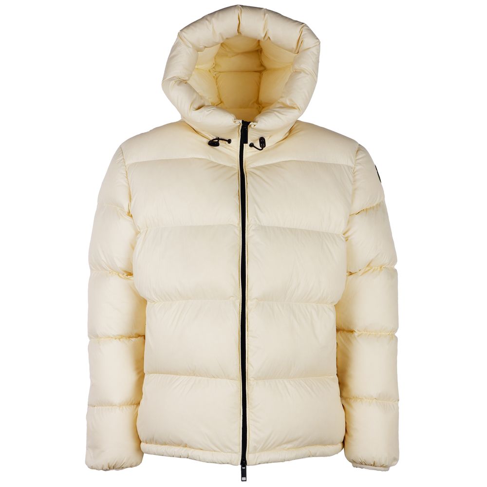 Wrap yourself in sophistication with Centogrammi’s cream white puffer jacket, a standout piece from their latest collection. Perfectly crafted for cool weather, this luxurious jacket combines functionality with high fashion. Enjoy the warmth of duck down padding while the convenient hood with drawstring keeps you snug. A zip closure ensures a sleek silhouette, and two zippered side pockets, along with an internal cell phone pocket, offer practical storage options.