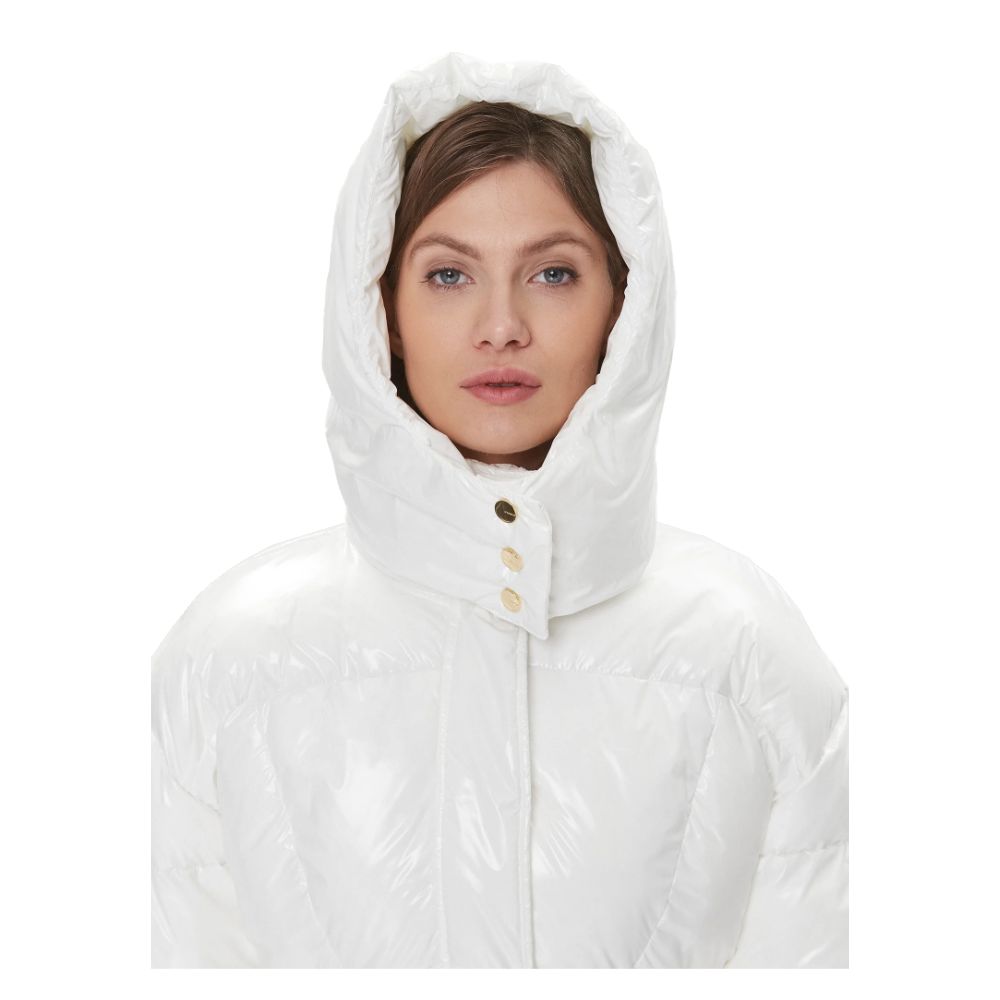 Pinko long padded down jacket in crystal nylon fabric, with a particular shiny, almost vinyl finish. Hooded collar, long low-set sleeves and bustier-style insert at the waist that tightens the volume. Lined. Covered zip closure and press studs on the hood.