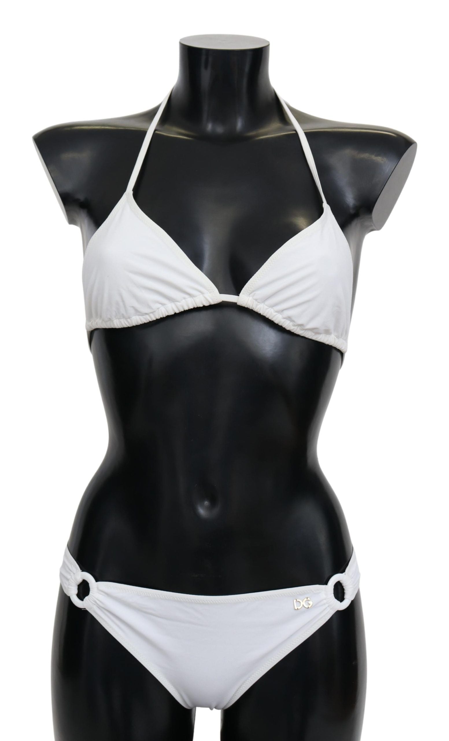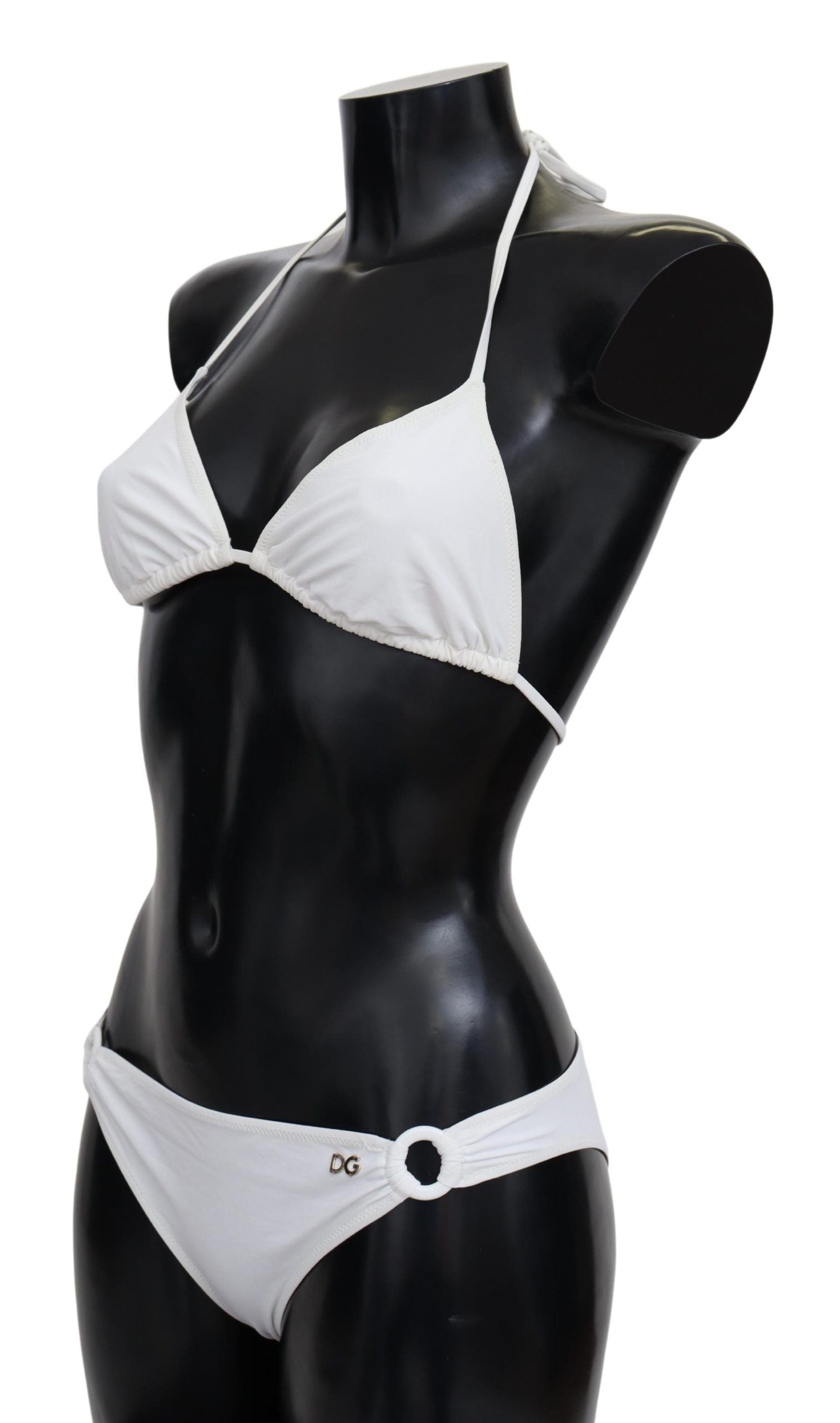 Step into summer with elegance in this pristine white two-piece bikini set by Dolce & Gabbana. Whether lounging by the pool or enjoying a day at the beach, this bikini promises comfort with its high-quality blend of nylon and elastane. Exquisitely crafted in Italy, it features subtle logo detailing, adding a touch of luxury to your swimwear collection.