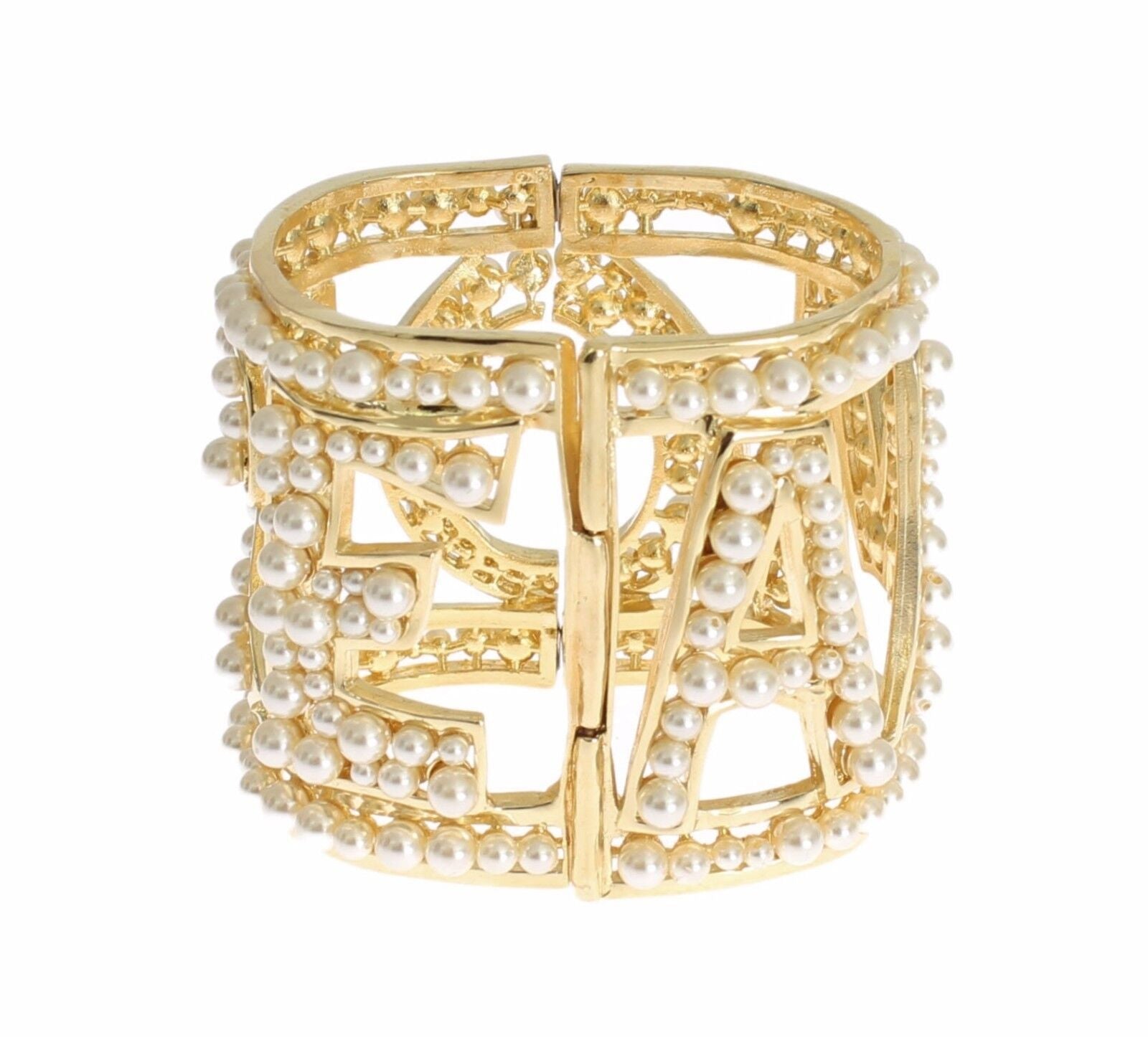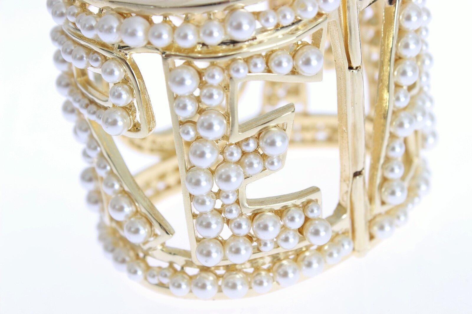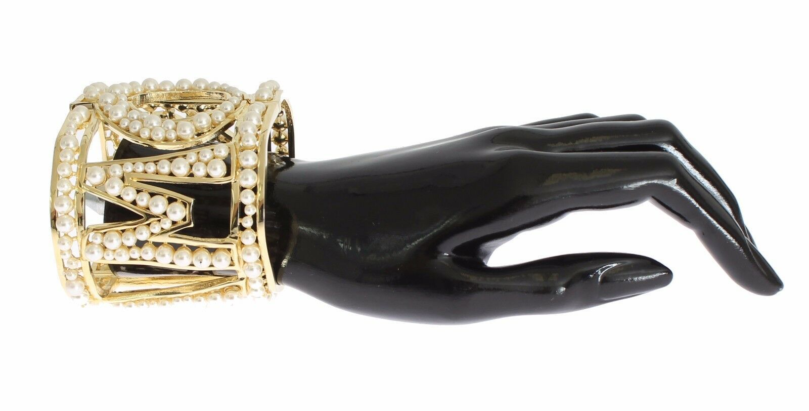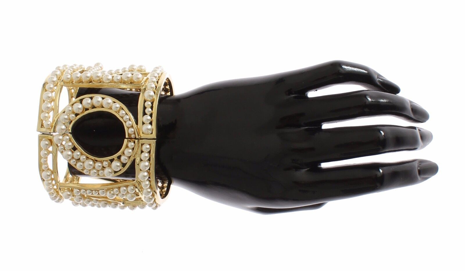Discover the epitome of Italian elegance with this stunning Dolce & Gabbana bangle, crafted to perfection with lustrous white pearls and sparkling crystals set against a luxurious gold-tone brass framework. This statement piece is the perfect blend of modern glamour and timeless sophistication, designed to add a touch of Dolce & Gabbana’s signature opulence to your ensemble.