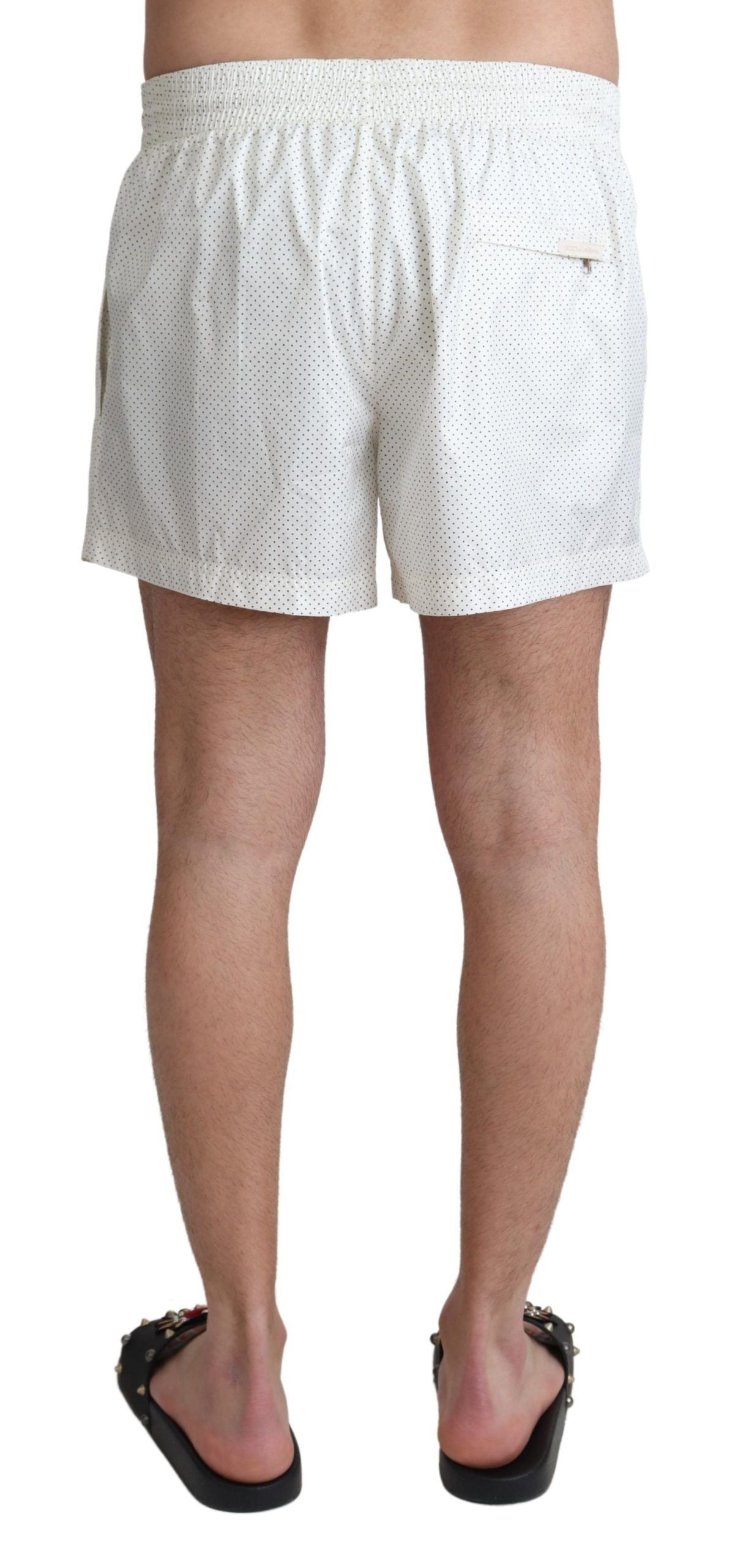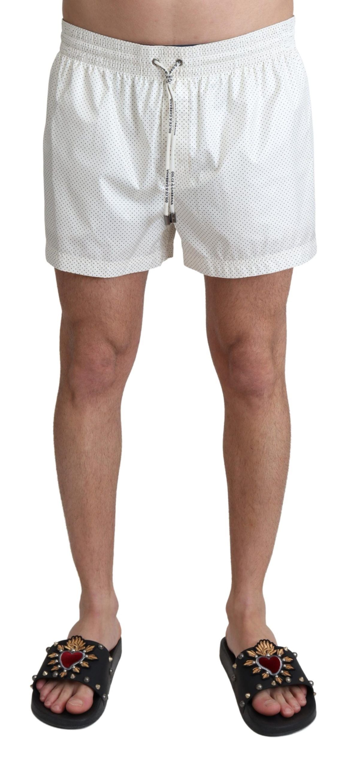 Make a splash in style with these elegant white swimming trunks from Dolce & Gabbana. Perfect for the fashion-forward gentleman, these trunks offer a luxurious beachwear experience with a sophisticated polka dot detail and a secure drawstring tie fastening for the ideal fit. Practicality is not compromised with two front pockets and a zippered back pocket. The high-quality polyester material ensures durability and quick-drying properties, making them an essential for any poolside or beach occasion.