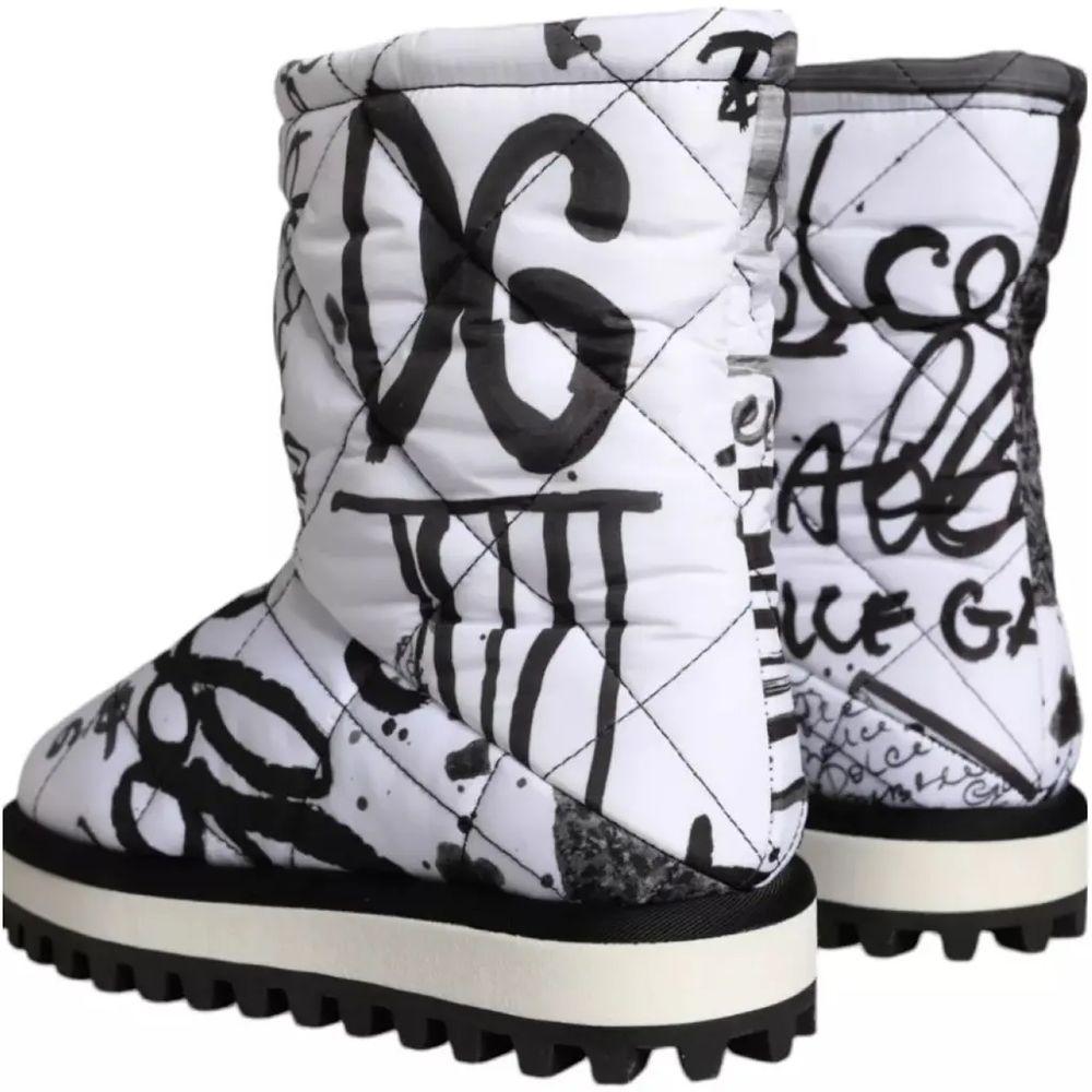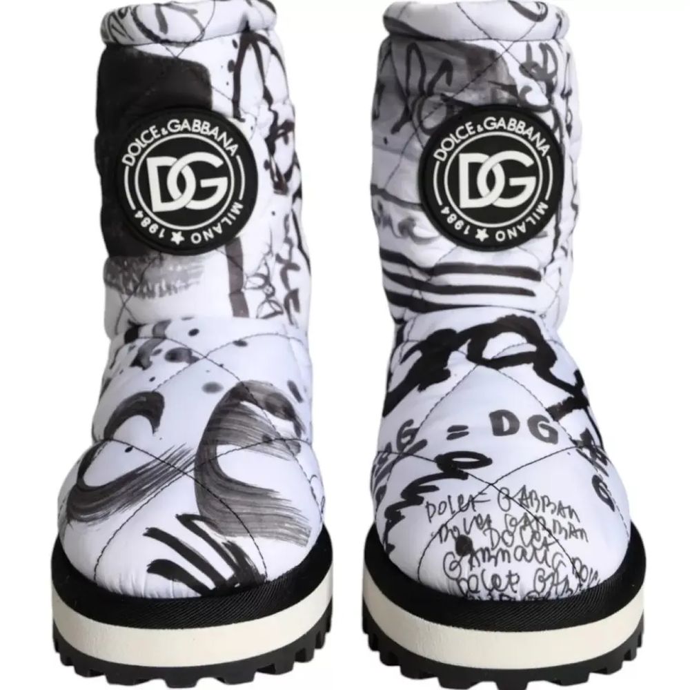 Dolce & Gabbana padded ankle boots. Black and white patterned print, front logo and non-slip rubber sole. Made in Italy.
