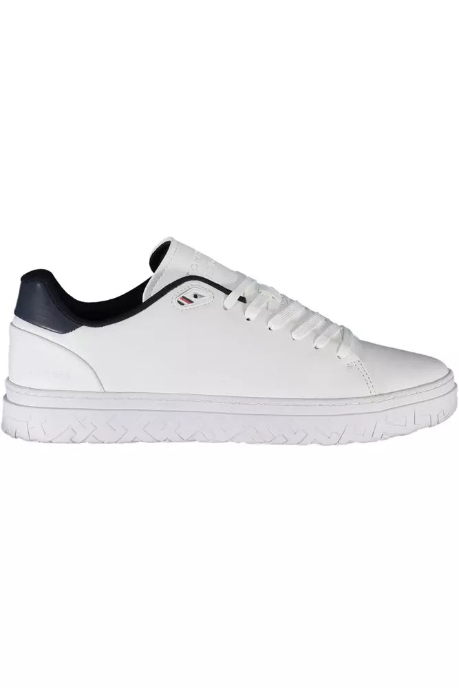Step into sustainable style with Tommy Hilfiger’s latest sneaker exhibit. Perfect for the eco-conscious fashionista, these lace-up sports shoes flaunt a dynamic mix of white polyester and leather accented by bold, contrasting details. Proudly showcasing the iconic logo, each stride reflects both your sophisticated taste and commitment to the environment, crafted from 100% recycled materials. Walk the talk with these sneakers, where trendsetting design meets eco-friendly innovation.