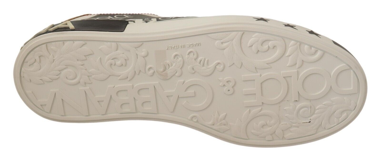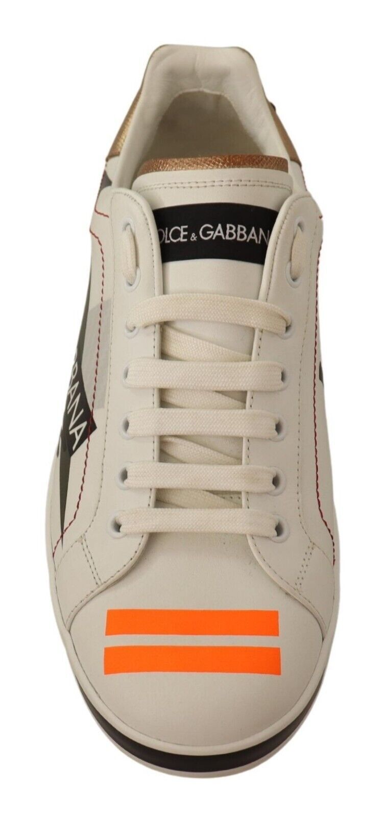 Step into high fashion with these stunning Portofino sneakers by Dolce & Gabbana. Exquisitely crafted from premium leather, these sneakers boast a bold white base juxtaposed with vivid, cubism-inspired geometric shapes and edgy black graffiti details. Gold-tone accents gleam at the heel, adding a touch of luxury. Designed for everyday elegance, they’re a perfect blend of comfort and style.